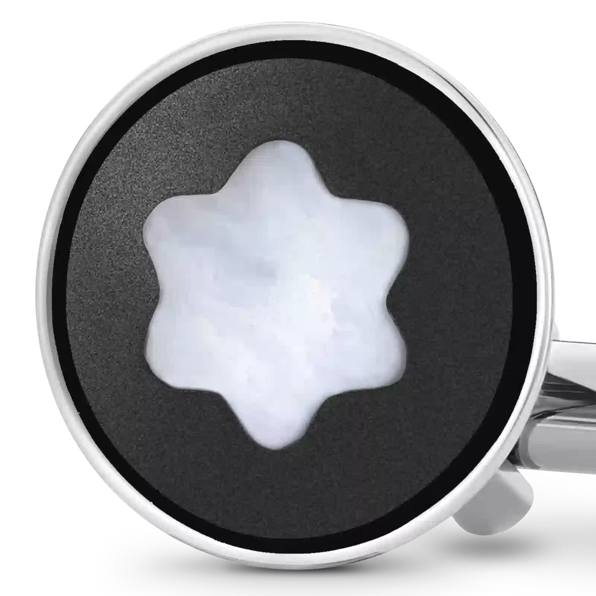 Les boutons de manchette ronds Montblanc Star en acier inoxydable avec incrustation en PVD noir et emblème en nacre représentant un sommet enneigé s’inspirent des codes de la Maison. Une collection qui présente l’emblème Montblanc sous différentes interprétations.