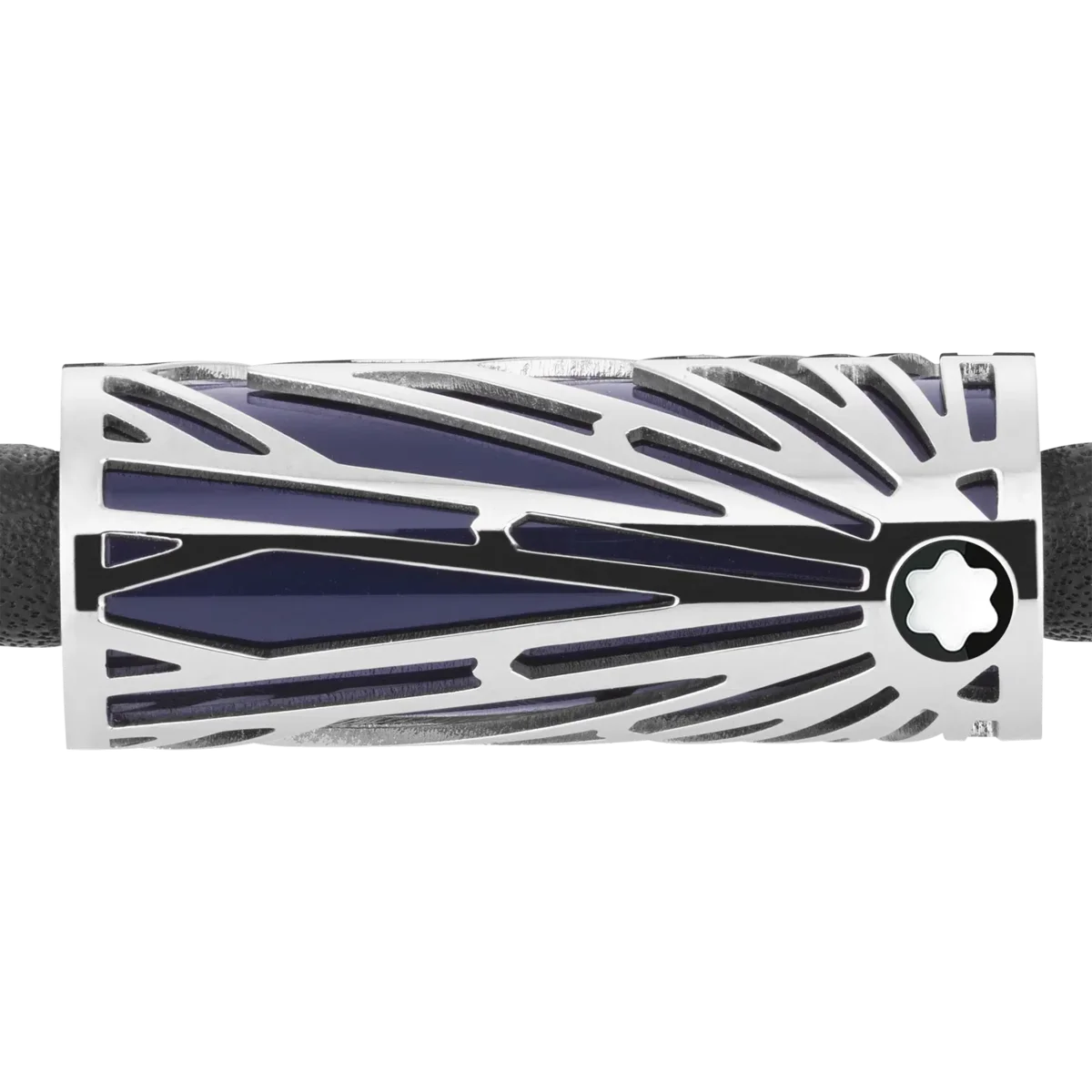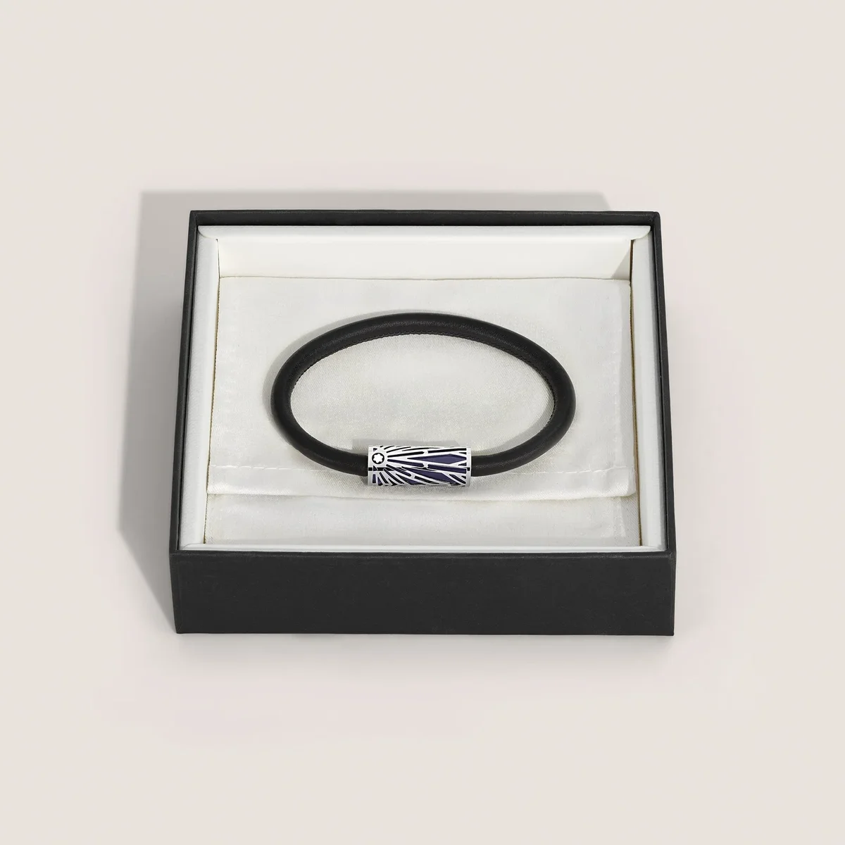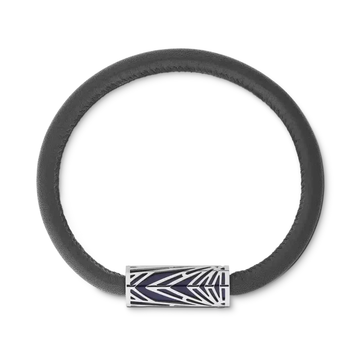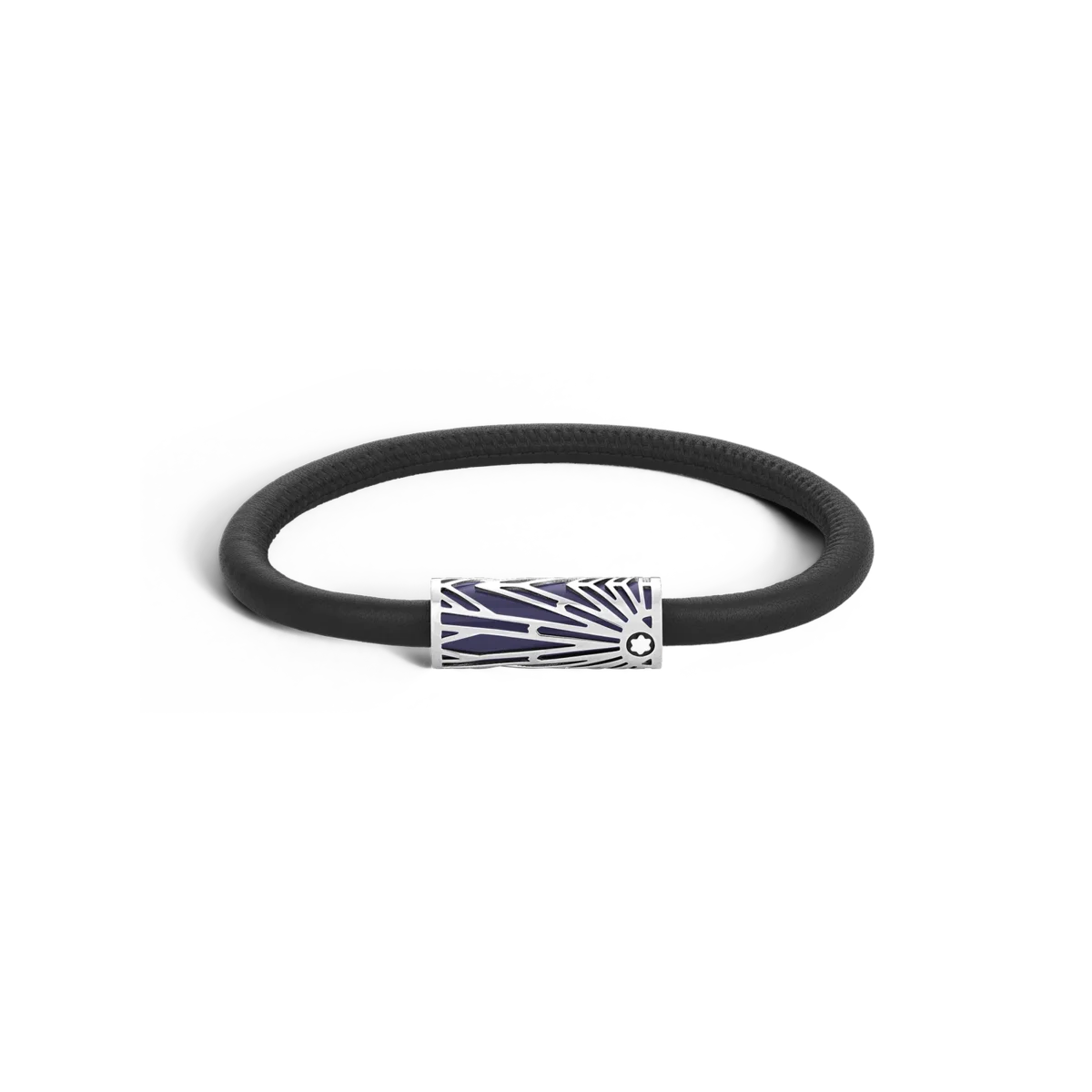 Ce bijou est composé d’un bracelet en cuir noir et d’un tube en acier inoxydable avec revêtement PVD et laque bleue (taille 68). Il s’inspire du motif Solitaire des archives.