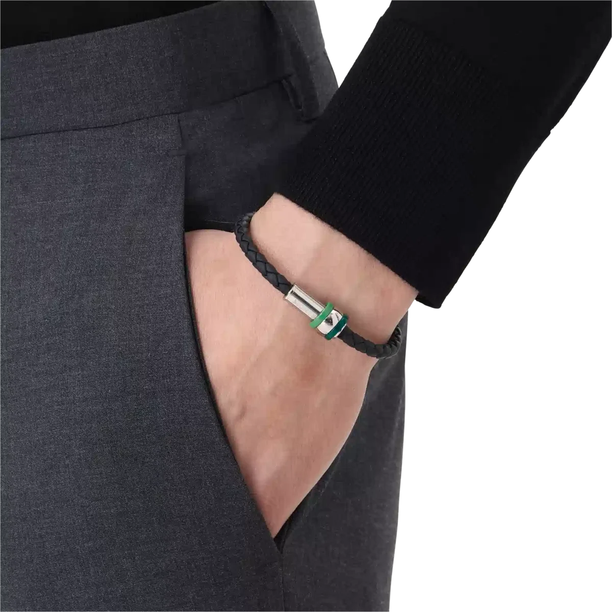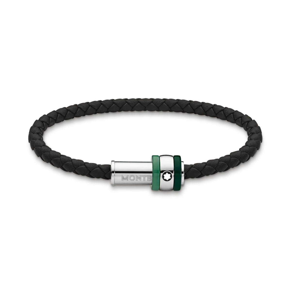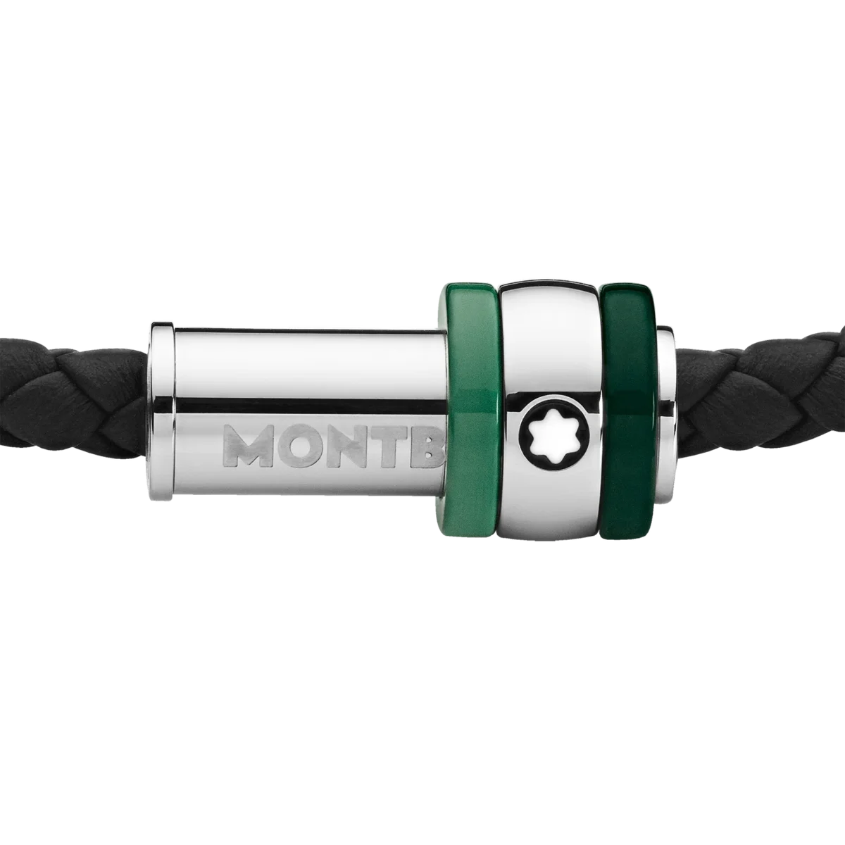 Ce bijou, tissé en cuir noir, est doté d’un fermoir en acier inoxydable poli avec un anneau en acier arborant l’emblème Montblanc et deux anneaux en résine verte.