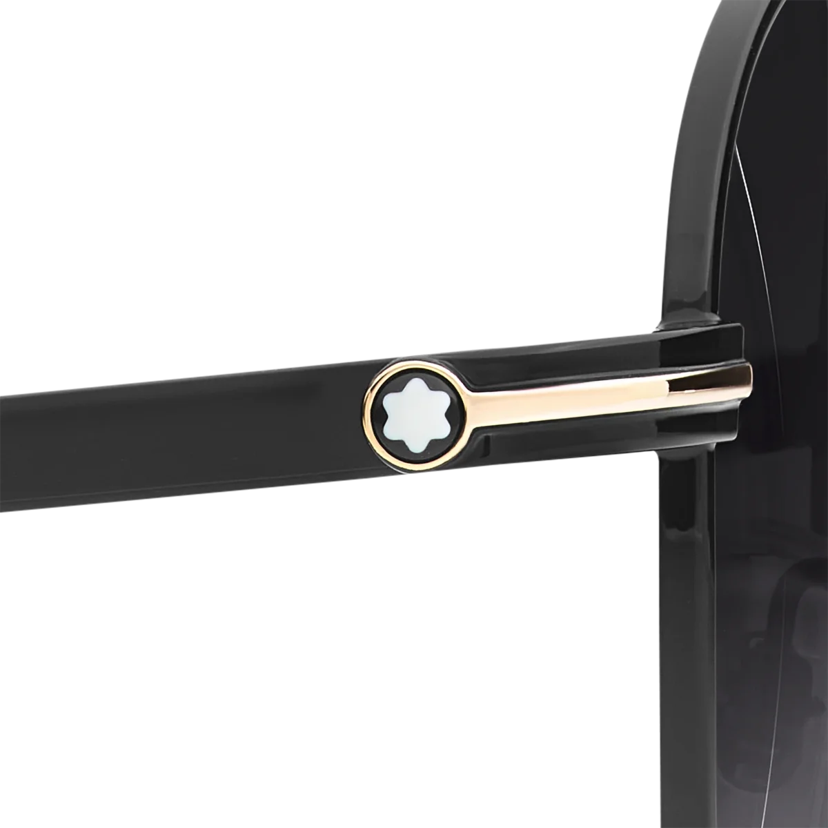 Ces lunettes de soleil de style carré ont une monture en métal noir et des verres gris. Elles présentent un détail à trois anneaux inspiré de la collection Meisterstück, reliant chaque verre à l’emblème Montblanc Snowcap flottant encapsulé dans le design des branches.