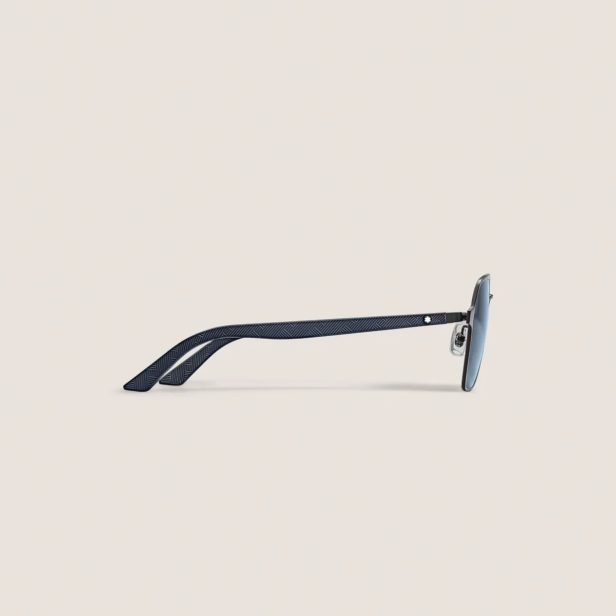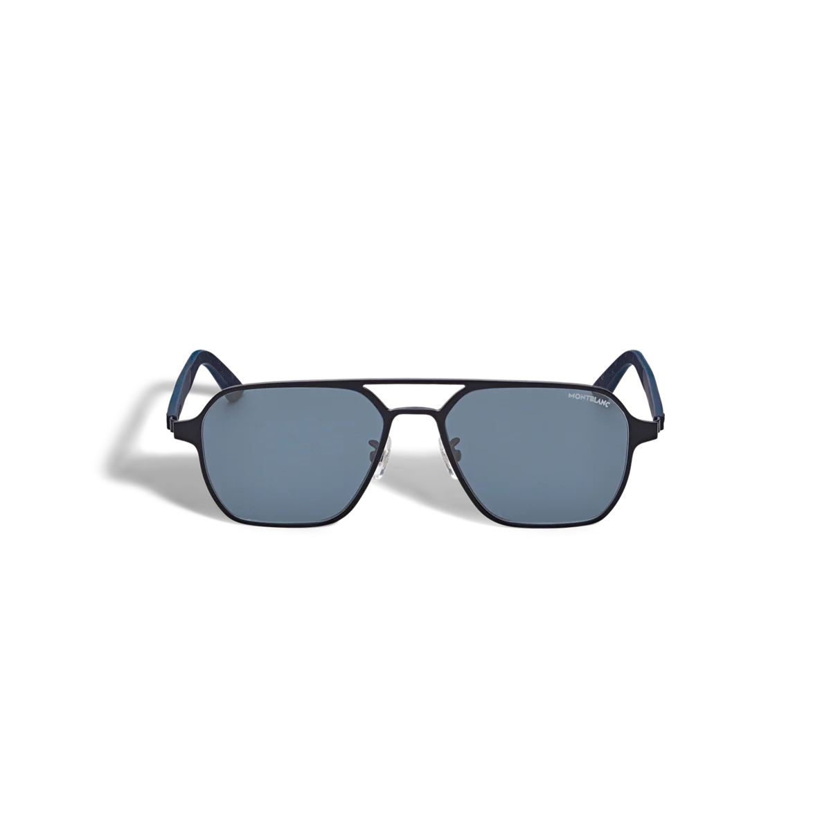 Ces lunettes de soleil de style carré ont une monture en métal noir et des verres bleus. Elles sont dotées d’un double pont métallique à l’avant. L’emblème Montblanc est intégré au design des branches et les embouts sont en caoutchouc avec le motif Montblanc Extreme 3.0 pour un look sportif. Le logo Montblanc est gravé au laser sur le verre gauche des lunettes de soleil.