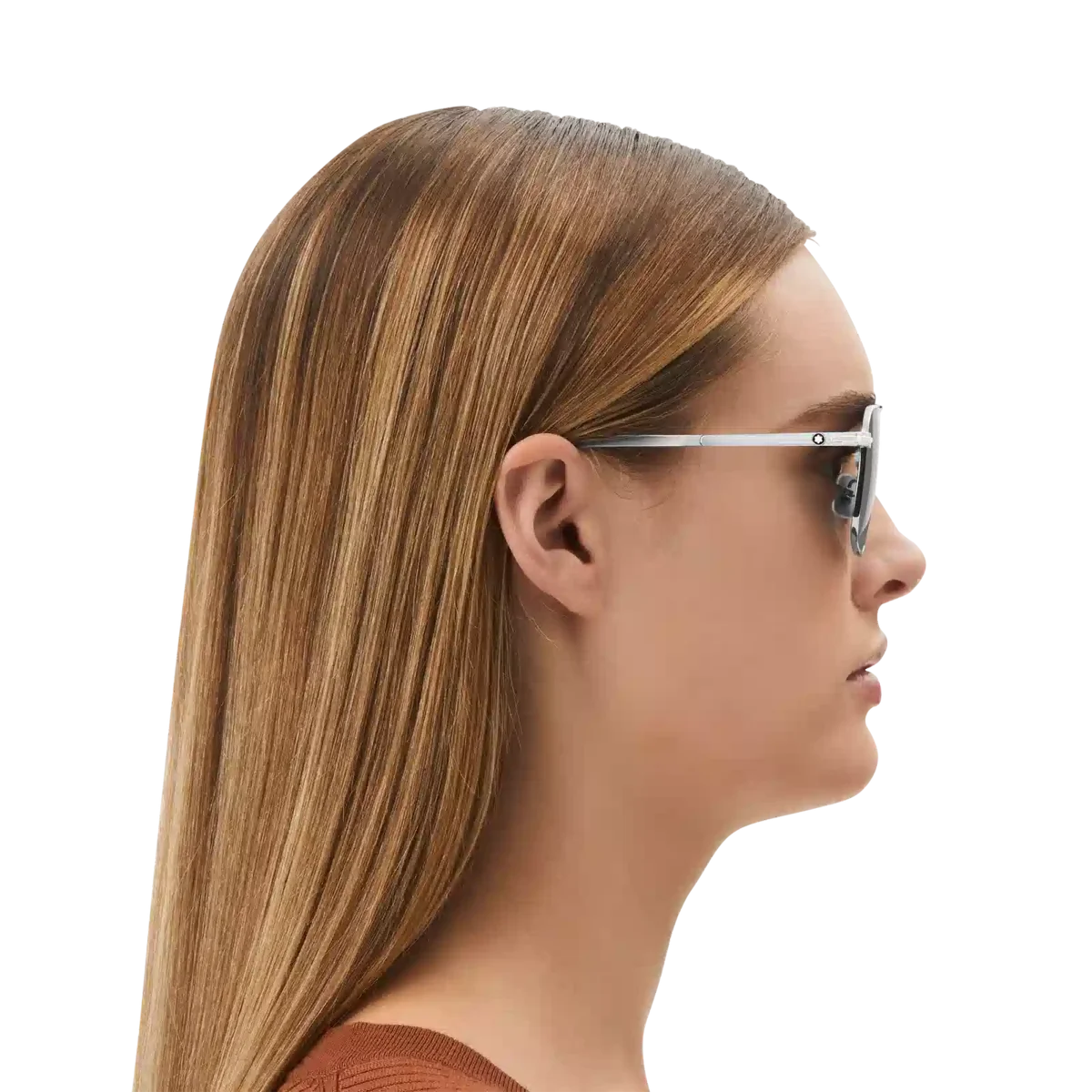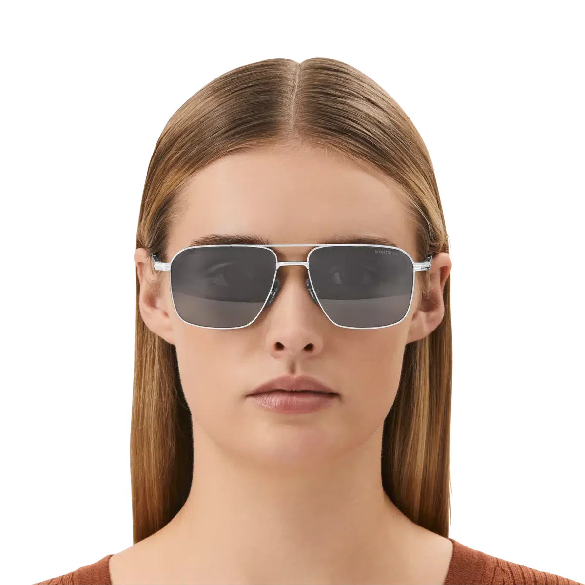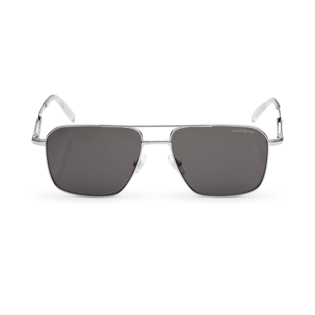 Ces lunettes de soleil de style rectangulaire sont dotées d’une monture métallique argentée et de verres gris. Elles présentent un double pont métallique sur le devant. Le détail argenté en forme de clip est l’élément central du design des branches. Il rend hommage à un élément important de l’instrument d’écriture Meisterstück, qui permet également d’accrocher la monture à une poche. L’emblème Montblanc enneigé est incrusté dans le détail en forme de clip des branches et le logo Montblanc est gravé au laser sur le verre gauche.