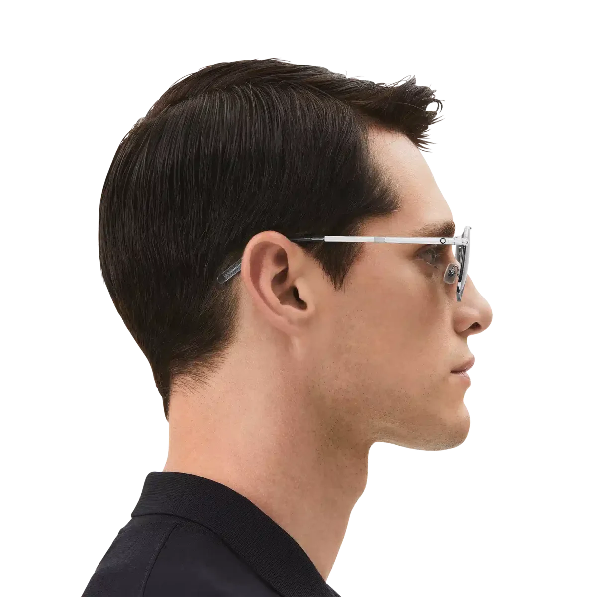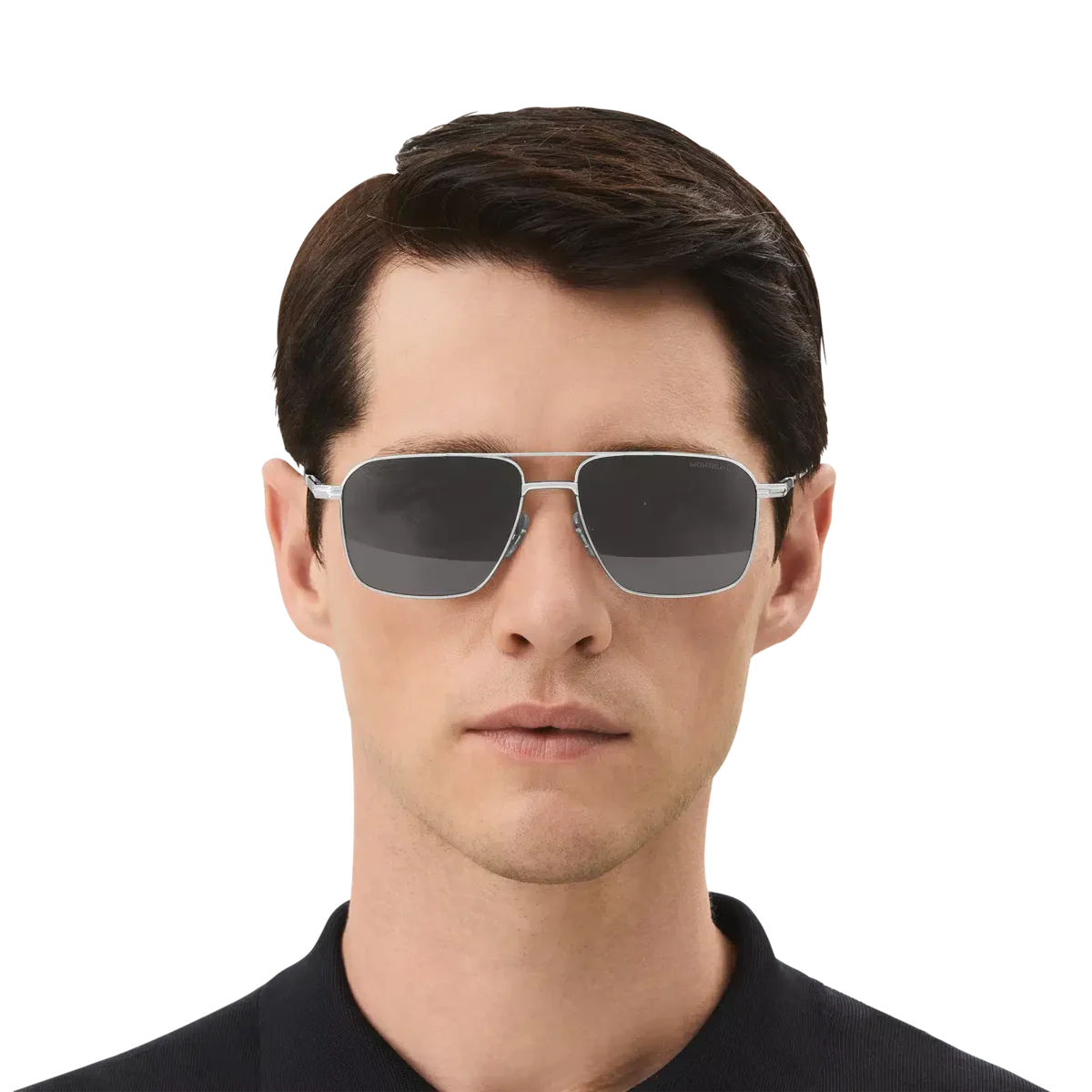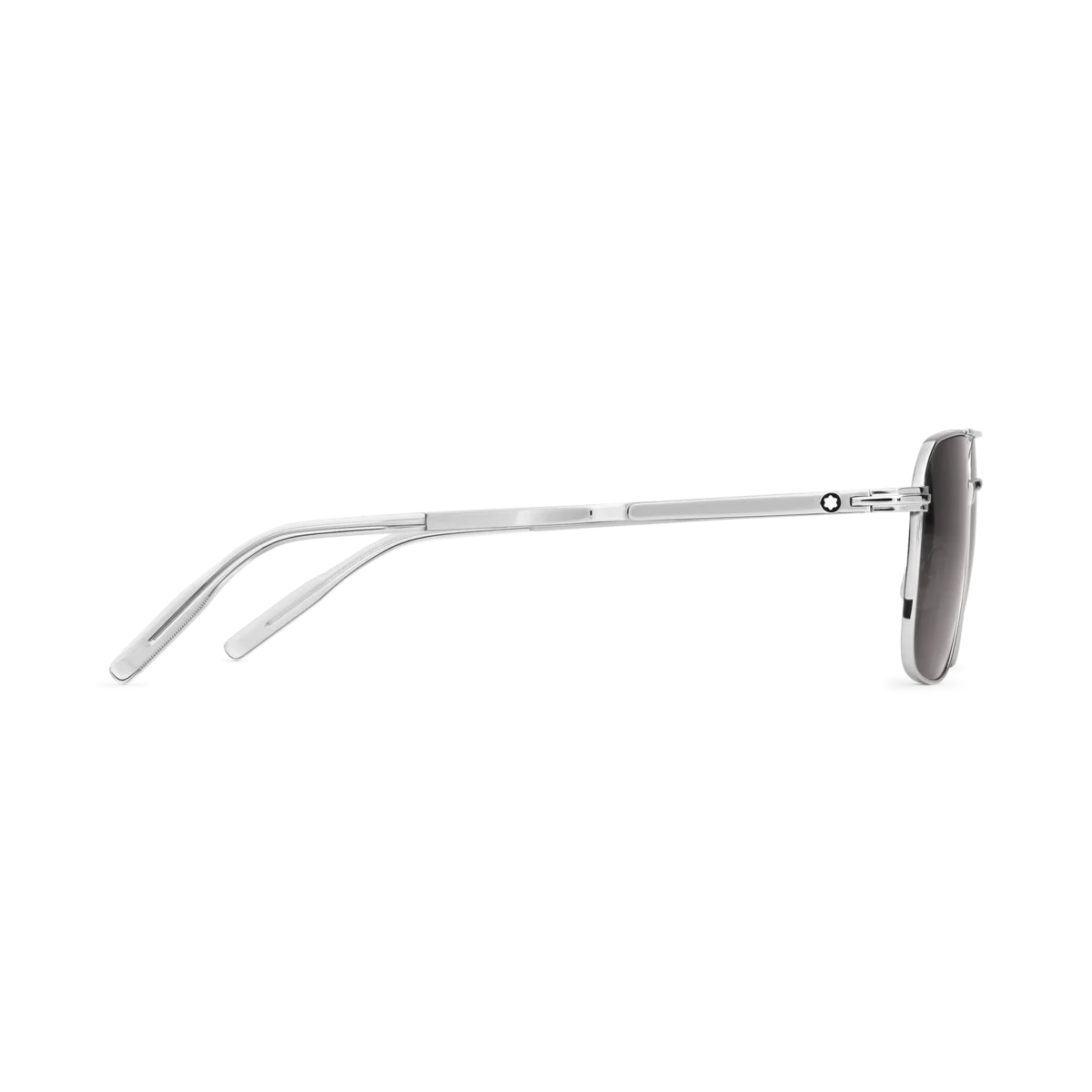 Ces lunettes de soleil de style rectangulaire sont dotées d’une monture métallique argentée et de verres gris. Elles présentent un double pont métallique sur le devant. Le détail argenté en forme de clip est l’élément central du design des branches. Il rend hommage à un élément important de l’instrument d’écriture Meisterstück, qui permet également d’accrocher la monture à une poche. L’emblème Montblanc enneigé est incrusté dans le détail en forme de clip des branches et le logo Montblanc est gravé au laser sur le verre gauche.