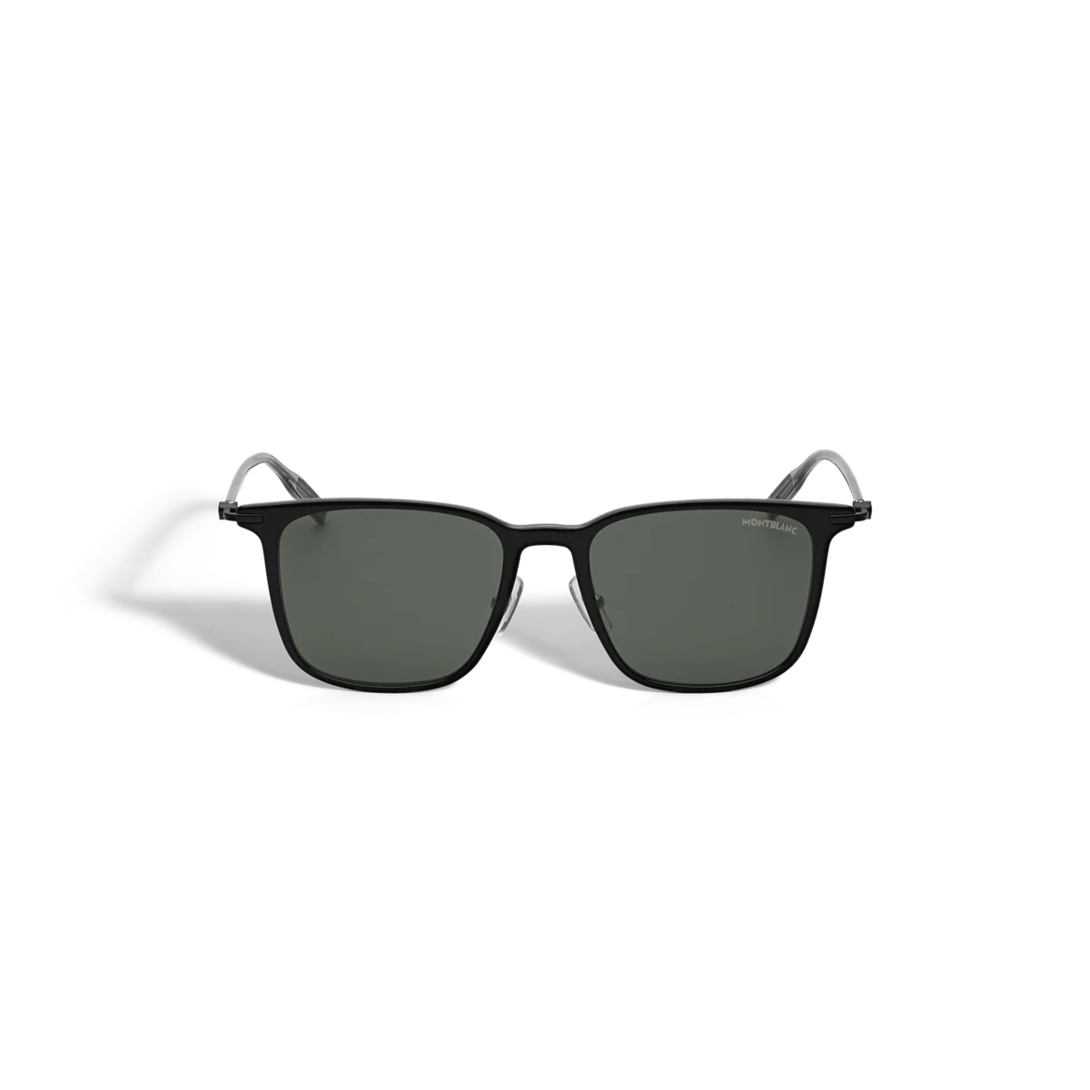 Ces lunettes de soleil de style rectangulaire ont une monture injectée de couleur noire et des verres gris. L’emblème Montblanc en forme de calotte glaciaire est encapsulé dans le design métallique des branches. Le logo Montblanc est gravé au laser sur le verre gauche et un motif antidérapant est gravé au laser à l’intérieur des embouts transparents des branches pour plus de confort.
