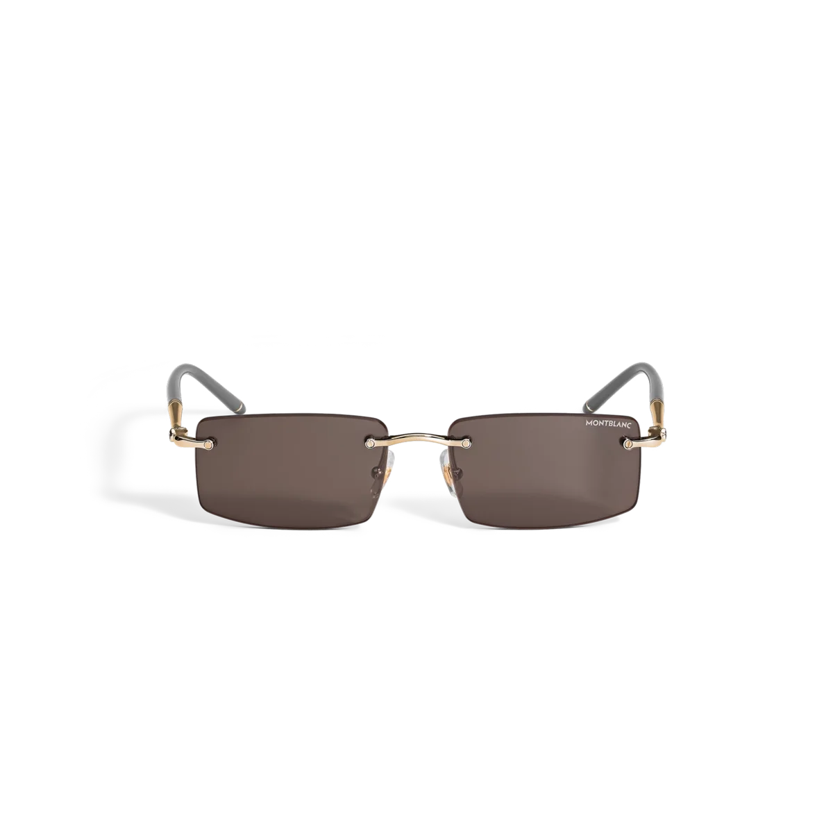 Ces lunettes de soleil sans monture de style carré ont une monture en métal doré et des verres bruns. Les branches tubulaires inspirées des instruments d’écriture Meisterstück sont ornées de trois anneaux. Le logo Montblanc est gravé au laser sur le verre gauche et un détail en émail noir est incrusté sur les extrémités des branches.
