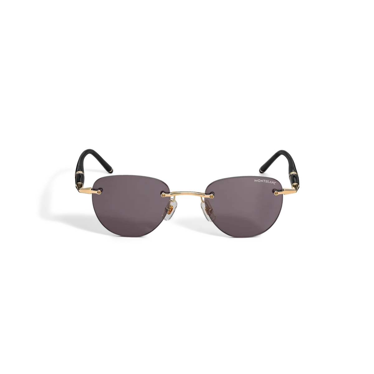 Ces lunettes de soleil rondes sans monture sont dotées d’une monture métallique dorée et de verres gris. Les branches tubulaires inspirées des instruments d’écriture Meisterstück sont ornées du lettrage Montblanc. Le logo Montblanc est gravé au laser sur le verre gauche.