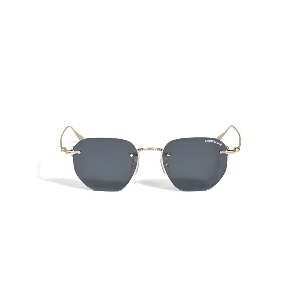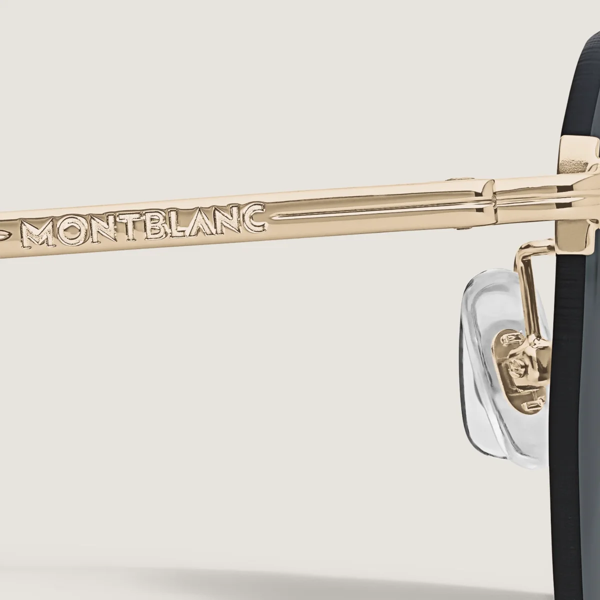 Ces lunettes de soleil de style rond ont une monture en métal doré et des verres gris. Inspiré du design des plumes des instruments d’écriture, un détail décoratif en forme de plume orne le design des branches en métal. Le logo Montblanc one line est gravé sur le côté droit de la branche, tandis que le logo est gravé au laser sur le verre gauche et qu’un détail décoratif est gravé sur les embouts des branches.