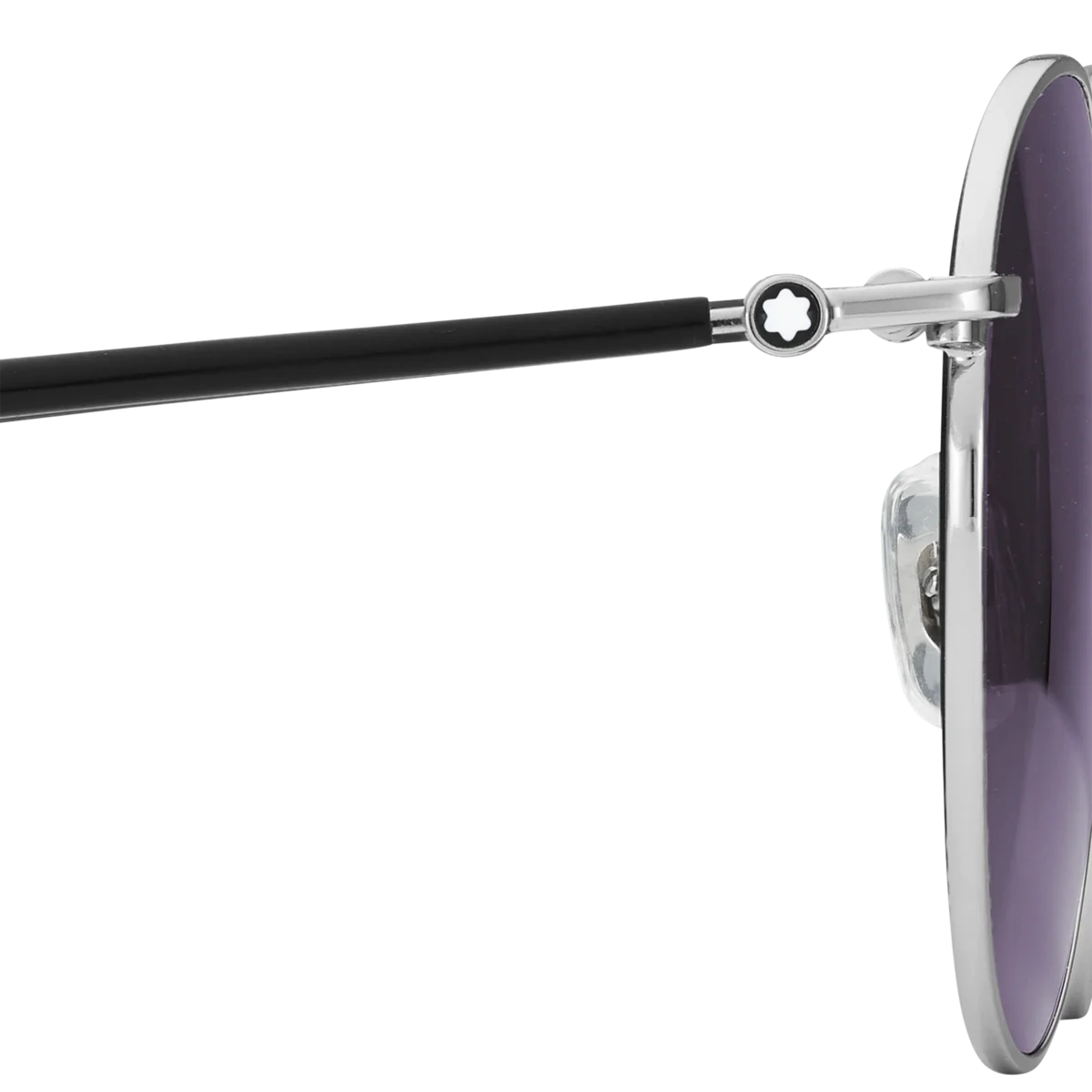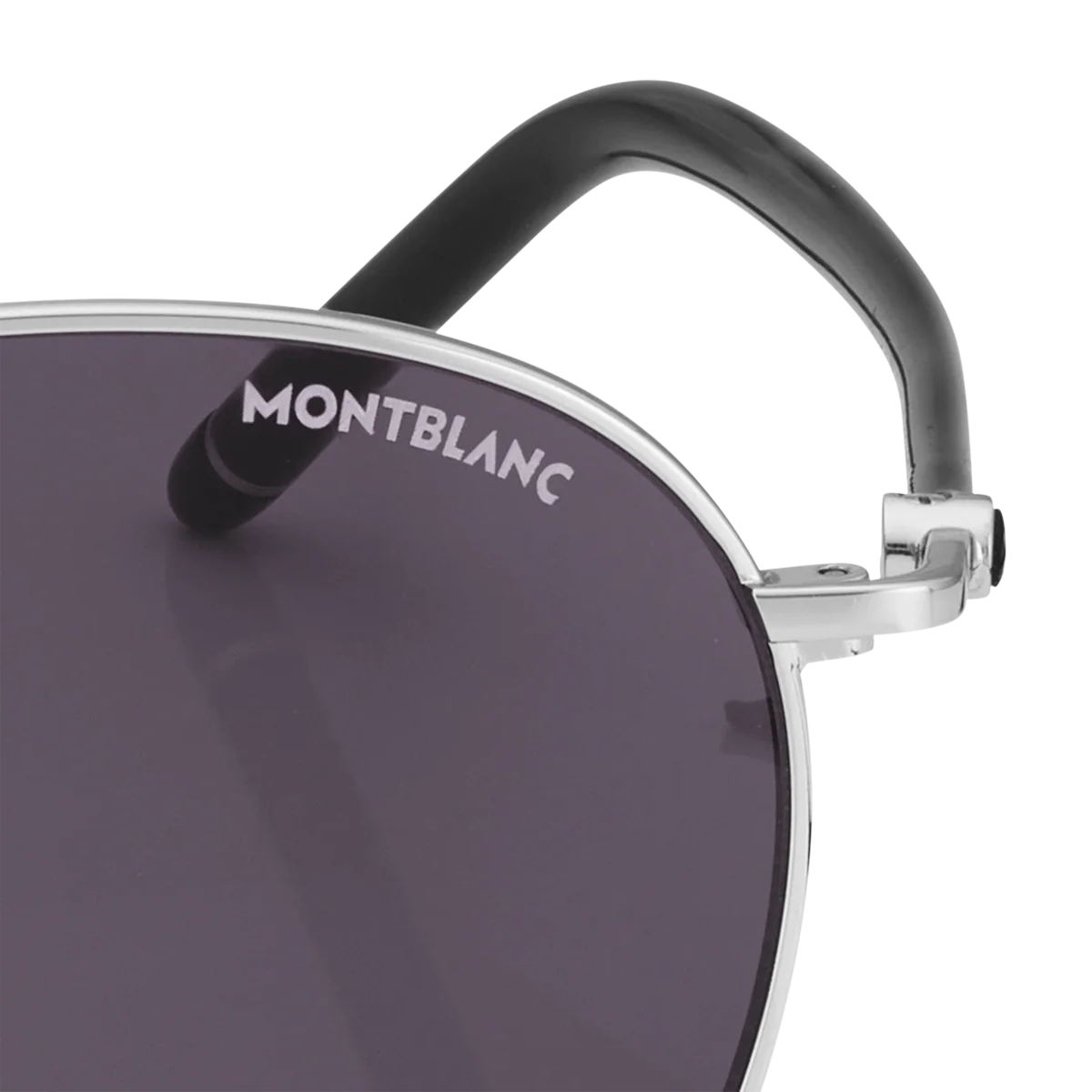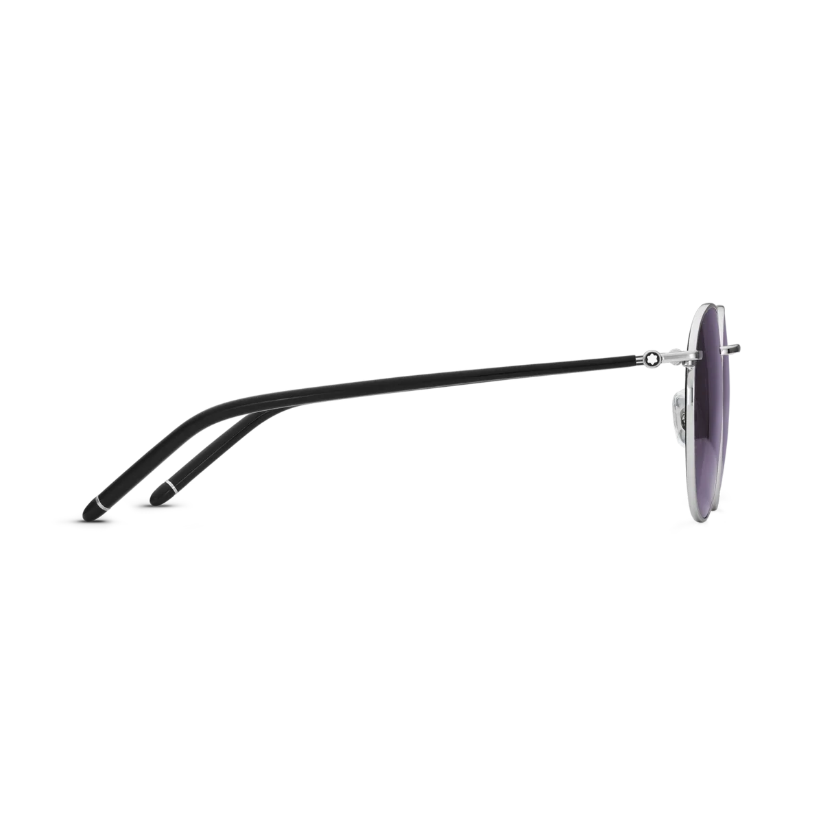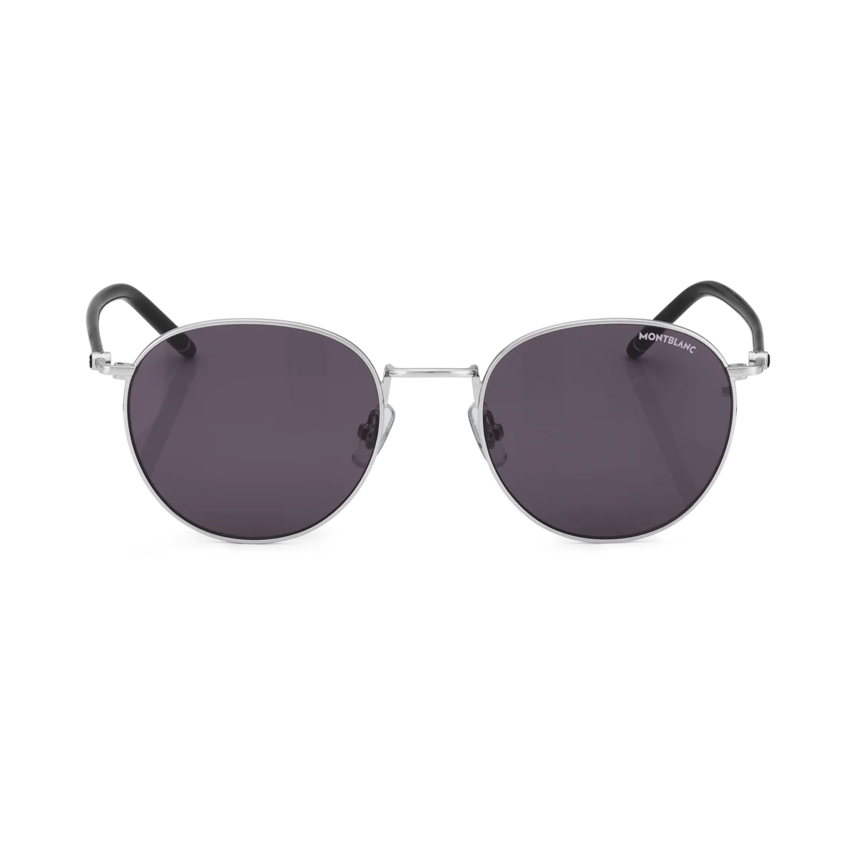 Ces lunettes de soleil rondes sont dotées d’une monture métallique argentée et de verres gris. Les branches tubulaires s’inspirent des instruments d’écriture Meisterstück et sont rehaussées d’un détail en émail noir à l’extrémité. Le logo Montblanc est gravé au laser sur le verre gauche et le logo en forme de calotte neigeuse est incrusté sur la branche.
