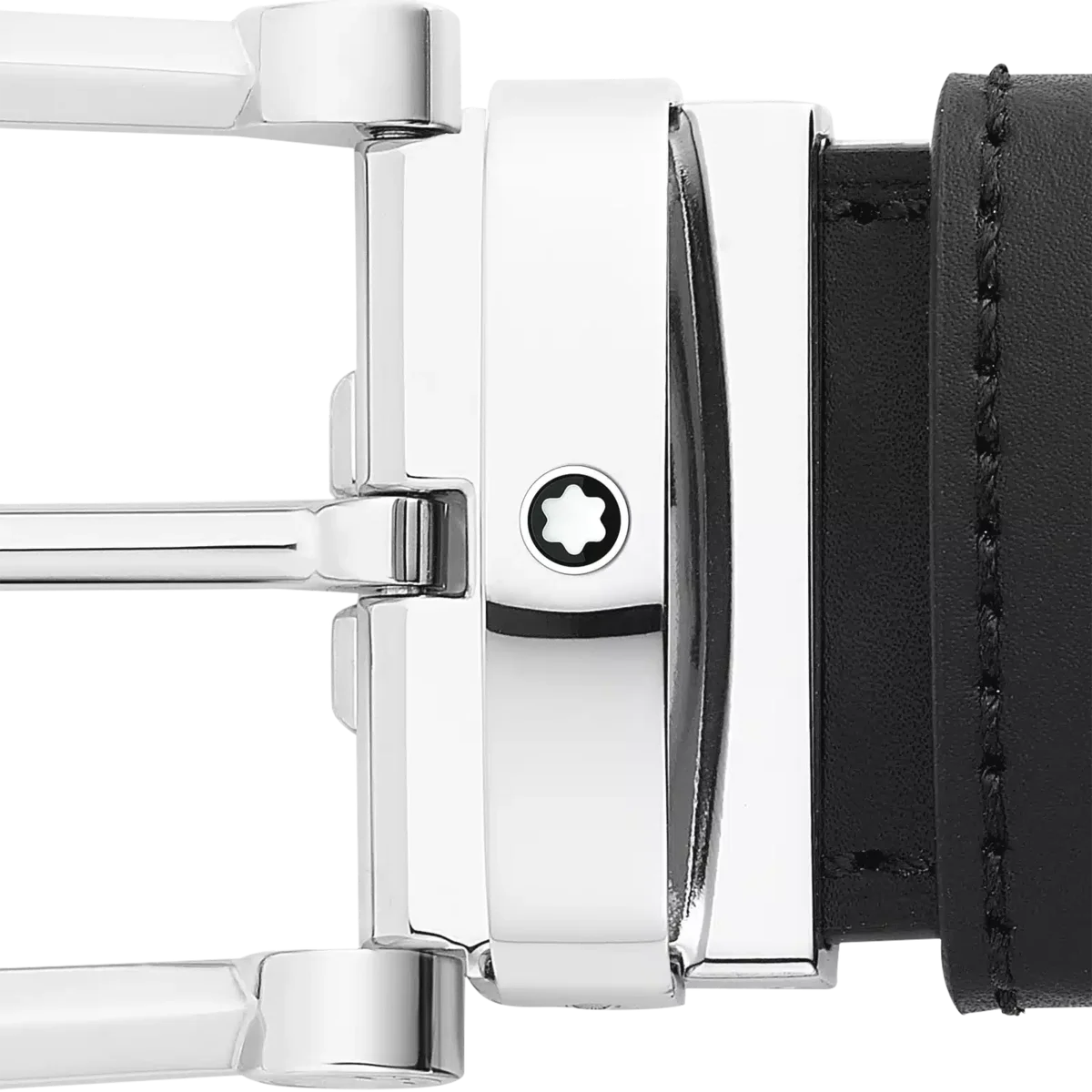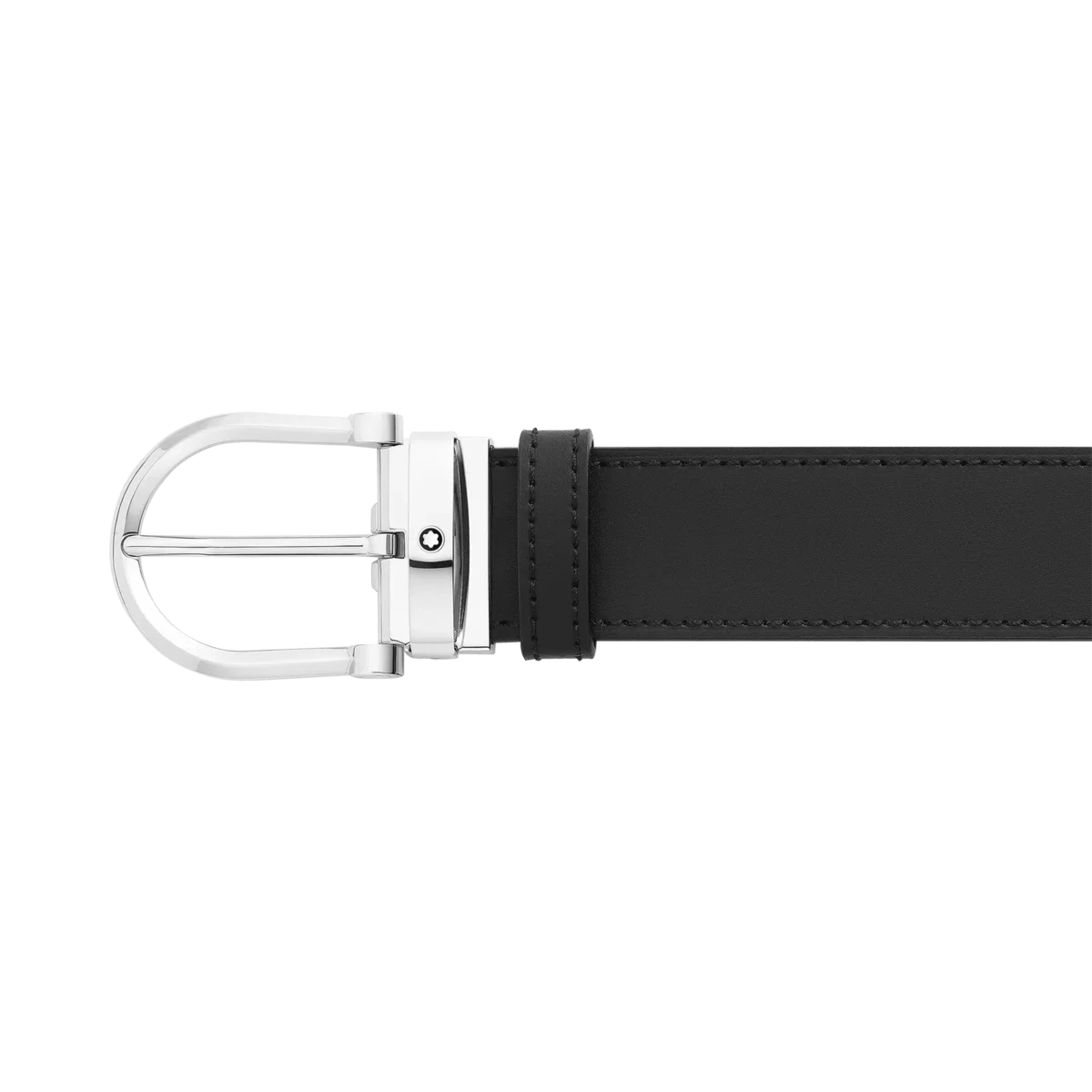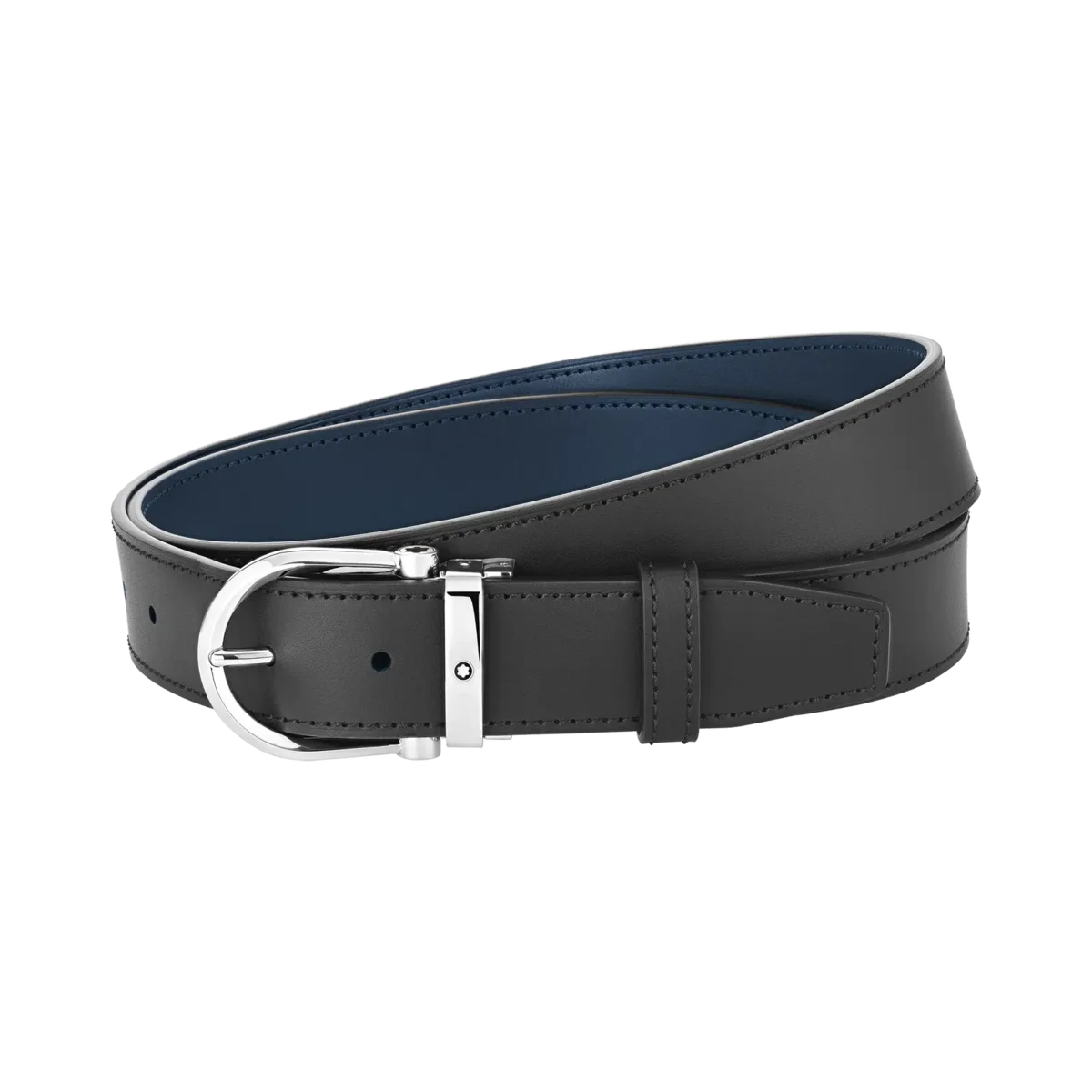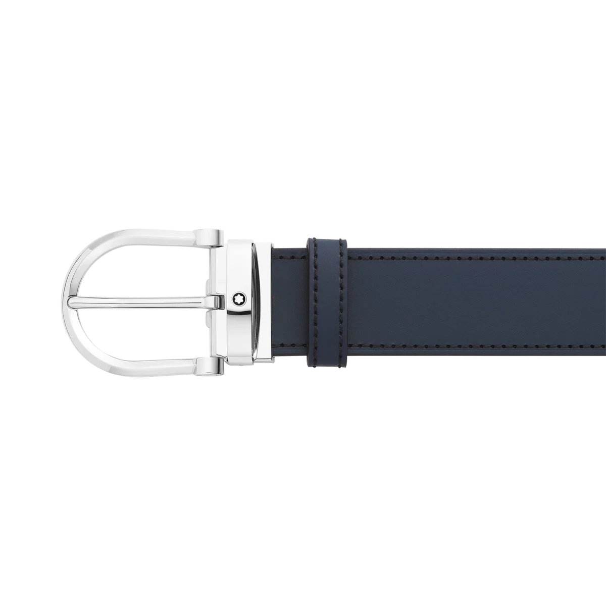 Découvrez tous les détails de la ceinture en cuir réversible à boucle fer à cheval noire/bleue 35 mm. Achetez en ligne sur la boutique officielle Montblanc.