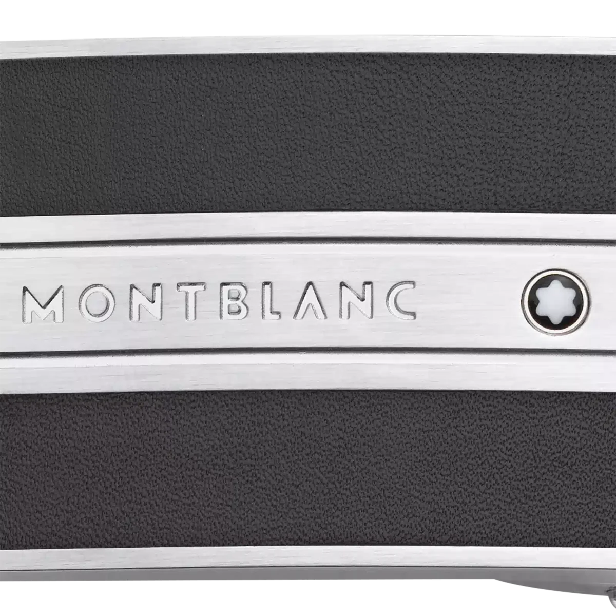 Boucle rectangulaire matte au fini palladium avec motif Meisterstück, nom de marque Montblanc et emblème Montblanc gravés, 3 cm x 120 cm, bracelet réversible en cuir noir et marron. Conçu pour un look à la fois décontracté et élégant.