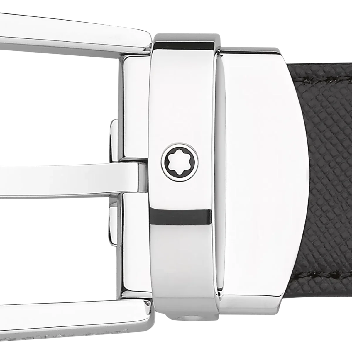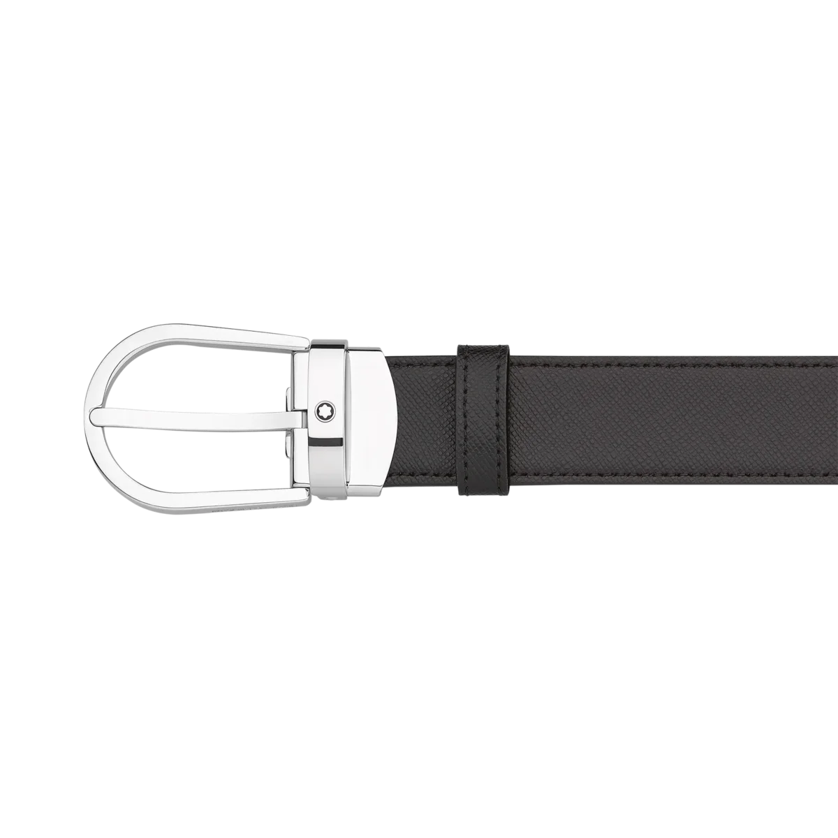 Boucle ardillon en acier inoxydable brillant avec emblème Montblanc. Sangle en cuir noir et marron imprimé saffiano réversible, auto-ajustable, 3 cm x 120 cm.