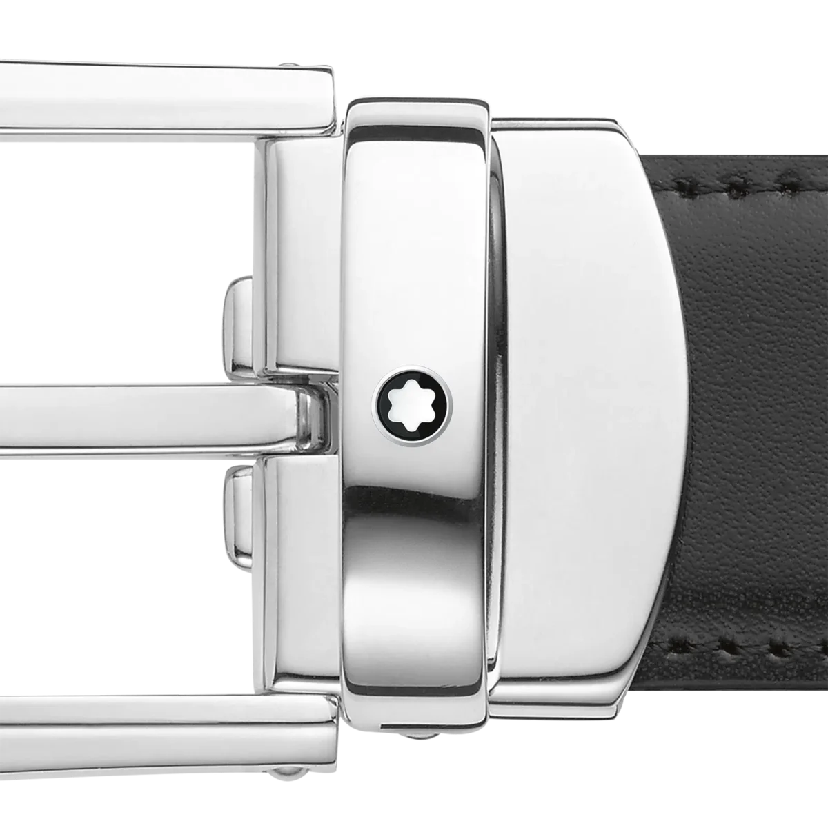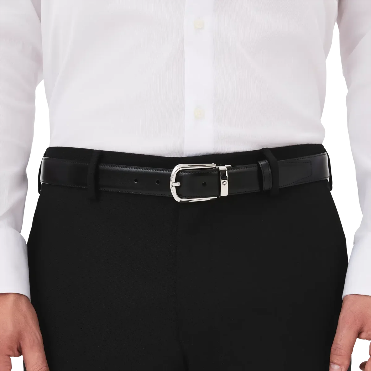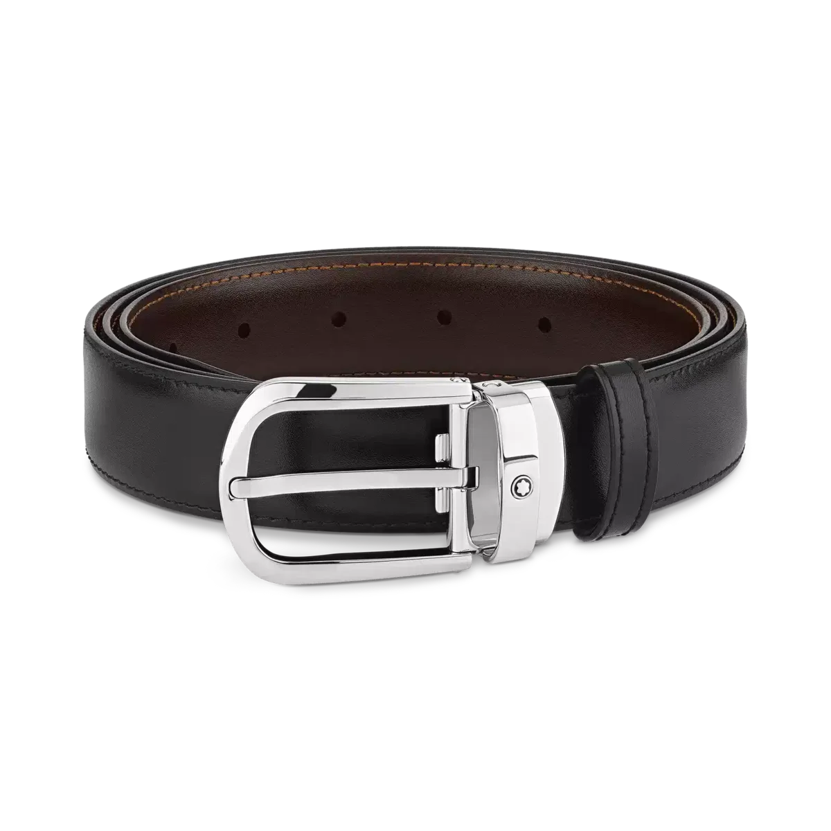Boucle ardillon en acier inoxydable brillant incurvée en forme de fer à cheval. Sangle en cuir noir et marron réversible, auto-ajustable, 3 cm x 120 cm