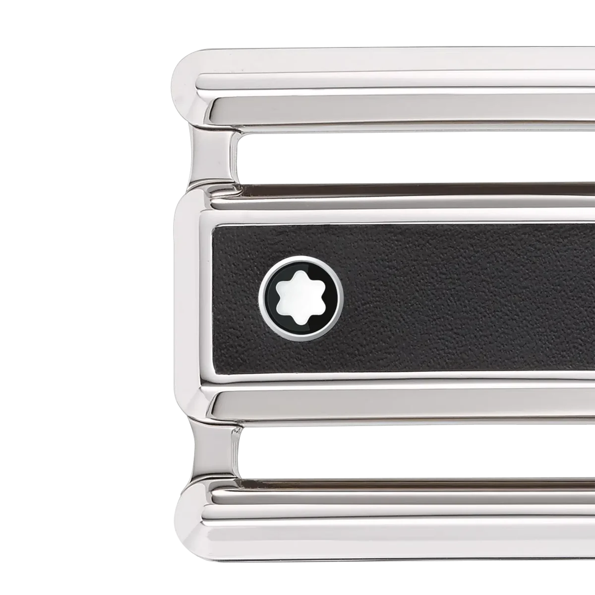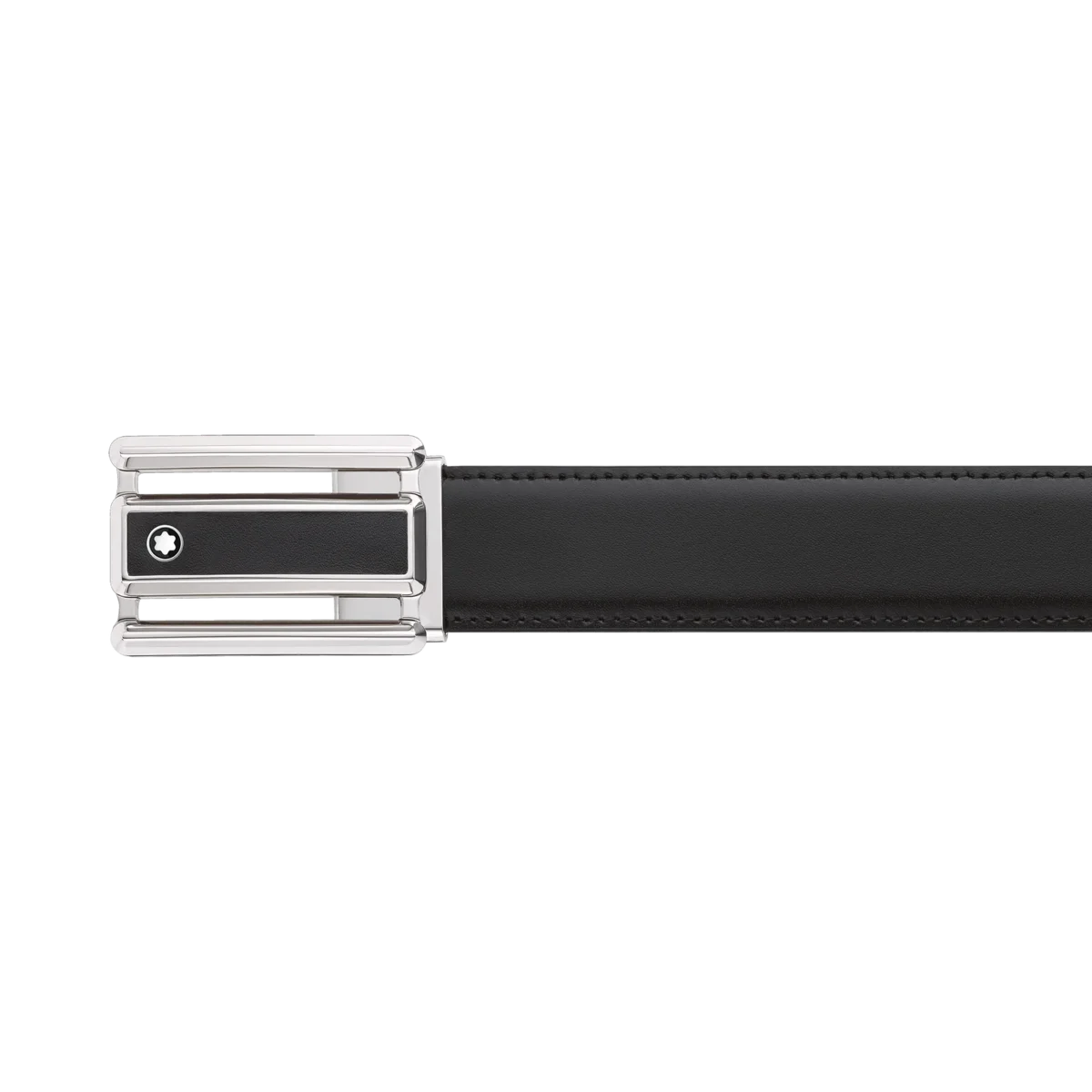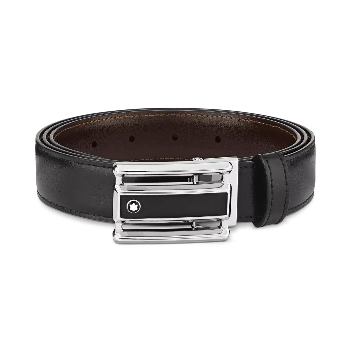 Motif rectangulaire découpé à 3 anneaux, cuir noir et boucle en acier inoxydable. Sangle en cuir noir et marron réversible, auto-ajustable, 3 cm x 120 cm.