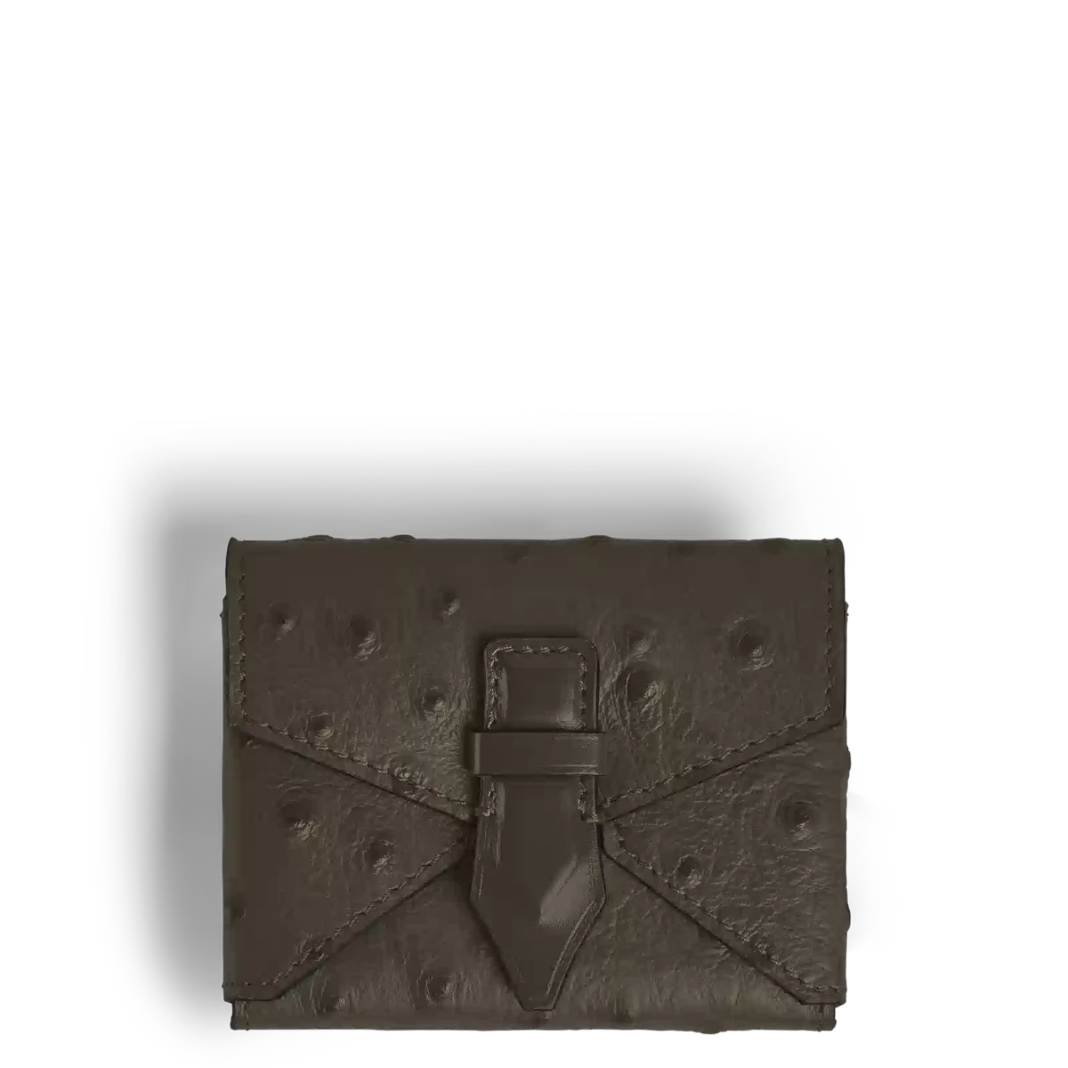 Cet élégant porte-cartes, confectionné dans un cuir luxueux imprimé autruche kaki, allie une texture distinctive à une fonctionnalité quotidienne. Doté d’une poignée amovible pour un transport polyvalent, il est conçu pour contenir des cartes et de la petite monnaie. Agrémenté d’une fermeture à bouton-pression en forme de plume, cet accessoire compact allie avec style sophistication et fonctionnalité.