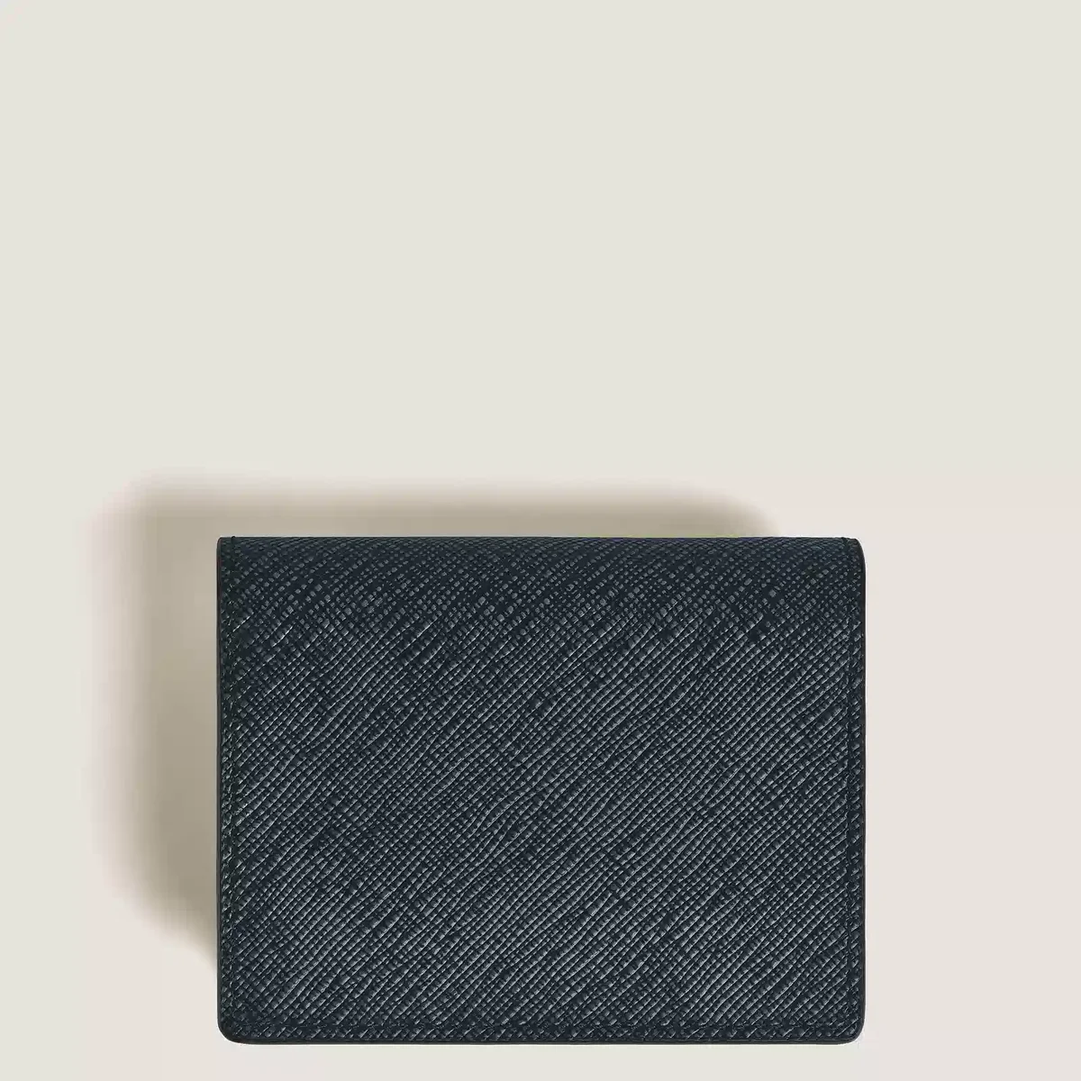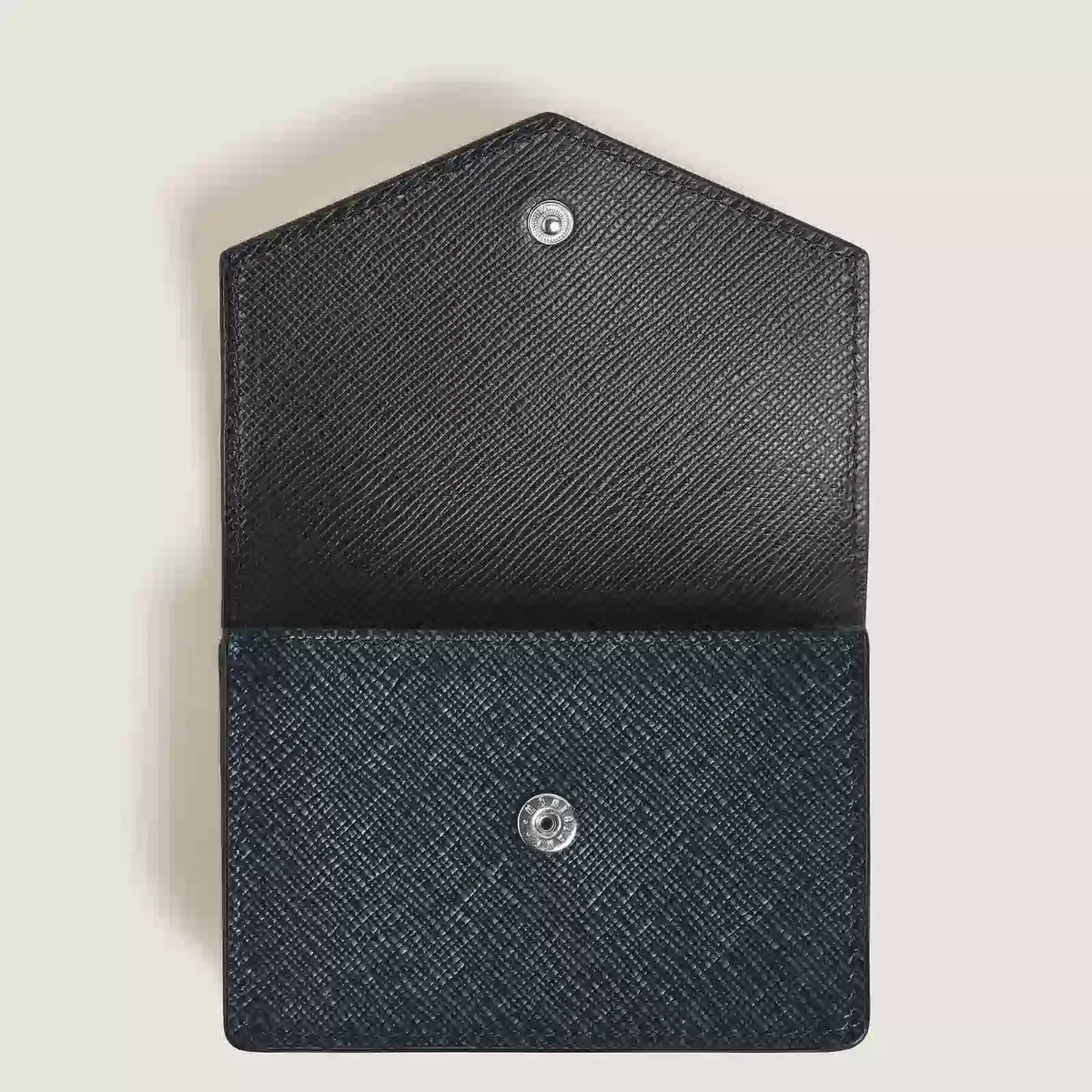 Conçu pour ceux qui apprécient le style minimaliste et fonctionnel, cet élégant porte-cartes est fabriqué en cuir Sartorial gaufré dans une combinaison raffinée de deux tons, bleu et noir. Son design élégant comprend une fermeture à rabat sécurisée par un bouton-pression, qui permet de ranger vos cartes en toute sécurité. À l’intérieur, il offre deux compartiments et une poche supplémentaire, offrant ainsi suffisamment d’espace pour vos cartes essentielles et quelques extras.