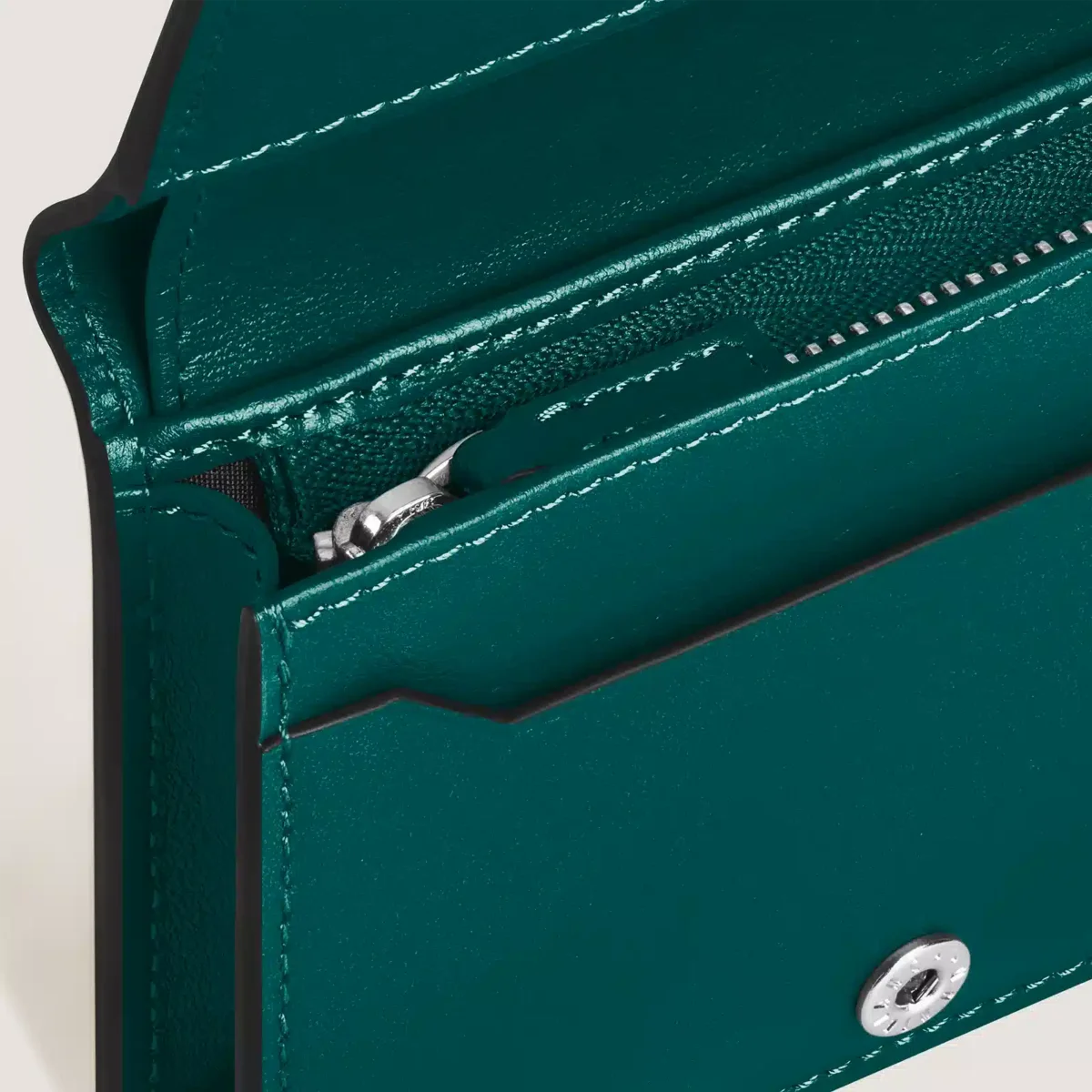 Avec sa silhouette élégante et son cuir souple sophistiqué de couleur malachite, ce petit portefeuille continental offre une solution élégante pour garder vos essentiels en sécurité et bien organisés. Son design compact comprend une poche principale zippée, un compartiment pour les billets, trois fentes pour cartes de crédit et deux poches supplémentaires.