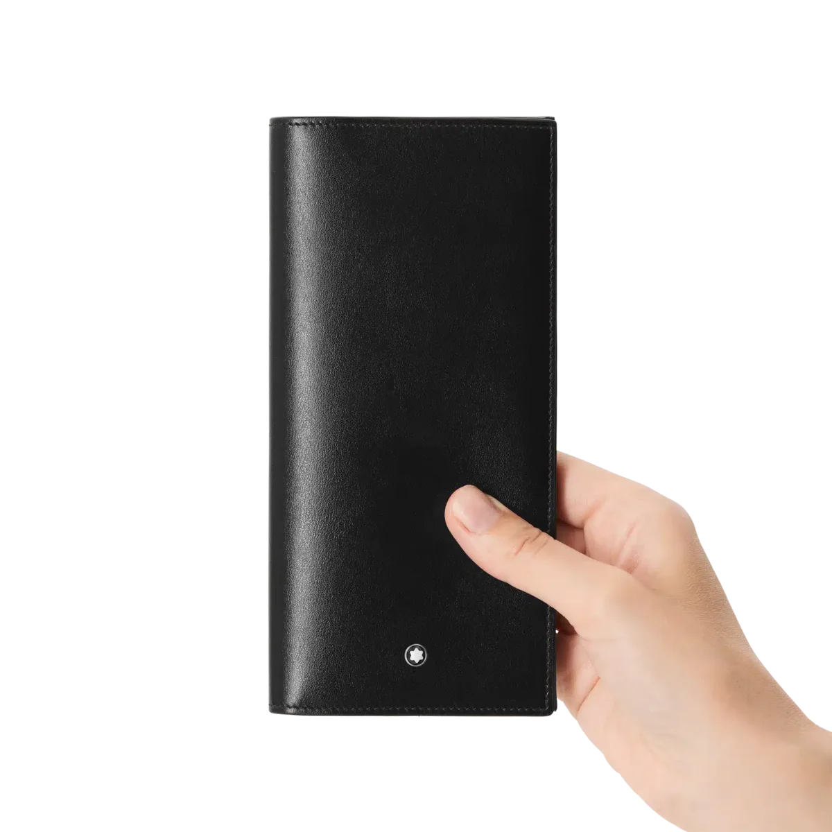 Portefeuille élégant conçu dans un souci de fonctionnalité, le Meisterstück 14cc dispose d’une grande poche zippée pour ranger en toute sécurité vos pièces de monnaie ou vos objets essentiels, et peut accueillir 14 cartes de crédit dans des emplacements dédiés. Ce portefeuille sophistiqué comprend également deux compartiments pour les billets de banque, ainsi que deux poches supplémentaires pour les reçus. Confectionné en cuir lisse, il est doublé de tissu noir et orné de l’emblème Montblanc.