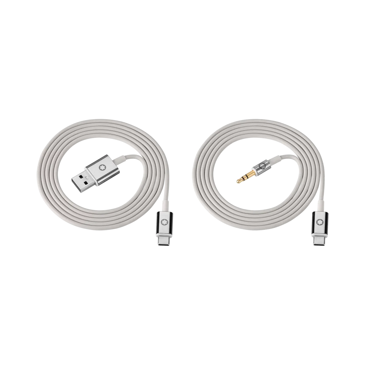 Jeu de câbles supplémentaire pour votre casque Montblanc MB 01 comprenant un câble de recharge USB-C gris et un câble audio gris.