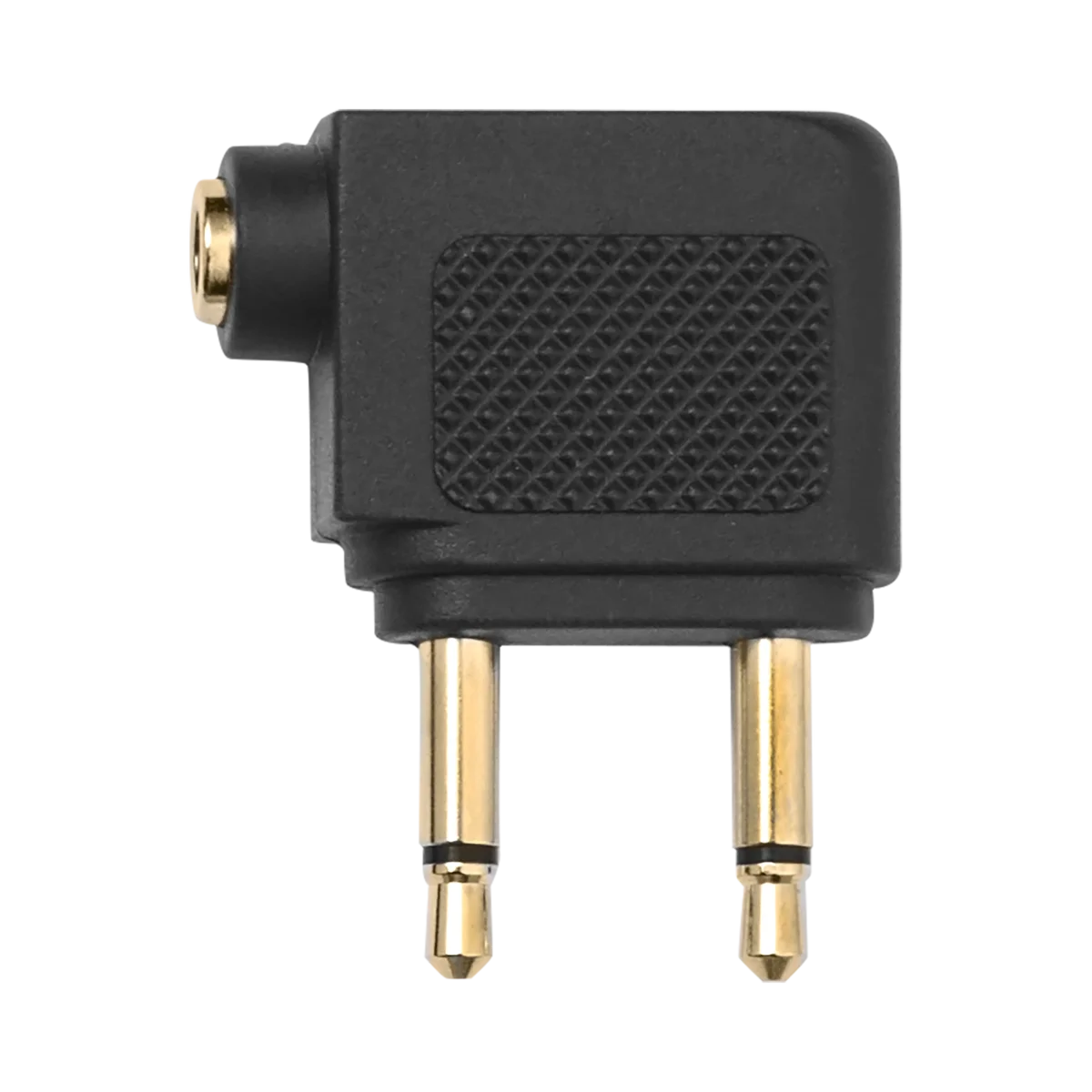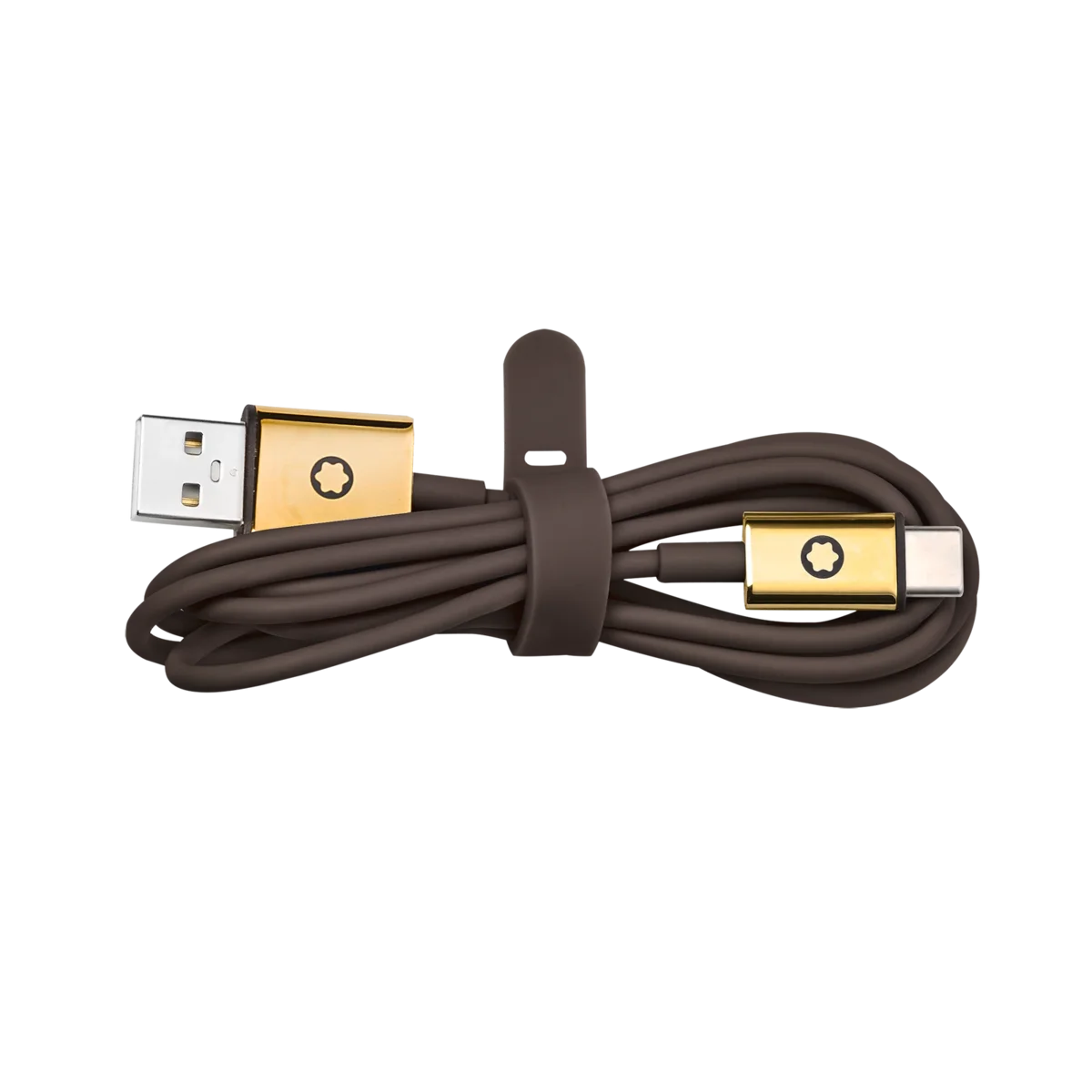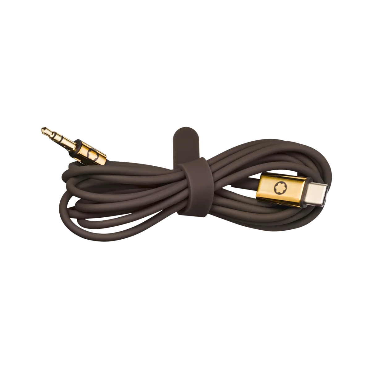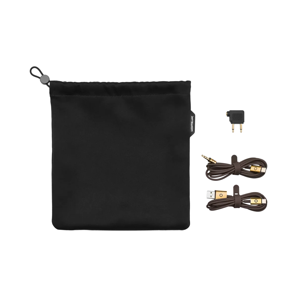 Kit de voyage supplémentaire pour votre casque Montblanc MB 01 comprenant une pochette noire, un câble de recharge USB-C marron, un câble audio marron et un adaptateur de voyage noir.