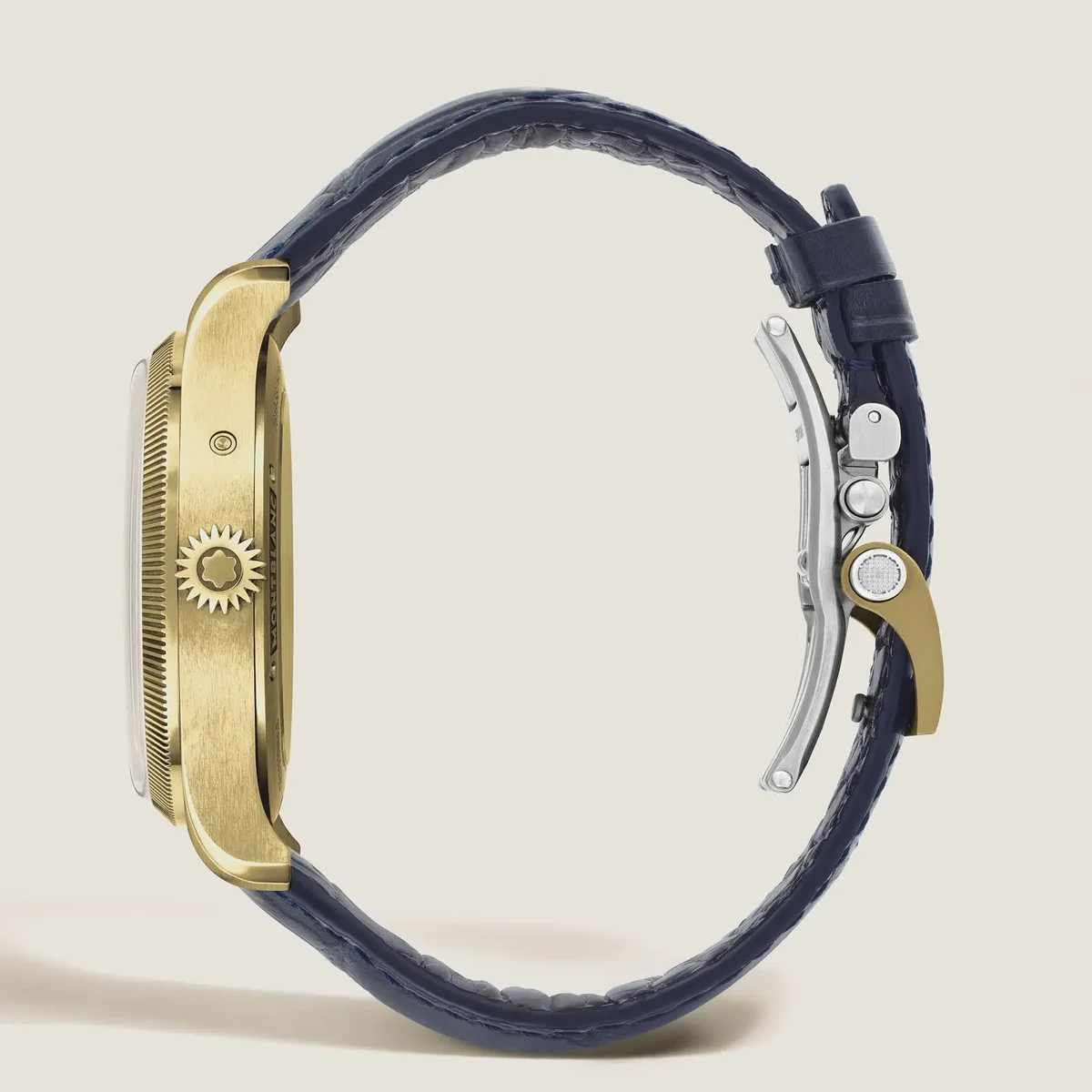 La Montblanc 1858 Annual Calendar Geosphere Limited Edition s’inspire des codes esthétiques hérités de Minerva dans les années 1950, avec son cadran argenté blanc soleil et grainé, ses aiguilles et ses index plaqués or jaune. Le boîtier en or lime 750/1000 (18 carats) de 42 mm est doté d’une lunette cannelée fixe inspirée des montres historiques de Minerva. La montre est animée par un calibre MB M14.58 à remontage manuel et fini à la main, doté d’un calendrier annuel, d’un grand guichet date et d’une fonction heure universelle. Pour les fonctions du calendrier annuel, la grande date est positionnée à 12 heures et comporte deux grandes fenêtres placées côte à côte, tandis que les mois sont affichés sur le pourtour du cadran. Le point de mire de ce garde-temps est sans aucun doute son globe rotatif tridimensionnel peint à la main, représentant l’hémisphère nord avec indication du jour et de la nuit et une échelle de 24 heures. Le garde-temps est complété par un bracelet interchangeable en cuir de veau bleu avec imprimé alligator et un fermoir triple déployant en or lime 750/1000 (18 carats) et acier inoxydable avec système de réglage fin. Numéro d’identification : MB134027