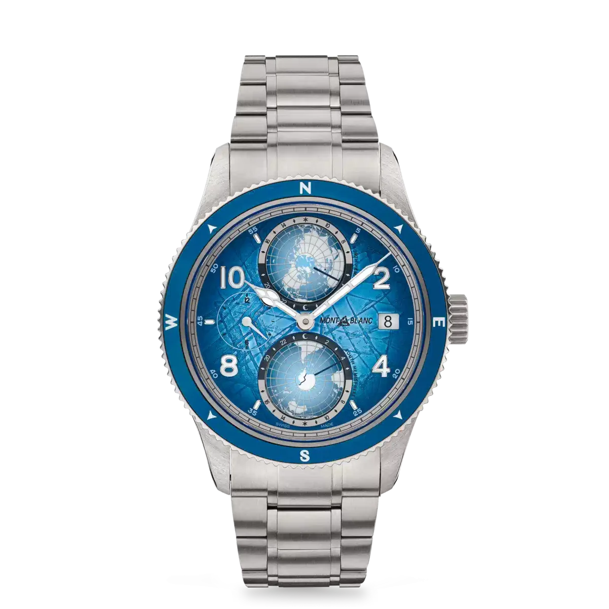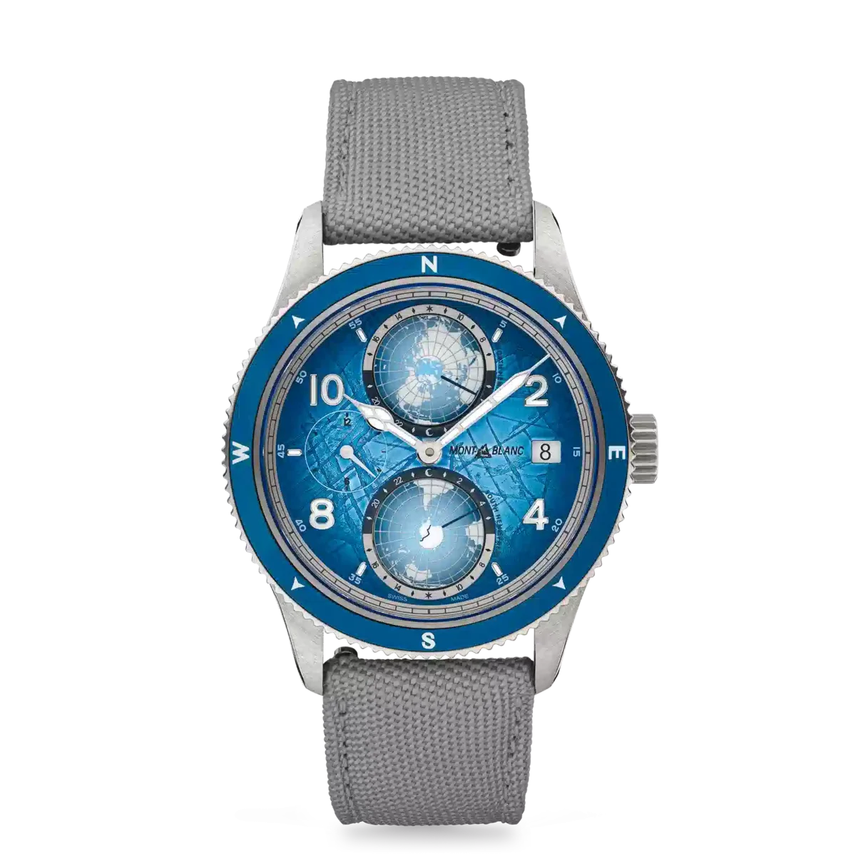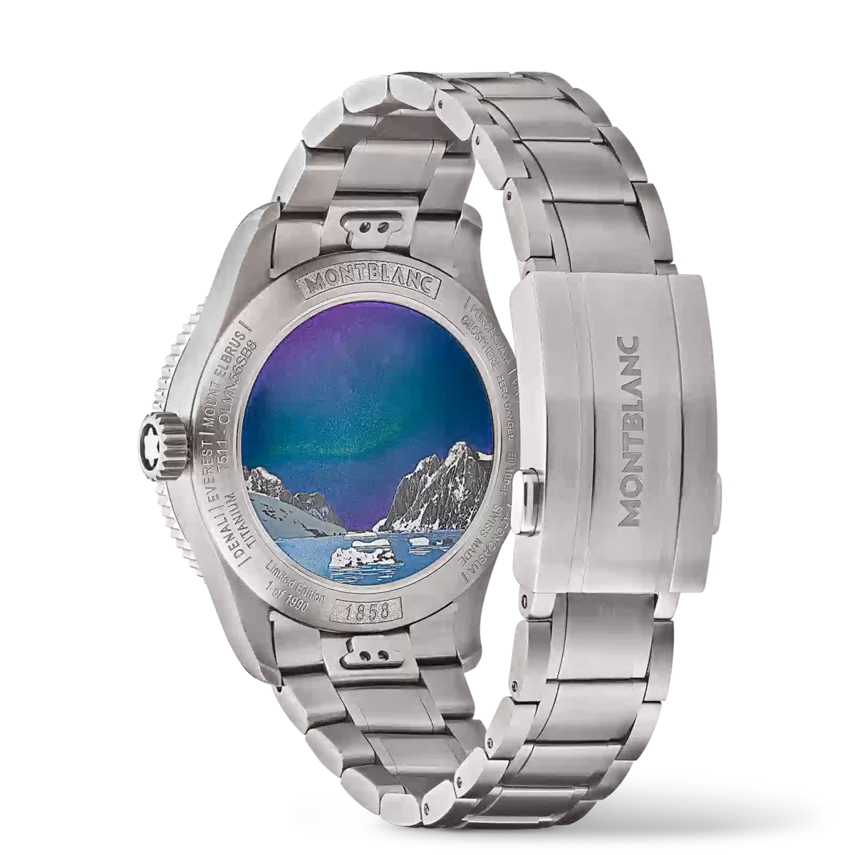 Cette édition limitée à 1990 exemplaires de la Montblanc 1858 Geosphere s’inspire des explorations du pôle Sud sur le continent antarctique. La montre est animée par le mouvement automatique Montblanc avec complication Manufacture Worldtime – le calibre MB 29.25 – qui indique l’heure dans le monde entier grâce à des globes lumineux tournants distinctifs ; elle affiche également le jour et la nuit, un double fuseau horaire et la date. Logée dans un boîtier en titane ultraléger de 42 mm entièrement dépourvu d’oxygène, cette nouvelle innovation technique présente plusieurs avantages pour les explorateurs en éliminant la buée et en empêchant l’oxydation, ce qui permet au mouvement de durer beaucoup plus longtemps avec une plus grande précision. La montre est équipée d’un cadran bleu glacé sfumato à motif glacier et d’une lunette bidirectionnelle en aluminium anodisé de couleur assortie. Elle est disponible avec un bracelet interchangeable effilé doté d’un système de réglage fin et un bracelet en textile gris à motif corde. Au dos du boîtier, une gravure laser 3D représente un paysage gelé avec l’aurore australe. Numéro d’identification : MB130961 Largeur des cornes : 22 mm