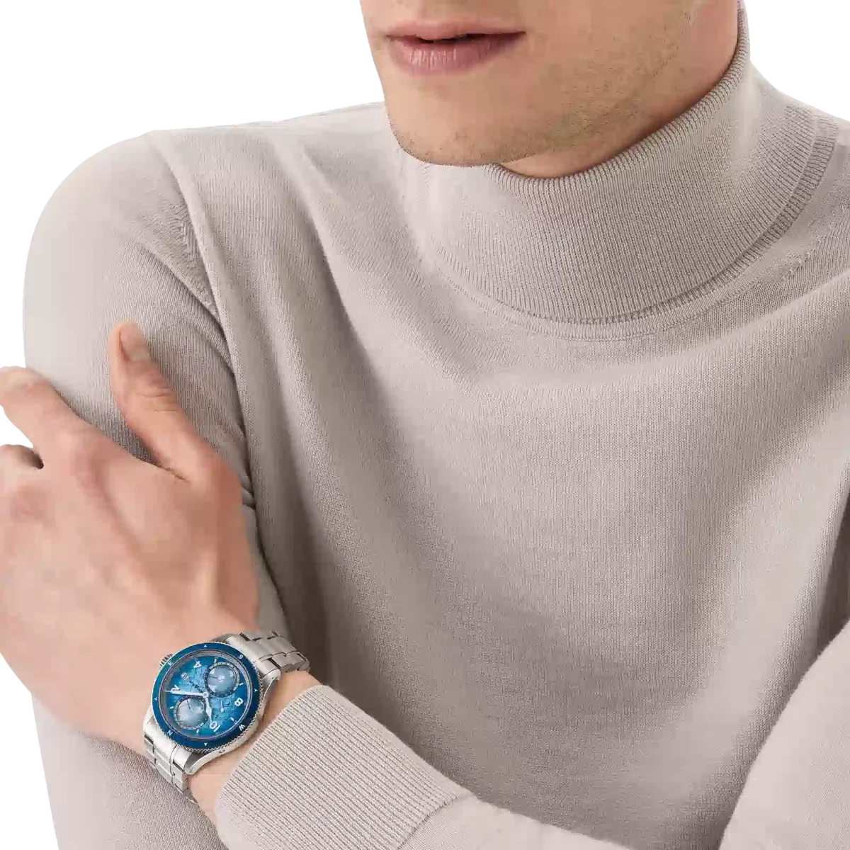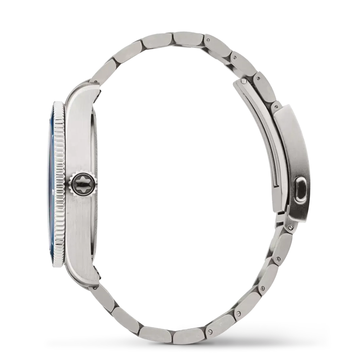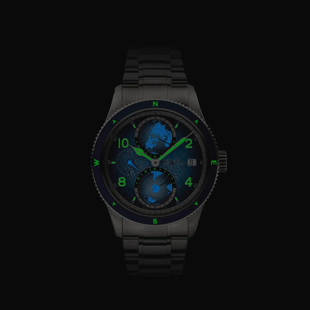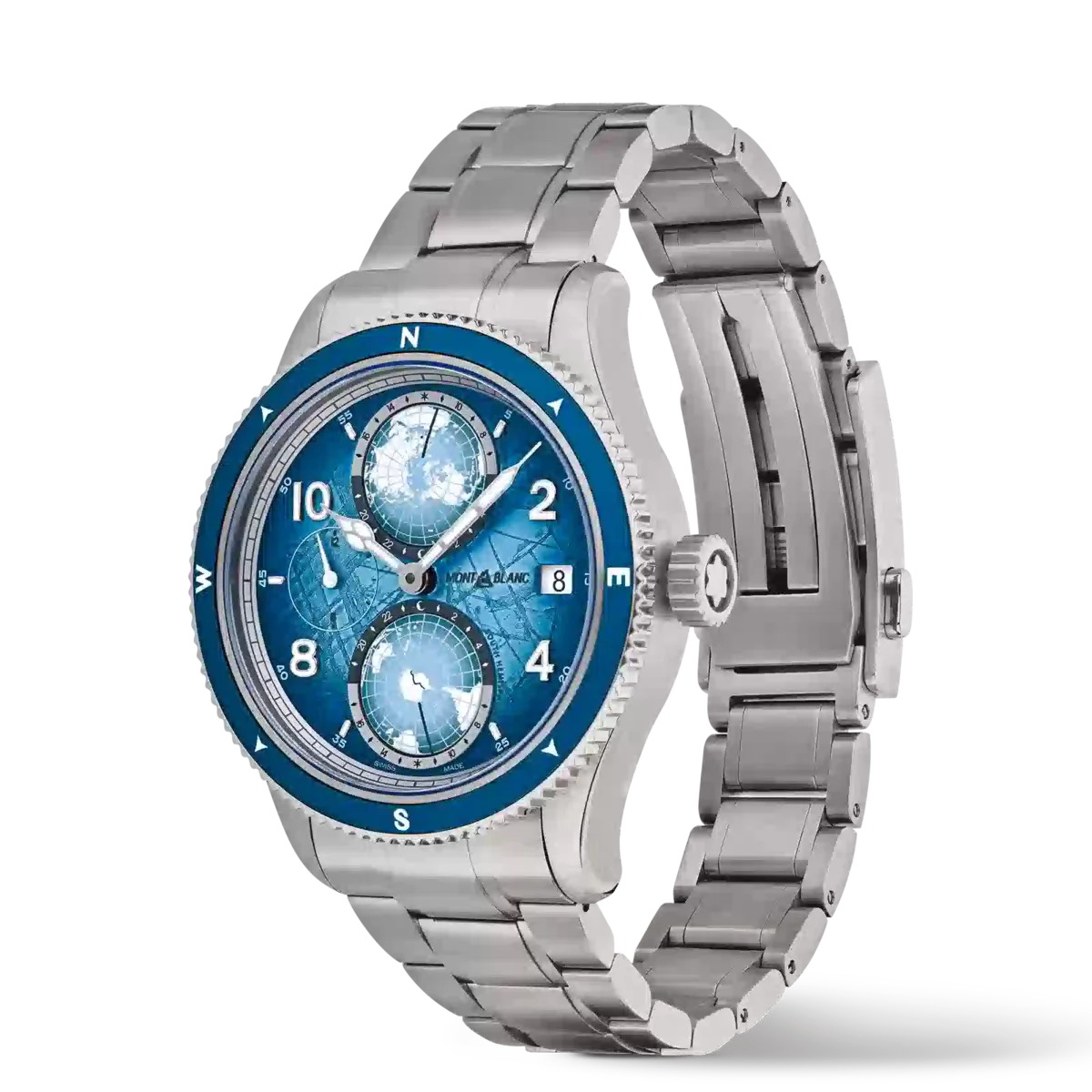 Cette édition limitée à 1990 exemplaires de la Montblanc 1858 Geosphere s’inspire des explorations du pôle Sud sur le continent antarctique. La montre est animée par le mouvement automatique Montblanc avec complication Manufacture Worldtime – le calibre MB 29.25 – qui indique l’heure dans le monde entier grâce à des globes lumineux tournants distinctifs ; elle affiche également le jour et la nuit, un double fuseau horaire et la date. Logée dans un boîtier en titane ultraléger de 42 mm entièrement dépourvu d’oxygène, cette nouvelle innovation technique présente plusieurs avantages pour les explorateurs en éliminant la buée et en empêchant l’oxydation, ce qui permet au mouvement de durer beaucoup plus longtemps avec une plus grande précision. La montre est équipée d’un cadran bleu glacé sfumato à motif glacier et d’une lunette bidirectionnelle en aluminium anodisé de couleur assortie. Elle est disponible avec un bracelet interchangeable effilé doté d’un système de réglage fin et un bracelet en textile gris à motif corde. Au dos du boîtier, une gravure laser 3D représente un paysage gelé avec l’aurore australe. Numéro d’identification : MB130961 Largeur des cornes : 22 mm