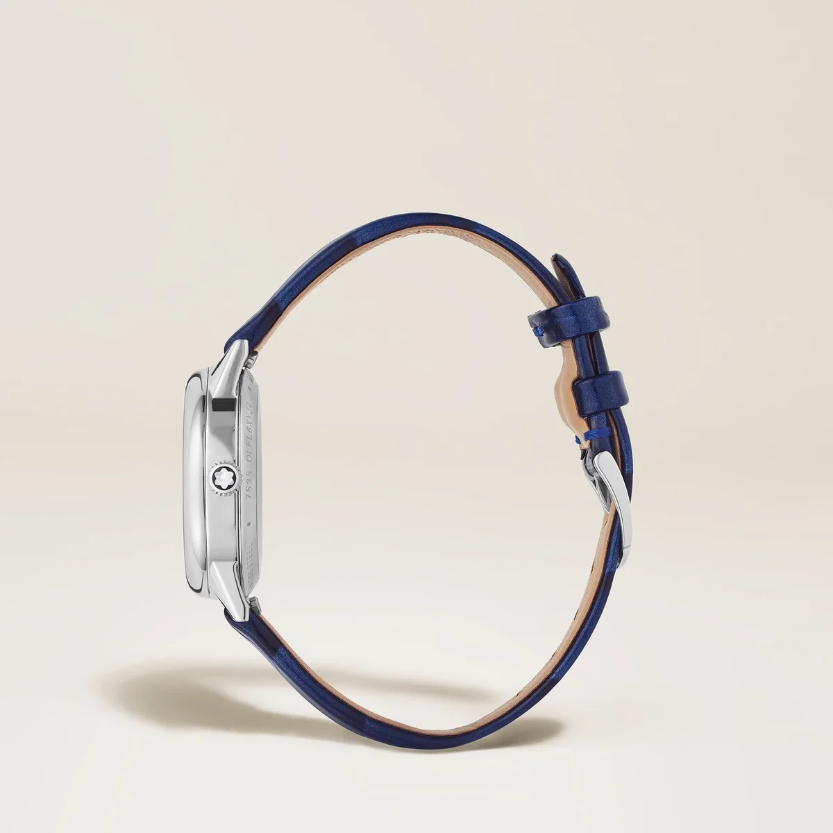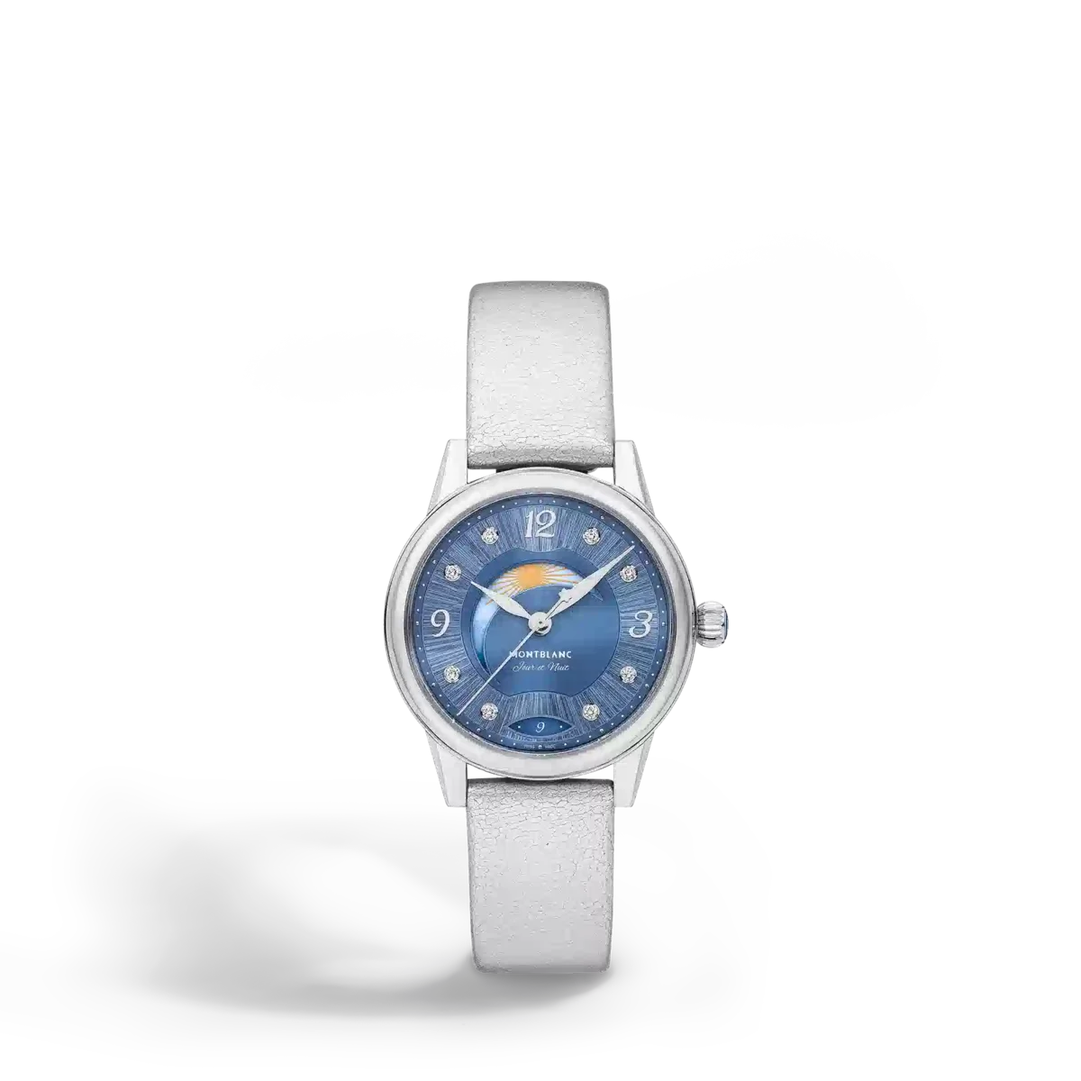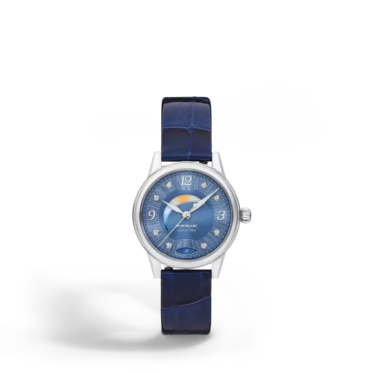 Interprétant les codes de la haute horlogerie de manière élégante et féminine, la Montblanc Bohème Day & Night s’inspire de l’univers de l’écriture manuscrite et de l’aquarelle et se présente dans un boîtier en acier inoxydable de 30 mm. Elle est dotée d’un élégant cadran bleu brossé soleil orné d’index en diamant, de chiffres arabes floraux rhodiés et d’aiguilles. Parmi les autres détails raffinés, citons un motif filet sauté et une technique d’estampage appelée filé d’étoiles. Équipé du calibre automatique MB 24.20, ce modèle indique les heures, les minutes et les secondes, ainsi que la date affichée dans un guichet en forme d’amande avec des chiffres manuscrits. La police romantique a également été appliquée au cadran pour l’indication jour et nuit « Jour et Nuit ». La complication céleste jour et nuit montre l’évolution du ciel sur une période de 24 heures et apporte une touche romantique et artistique à la montre, car elle est réalisée à l’aquarelle. Ce garde-temps est équipé d’un bracelet interchangeable en cuir de veau bleu avec imprimé alligator et d’un bracelet supplémentaire. Numéro d’identification : MB133334 Largeur des cornes : 14 mm