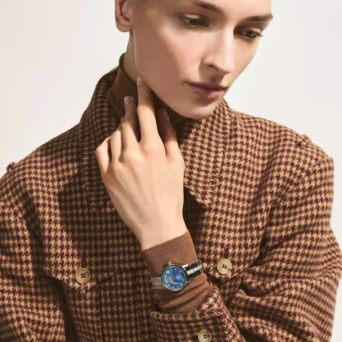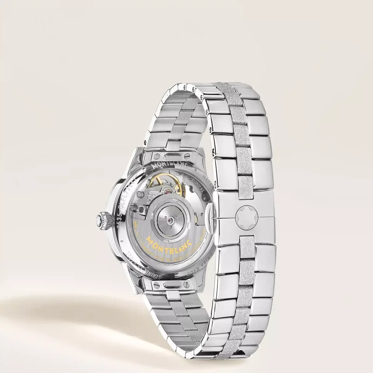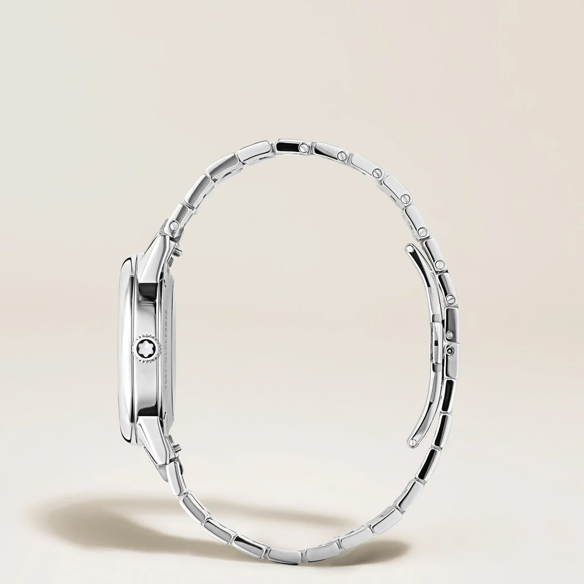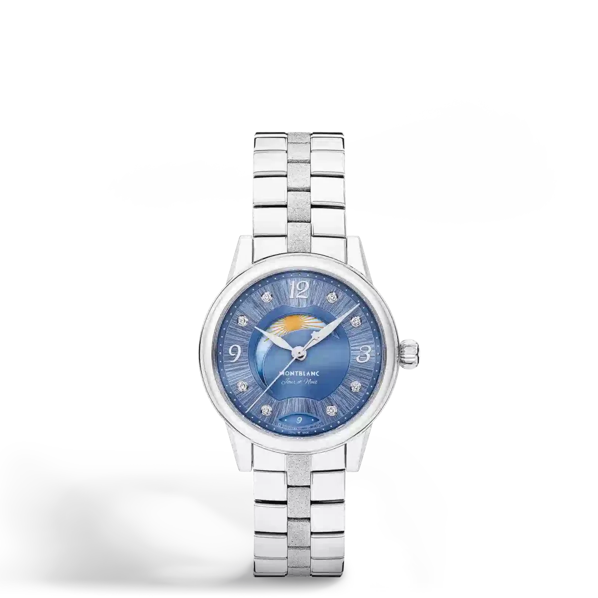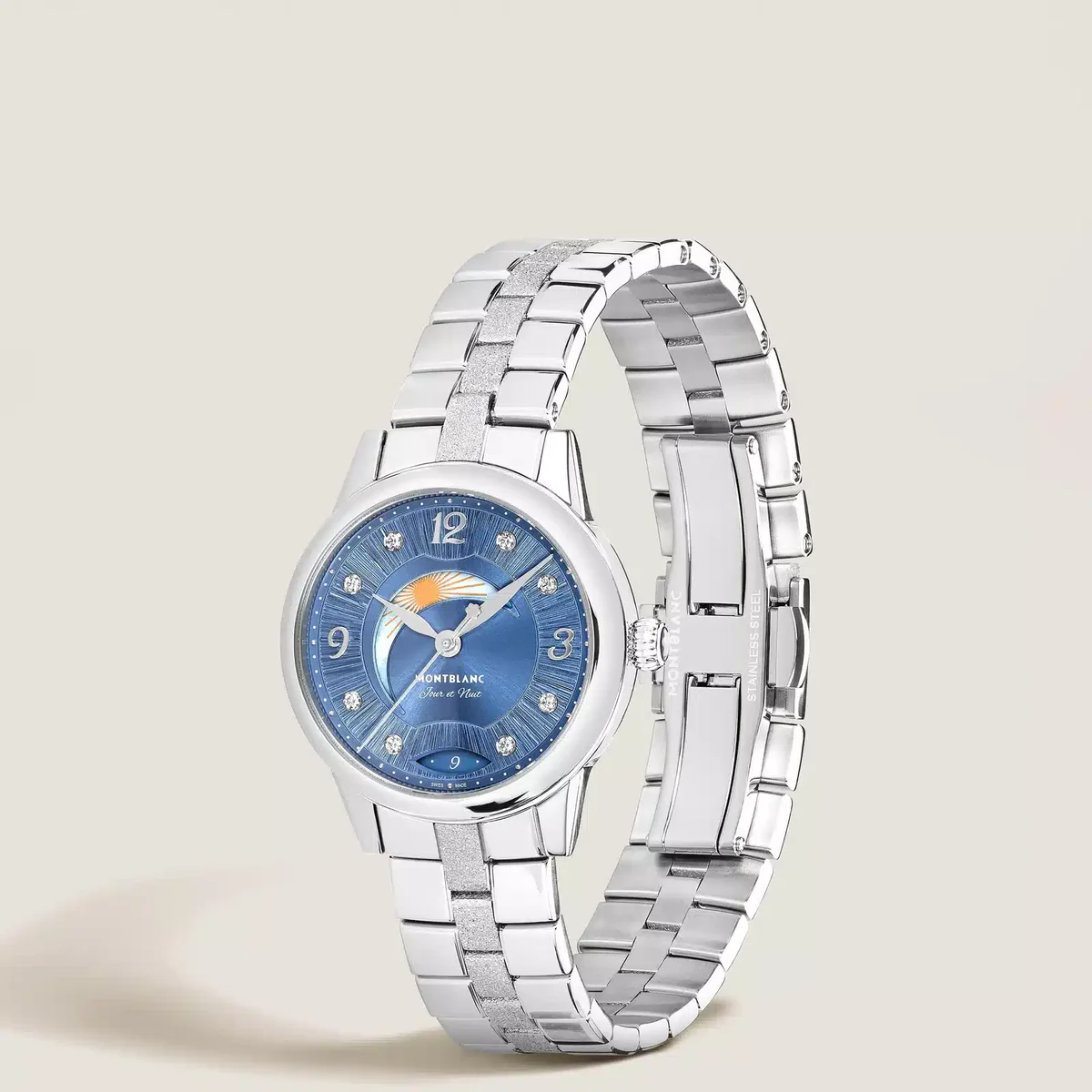 Interprétant les codes de la haute horlogerie de manière élégante et féminine, la Montblanc Bohème Day & Night s’inspire de l’univers de l’écriture manuscrite et de l’aquarelle et se présente dans un boîtier en acier inoxydable de 30 mm. Elle est dotée d’un élégant cadran bleu brossé soleil orné d’index en diamant, de chiffres arabes floraux rhodiés et d’aiguilles. Parmi les autres détails raffinés, citons un motif filet sauté et une technique d’estampage appelée filé d’étoiles. Équipé du calibre automatique MB 24.20, ce modèle indique les heures, les minutes et les secondes, ainsi que la date affichée dans un guichet en forme d’amande avec des chiffres manuscrits. La police romantique a également été appliquée au cadran pour l’indication jour et nuit « Jour et Nuit ». La complication céleste jour et nuit montre l’évolution du ciel sur une période de 24 heures et apporte une touche romantique et artistique à la montre, car elle est réalisée à l’aquarelle. Cette montre est équipée d’un bracelet interchangeable en acier inoxydable avec un maillon central texturé et un système de réglage fin. Numéro d’identification : MB134342
