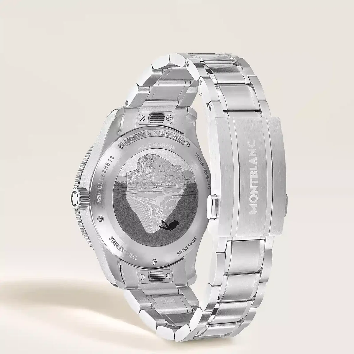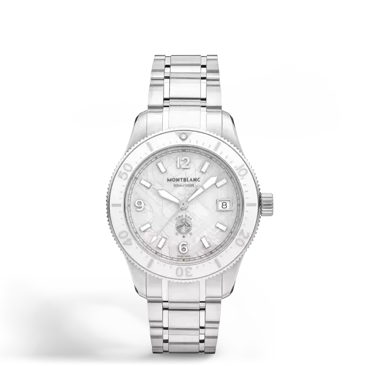La Montblanc Iced Sea Automatic Date 0 Oxygen, avec son cadran blanc au motif glacier, donne l’impression de plonger dans les profondeurs d’un glacier. Inspirée de la Mer de Glace, cette texture glaciale a été obtenue à l’aide d’une technique ancestrale presque oubliée appelée « gratté-boisé ». La montre est logée dans un boîtier en acier inoxydable de 38 mm totalement dépourvu d’oxygène et est dotée d’une lunette tournante unidirectionnelle avec insert en céramique blanche, d’une gravure 3D sur le fond du boîtier et d’un bracelet interchangeable en acier inoxydable avec système de réglage fin. La montre est conforme à la norme ISO 6425 pour la plongée sous-marine et offre une étanchéité à 300 mètres. N° d’identification : MB134024