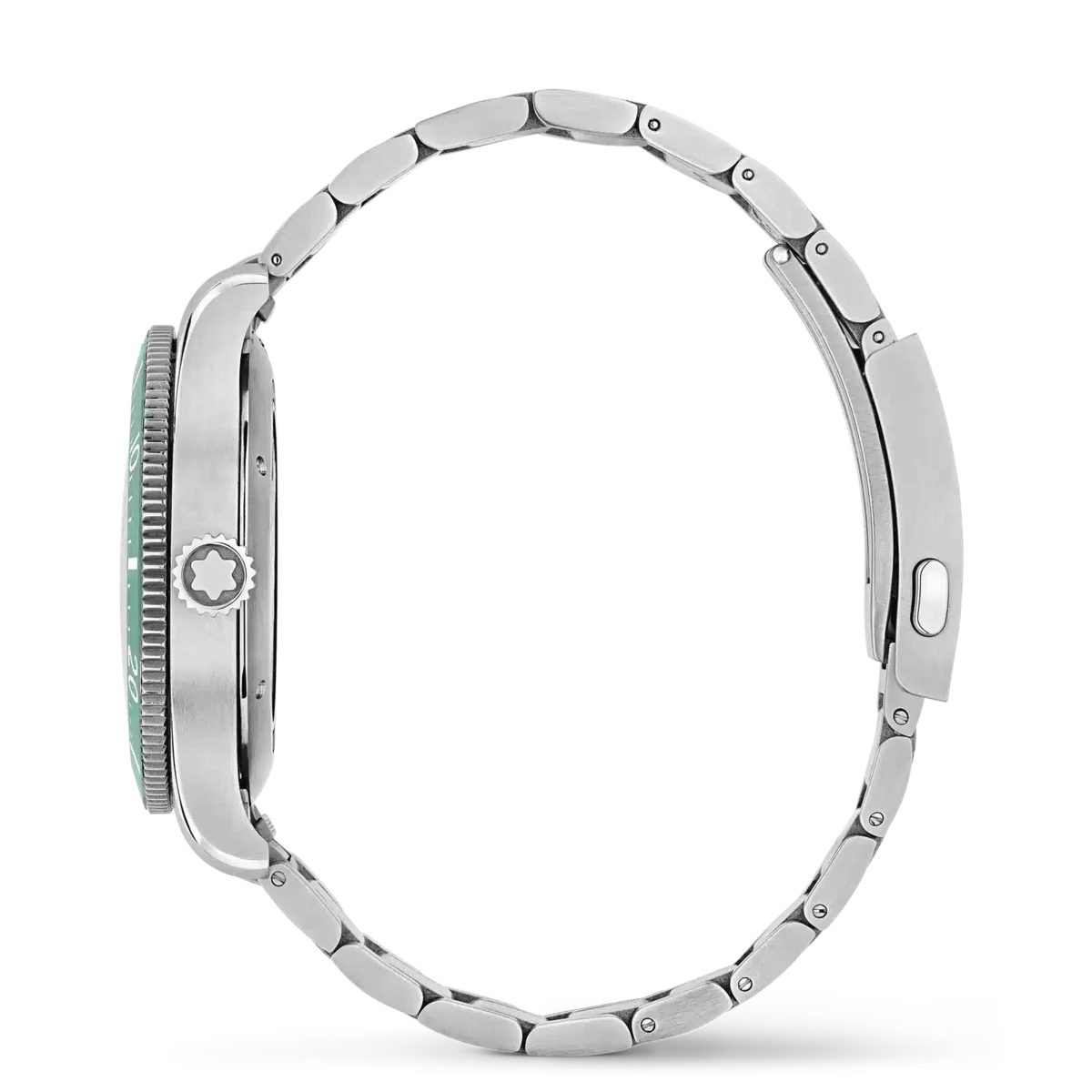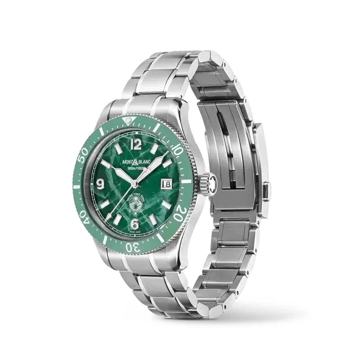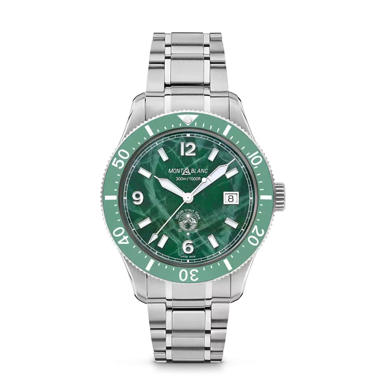 Première montre de plongée sportive de Montblanc, la Montblanc Iced Sea Automatic Date est dotée d’un cadran au motif glacier qui donne l’impression de plonger dans les profondeurs d’un glacier. Ce cadran vert à motif glaciaire s’inspire de la Mer de Glace, le principal glacier du massif du Mont-Blanc. Sa texture a été obtenue à l’aide d’une technique ancestrale presque oubliée appelée « gratté-boisé ». Le garde-temps est logé dans un boîtier en acier inoxydable de 41 mm et est doté d’une lunette unidirectionnelle bicolore en céramique, d’un fond gravé et d’un bracelet interchangeable en acier inoxydable avec système de réglage fin. Le garde-temps est conforme à la norme ISO 6425 pour les montres de plongée et est étanche jusqu’à 300 mètres. Numéro d’identification : MB129373