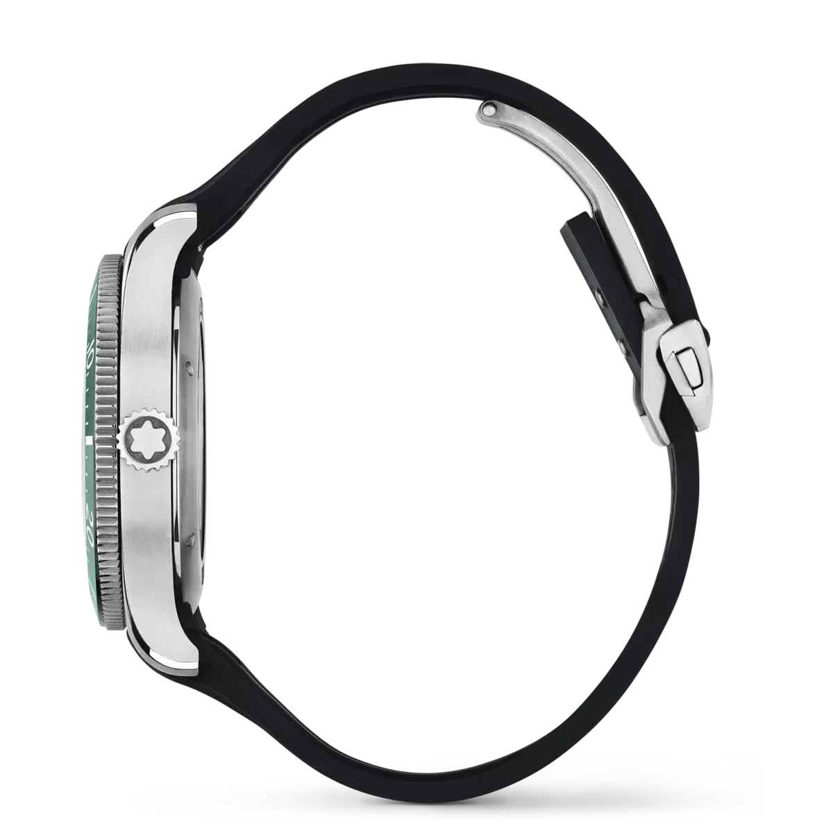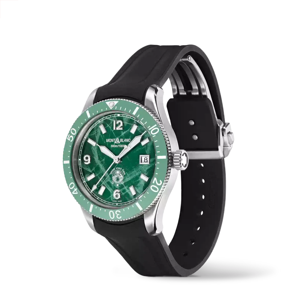 Première montre de plongée sportive de Montblanc, la Montblanc Iced Sea Automatic Date est dotée d’un cadran à motif glacier qui donne l’impression de plonger dans les profondeurs d’un glacier. Ce cadran vert à motif glacier s’inspire de la Mer de Glace, le principal glacier du massif du Mont-Blanc. Sa texture a été obtenue à l’aide d’une technique ancestrale presque oubliée appelée « gratté-boisé ». Le garde-temps est logé dans un boîtier en acier inoxydable de 41 mm et est doté d’une lunette unidirectionnelle bicolore en céramique, d’un fond gravé et d’un bracelet interchangeable en caoutchouc noir avec système de réglage fin. La montre est conforme à la norme ISO 6425 pour les montres de plongée et est étanche jusqu’à 300 mètres. Numéro d’identification : MB129765 Largeur du bracelet : 20 mm
