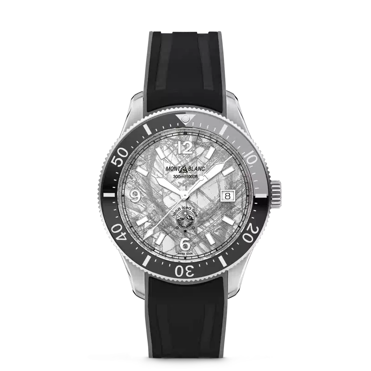 La Montblanc Iced Sea Automatic Date avec cadran gris à motif glacier donne l’impression de plonger dans les profondeurs d’un glacier avec tous ses minéraux capturés dans le temps depuis des millénaires. Inspirée de la Mer de Glace, cette texture glaciale a été obtenue à l’aide d’une technique ancestrale presque oubliée appelée gratté-boisé. Ce garde-temps de 41 mm est livré avec un bracelet interchangeable en caoutchouc noir avec un contour gris qui peut être rapidement et facilement remplacé par un bracelet en acier inoxydable sans avoir à retourner en boutique ou à utiliser des outils. Il est également ajustable au poignet lorsque vous portez la montre pour plonger. La montre est conforme à la norme ISO 6425 pour la plongée sous-marine, offre une étanchéité à 300 mètres et dispose d’index luminescents pour une lecture dans des conditions de faible luminosité. Numéro d’identification : MB130807 Largeur des cornes : 20 mm