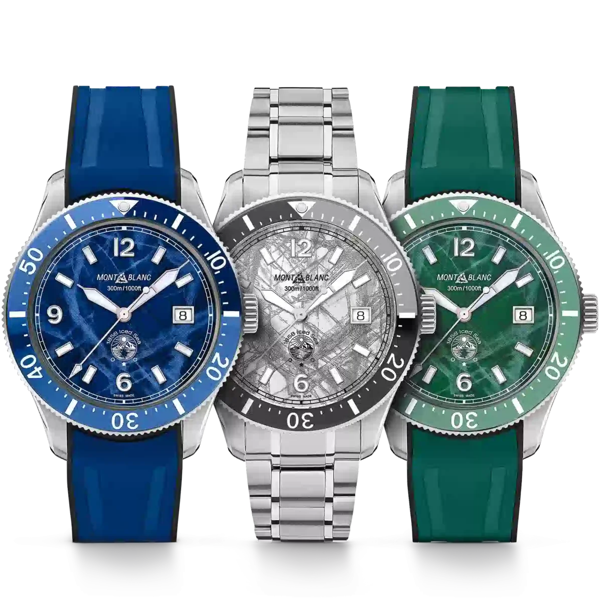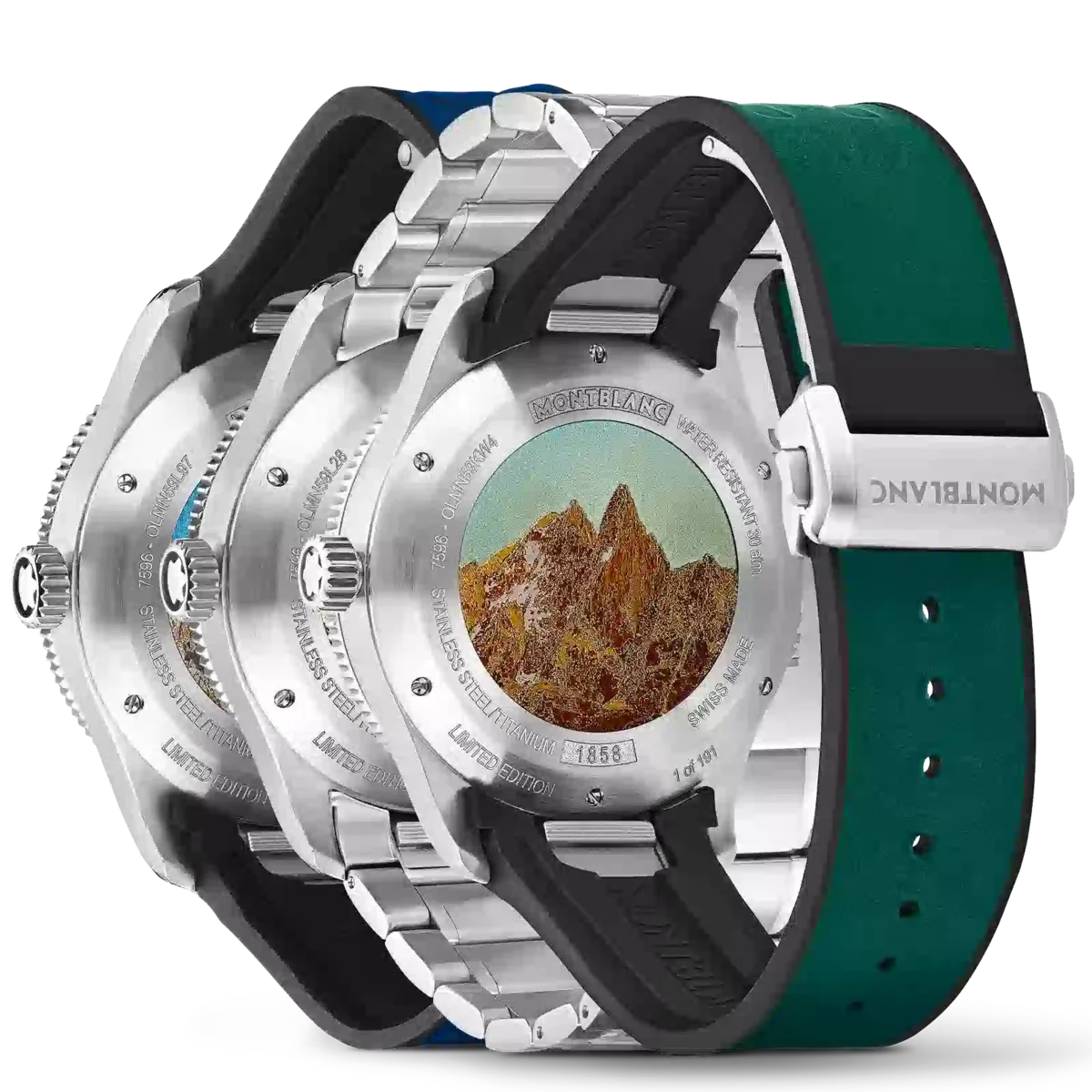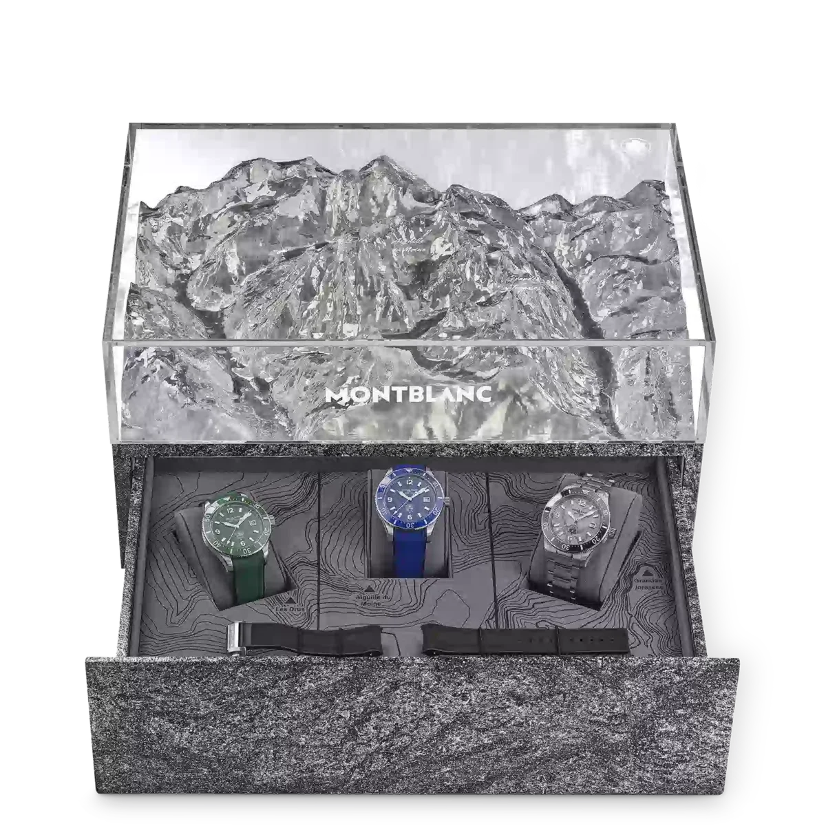 Le coffret Montblanc Iced Sea Automatic Date comprend trois éditions Iced Sea en bleu, vert et gris. Chaque modèle se distingue des éditions standard par une gravure laser colorée représentant les montagnes du massif du Mont-Blanc. Les trois garde-temps sont présentés dans un coffret décoratif doté d’une base en granit, symbolisant la roche du Mont-Blanc, et d’un couvercle en Plexiglas® gravé au laser pour représenter le relief du massif du Mont-Blanc. Le coffret est accompagné d’un bracelet en acier inoxydable et de trois bracelets en caoutchouc interchangeables de différentes couleurs. Ce coffret en édition limitée à 191 exemplaires est disponible en exclusivité dans les boutiques Montblanc. Numéro d’identification : MB131326