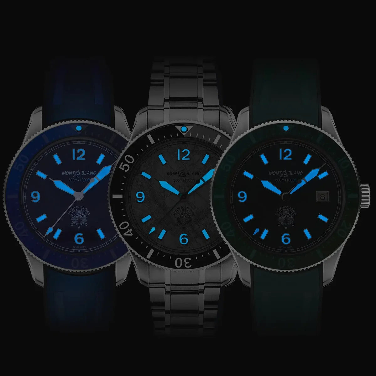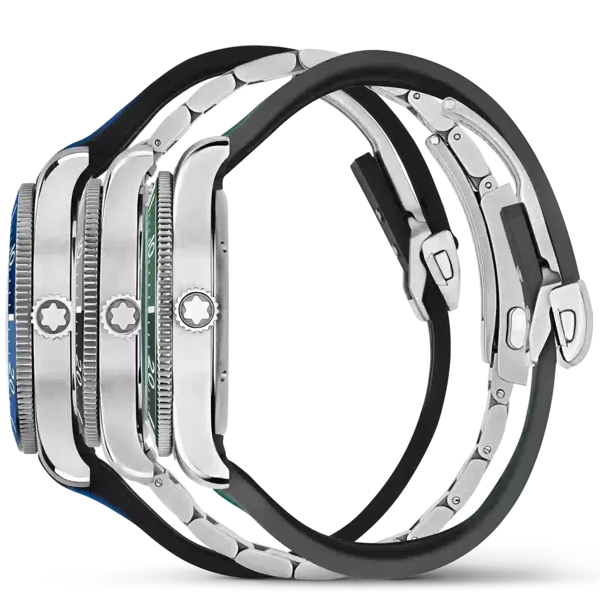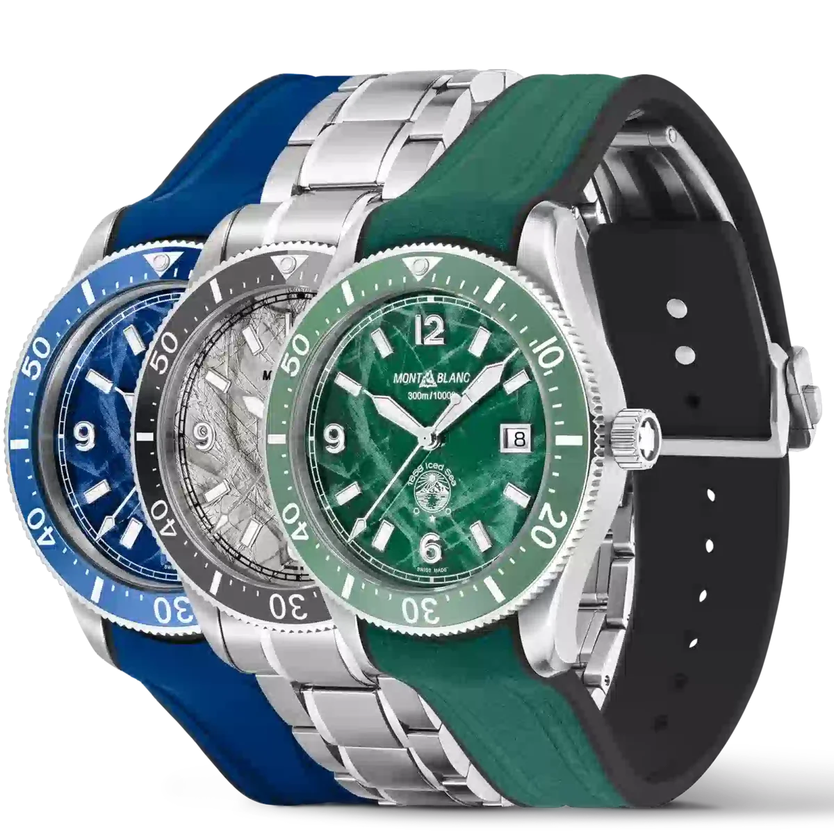 Le coffret Montblanc Iced Sea Automatic Date comprend trois éditions Iced Sea en bleu, vert et gris. Chaque modèle se distingue des éditions standard par une gravure laser colorée représentant les montagnes du massif du Mont-Blanc. Les trois garde-temps sont présentés dans un coffret décoratif doté d’une base en granit, symbolisant la roche du Mont-Blanc, et d’un couvercle en Plexiglas® gravé au laser pour représenter le relief du massif du Mont-Blanc. Le coffret est accompagné d’un bracelet en acier inoxydable et de trois bracelets en caoutchouc interchangeables de différentes couleurs. Ce coffret en édition limitée à 191 exemplaires est disponible en exclusivité dans les boutiques Montblanc. Numéro d’identification : MB131326
