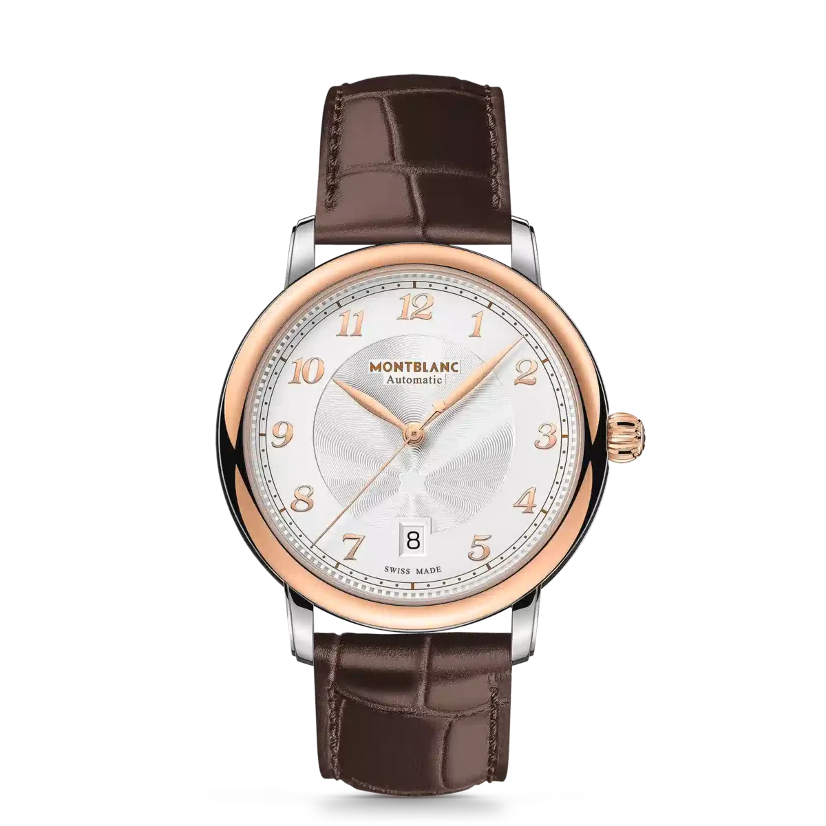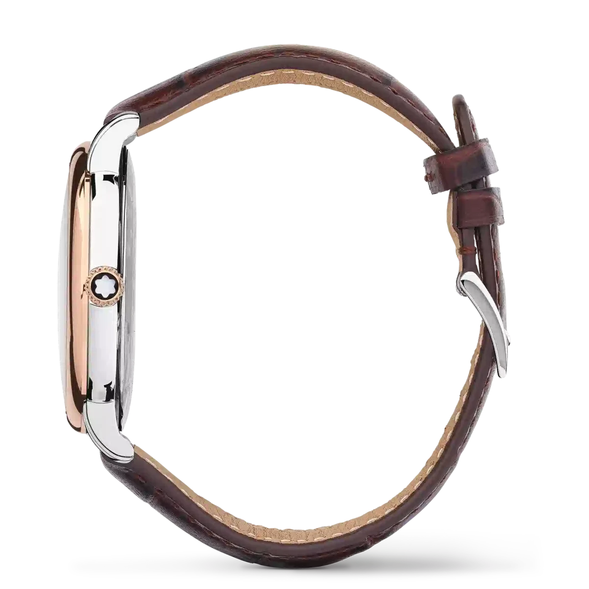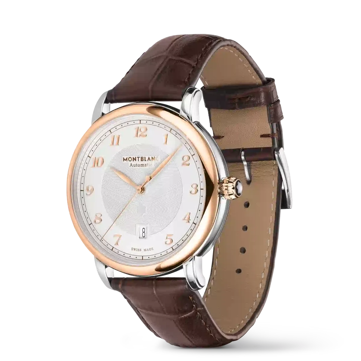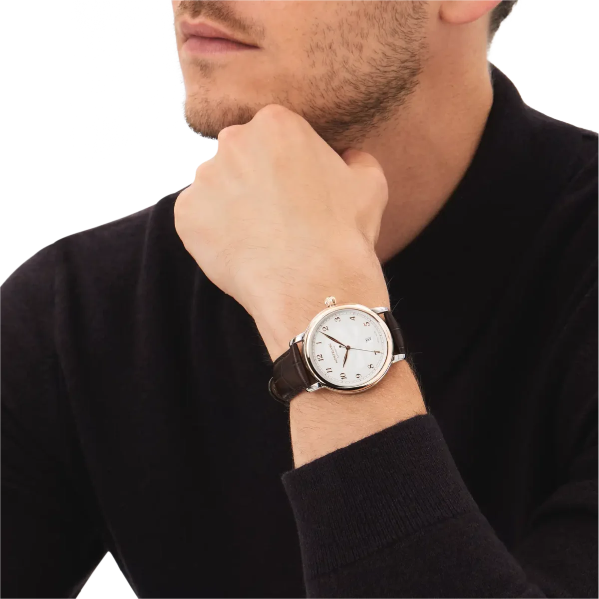 La collection Montblanc Star Legacy s’inspire de l’héritage de Minerva et des montres de poche fabriquées par la société à la fin du XIXe et au début du XXe siècle. Conformément aux codes de conception de la gamme, la Montblanc Star Legacy Automatic Date présente un cadran raffiné de couleur blanc argenté avec le motif guilloché « étoile éclatante » de Montblanc, des chiffres arabes, des aiguilles en forme de feuille, un motif guilloché « filet sauté » et une minuterie chemin de fer. La montre est équipée du calibre automatique MB 24.17 et affiche les heures, les minutes et les secondes au centre, ainsi que la date dans un guichet à six heures. Elle est proposée dans un boîtier en acier inoxydable de 42 mm avec une lunette en or rose 750/1000 (18 carats) et est équipée d’un bracelet en cuir de veau marron avec imprimé alligator.