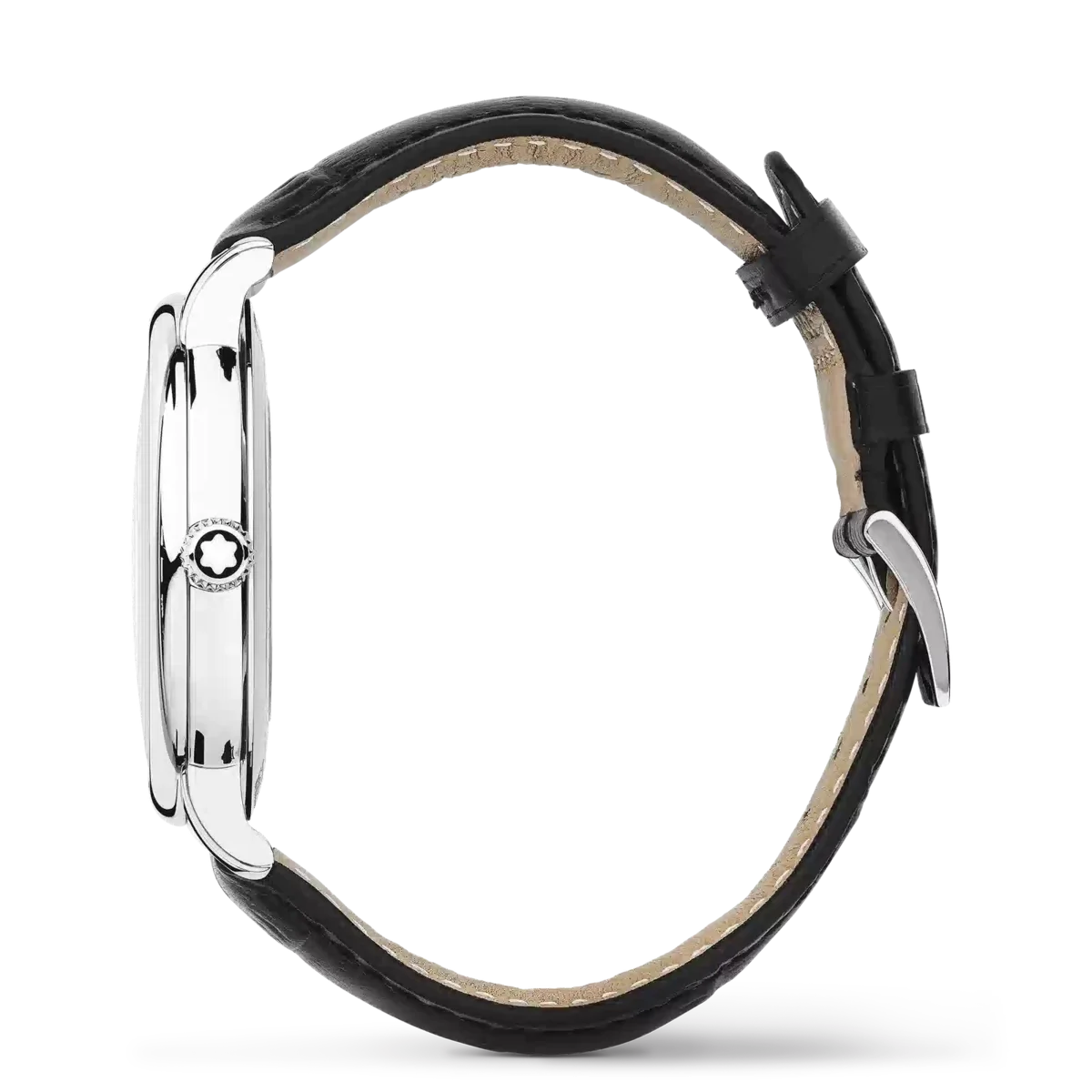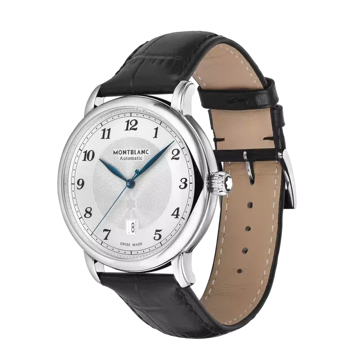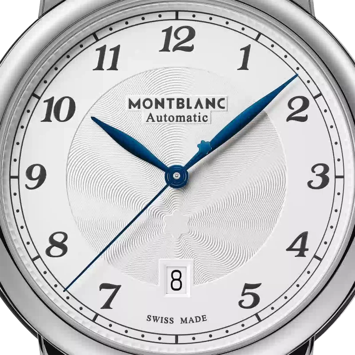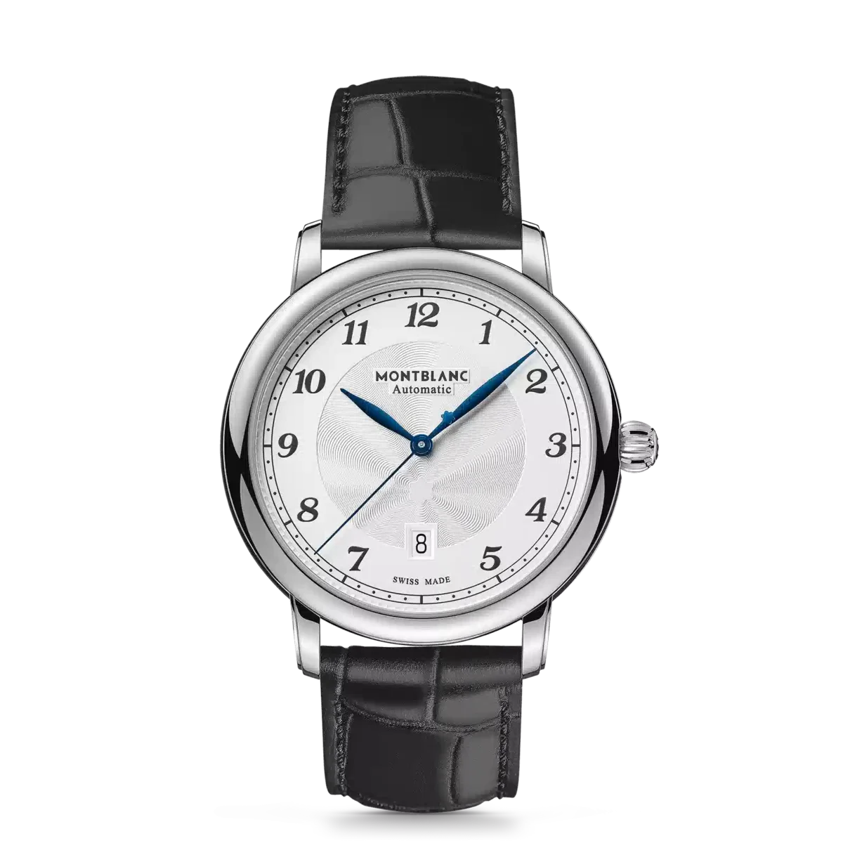 La collection Montblanc Star Legacy s’inspire de l’héritage de Minerva et des montres de poche fabriquées par la société à la fin du XIXe et au début du XXe siècle.Conformément aux codes de conception de la gamme, la Montblanc Star Legacy Automatic Date présente un cadran raffiné blanc argenté avec le motif guilloché « étoile éclatante » de Montblanc, des chiffres arabes, des aiguilles en forme de feuille, un motif guilloché « filet sauté » et une minuterie chemin de fer. La montre est équipée du calibre automatique MB 24.17 et affiche les heures, les minutes et les secondes au centre, ainsi que la date dans un guichet à six heures. Elle est dotée d’un boîtier en acier inoxydable de 42 mm et d’un bracelet en cuir de veau noir avec imprimé alligator.