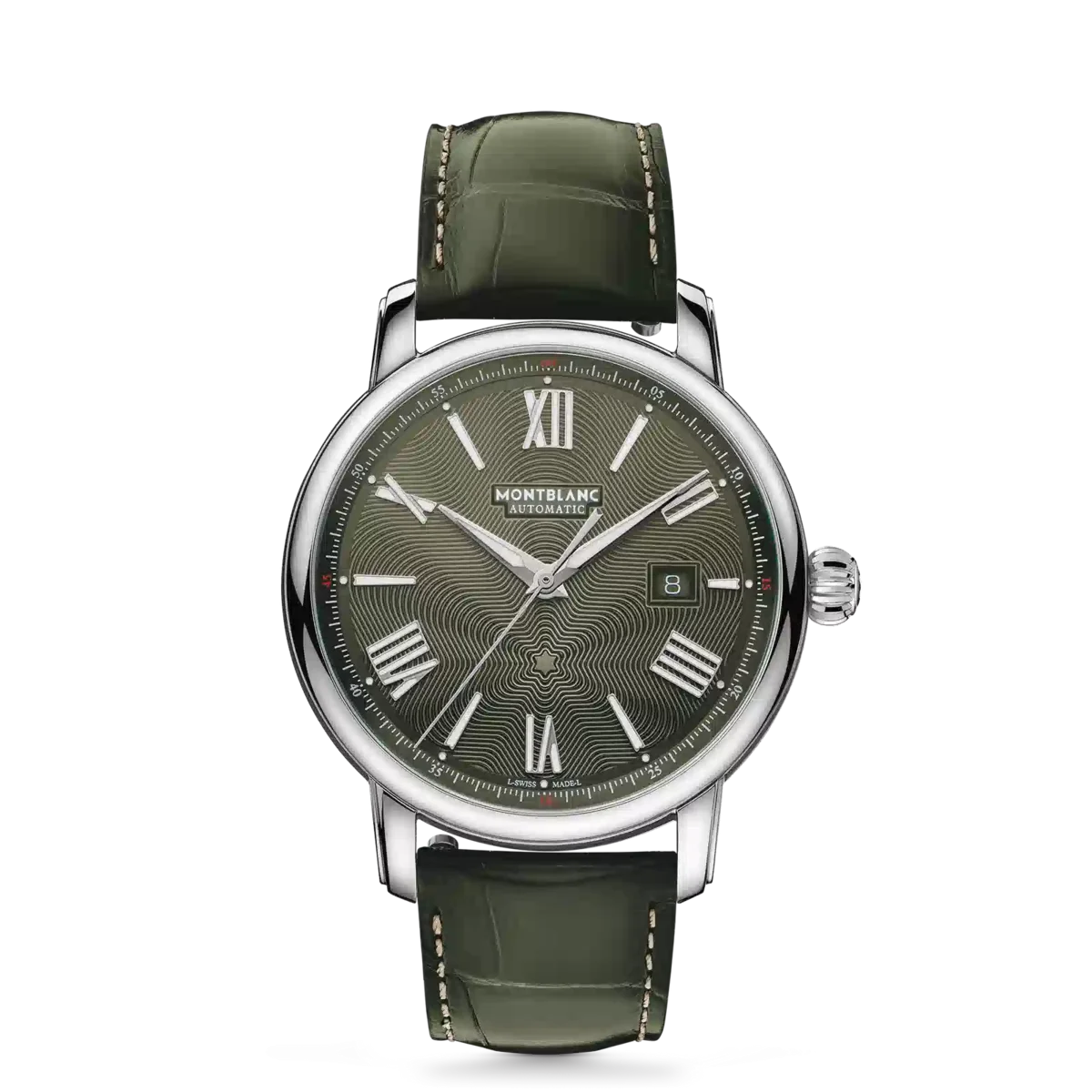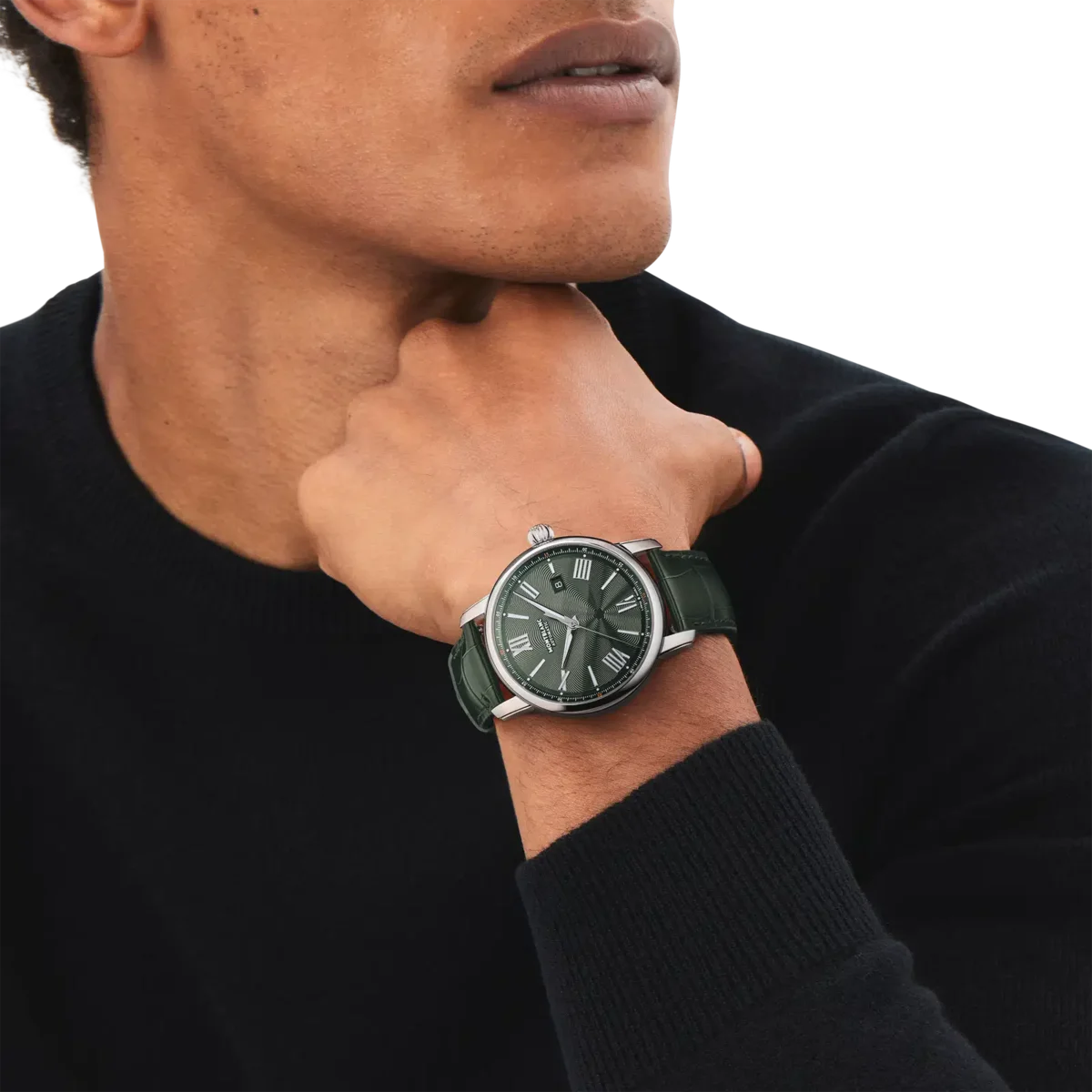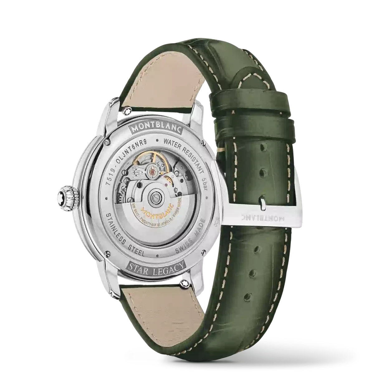 La Montblanc Star Legacy Automatic Date en édition limitée à 800 exemplaires est ornée d’un cadran vert arborant le motif étoilé caractéristique de Montblanc, ainsi que d’aiguilles et de chiffres en forme d’épée recouverts de rhodium. Elle est animée par le mouvement automatique MB 24.17 qui indique les heures, les minutes, les secondes et la date. En termes de design, cette montre s’inspire des montres de poche Minerva de la fin du XIXe et du début du XXe siècle, avec leur boîtier rond et poli en forme de galet et leur couronne en forme d’oignon. Elle est également équipée d’un bracelet interchangeable en cuir de veau vert avec imprimé alligator et coutures écrues.