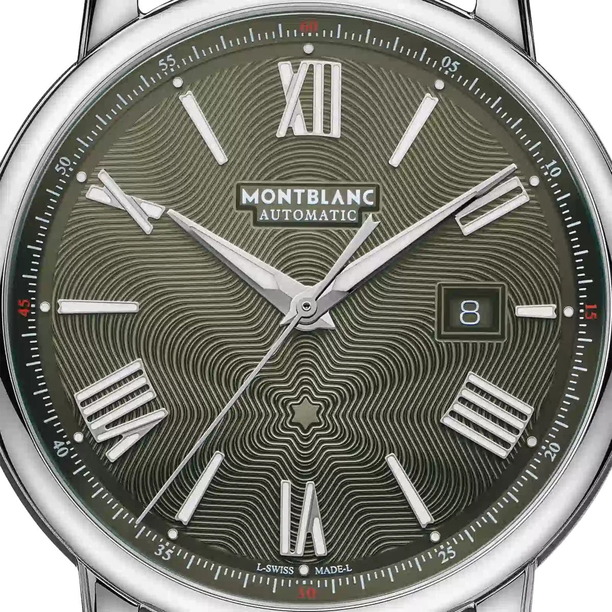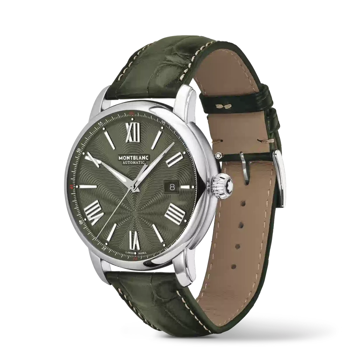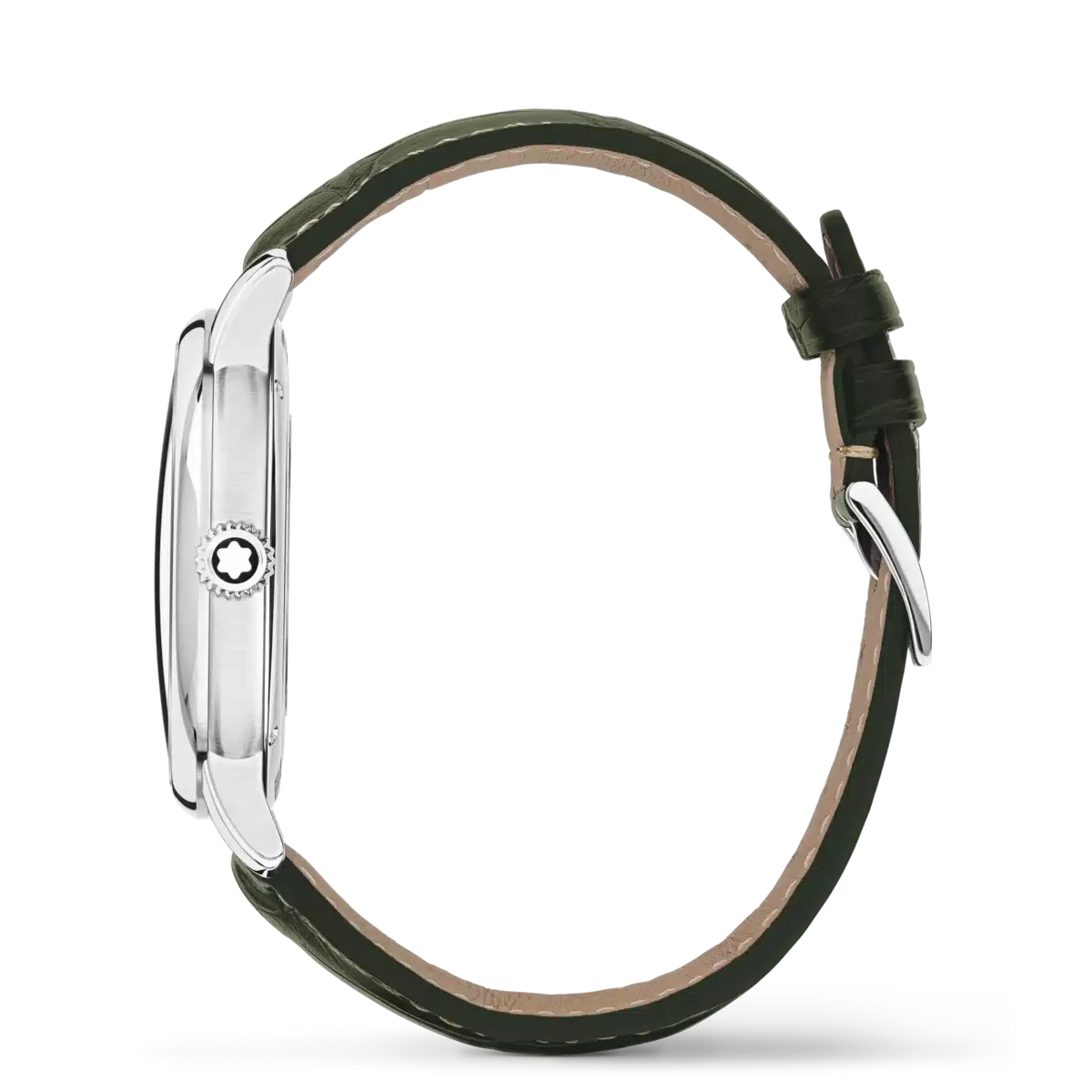 La Montblanc Star Legacy Automatic Date en édition limitée à 800 exemplaires est ornée d’un cadran vert arborant le motif étoilé caractéristique de Montblanc, ainsi que d’aiguilles et de chiffres en forme d’épée recouverts de rhodium. Elle est animée par le mouvement automatique MB 24.17 qui indique les heures, les minutes, les secondes et la date. En termes de design, cette montre s’inspire des montres de poche Minerva de la fin du XIXe et du début du XXe siècle, avec leur boîtier rond et poli en forme de galet et leur couronne en forme d’oignon. Elle est également équipée d’un bracelet interchangeable en cuir de veau vert avec imprimé alligator et coutures écrues.