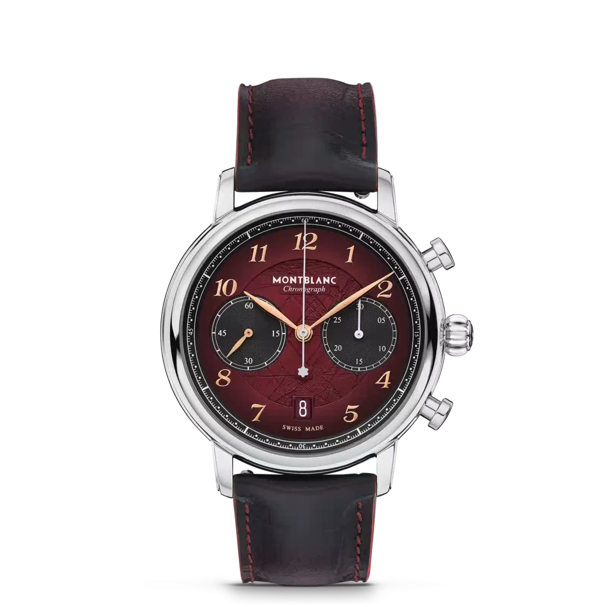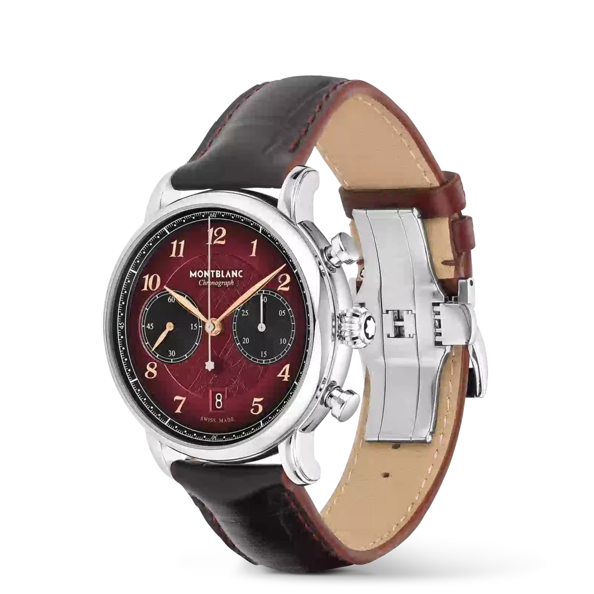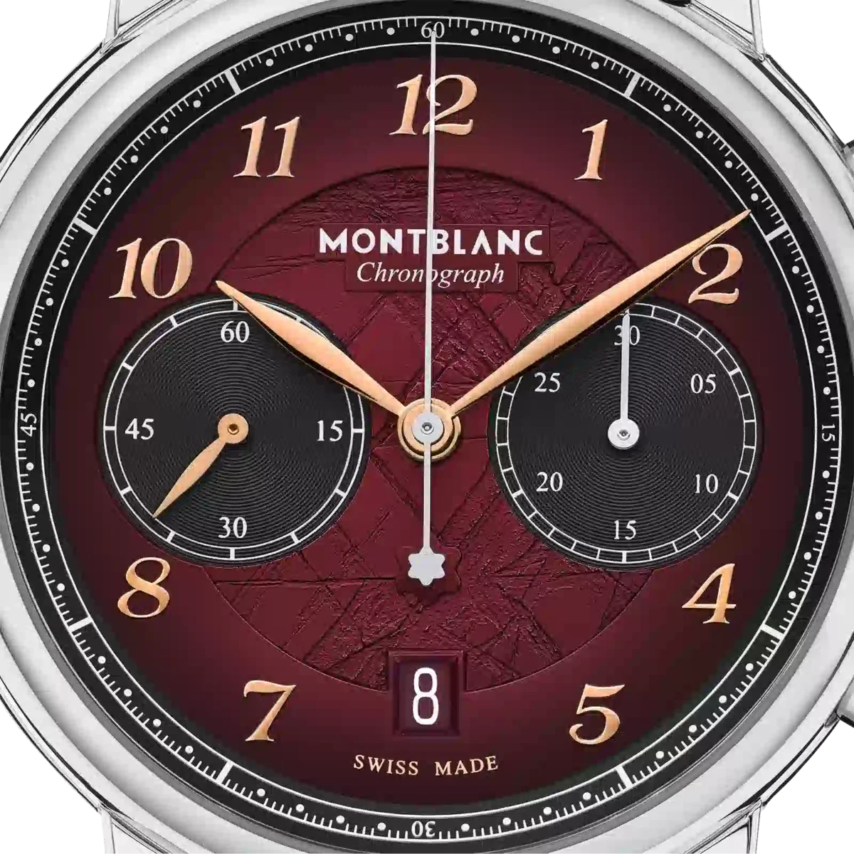 La Montblanc Star Legacy Chronograph Limited Edition, limitée à 1786 exemplaires, rend hommage à l’intrépide Jacques Balmat, qui fut le premier à atteindre le sommet du Mont Blanc en 1786. La montre présente un cadran bordeaux à motif glacier avec un effet sfumato sur le pourtour, une minuterie à crémaillère et des chiffres plaqués or rose. Les indications comprennent une aiguille centrale des secondes du chronographe avec l’emblème Montblanc sur le contrepoids et un compteur 30 minutes du chronographe avec aiguilles plaquées rhodium, tandis que les fonctions horlogères (heures, minutes et petite seconde) sont indiquées par des aiguilles plaquées or rose. Ce modèle est animé par le mouvement automatique MB 25.13 et logé dans un boîtier en acier inoxydable de 42 mm avec fond ouvert sur le mouvement. La montre est livrée avec un bracelet interchangeable en cuir de veau avec un imprimé alligator et un sfumato vertical. Numéro d’identification MB133245 Largeur de la corne 21 mm