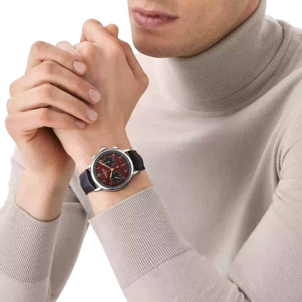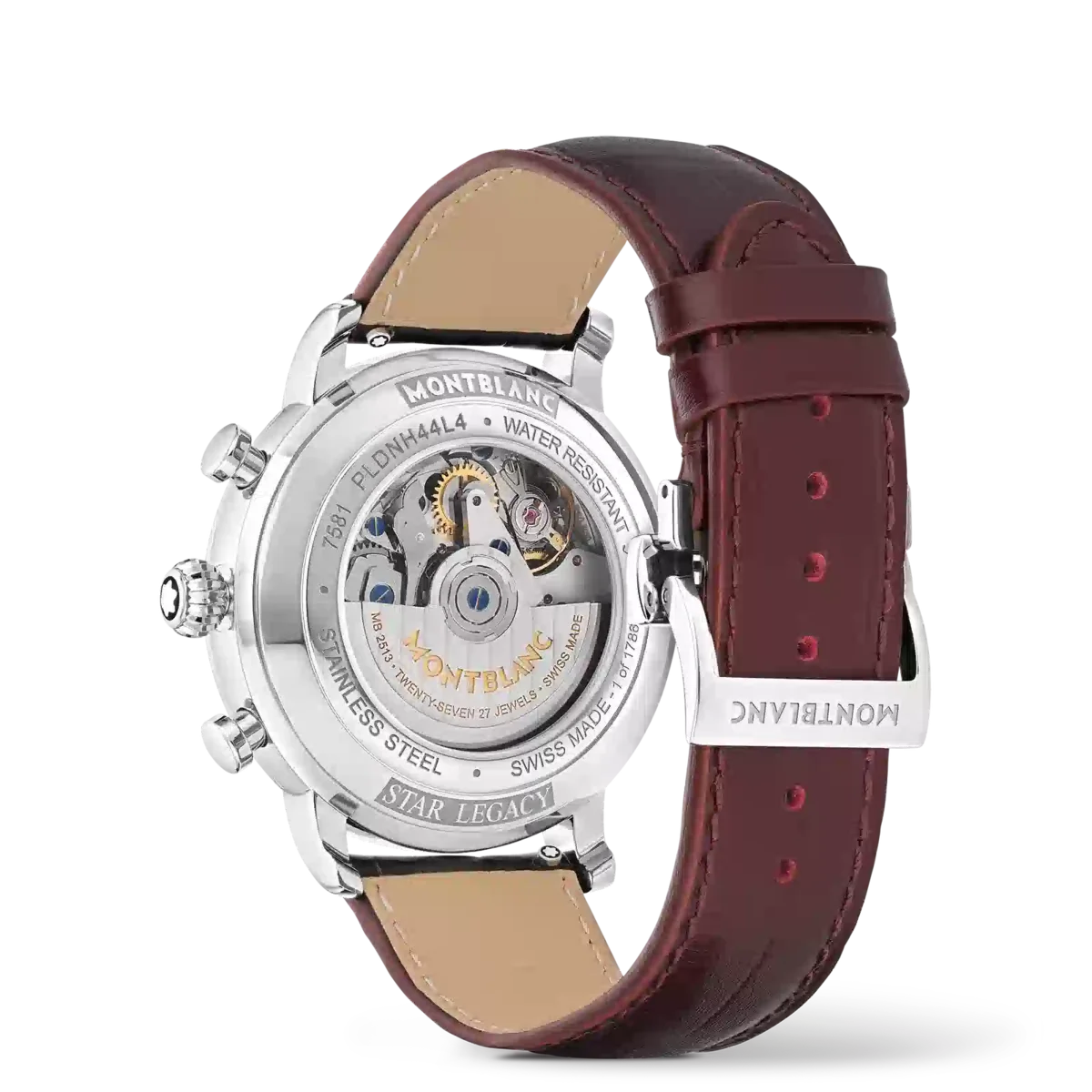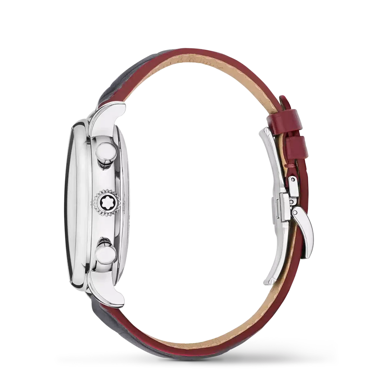 La Montblanc Star Legacy Chronograph Limited Edition, limitée à 1786 exemplaires, rend hommage à l’intrépide Jacques Balmat, qui fut le premier à atteindre le sommet du Mont Blanc en 1786. La montre présente un cadran bordeaux à motif glacier avec un effet sfumato sur le pourtour, une minuterie à crémaillère et des chiffres plaqués or rose. Les indications comprennent une aiguille centrale des secondes du chronographe avec l’emblème Montblanc sur le contrepoids et un compteur 30 minutes du chronographe avec aiguilles plaquées rhodium, tandis que les fonctions horlogères (heures, minutes et petite seconde) sont indiquées par des aiguilles plaquées or rose. Ce modèle est animé par le mouvement automatique MB 25.13 et logé dans un boîtier en acier inoxydable de 42 mm avec fond ouvert sur le mouvement. La montre est livrée avec un bracelet interchangeable en cuir de veau avec un imprimé alligator et un sfumato vertical. Numéro d’identification MB133245 Largeur de la corne 21 mm