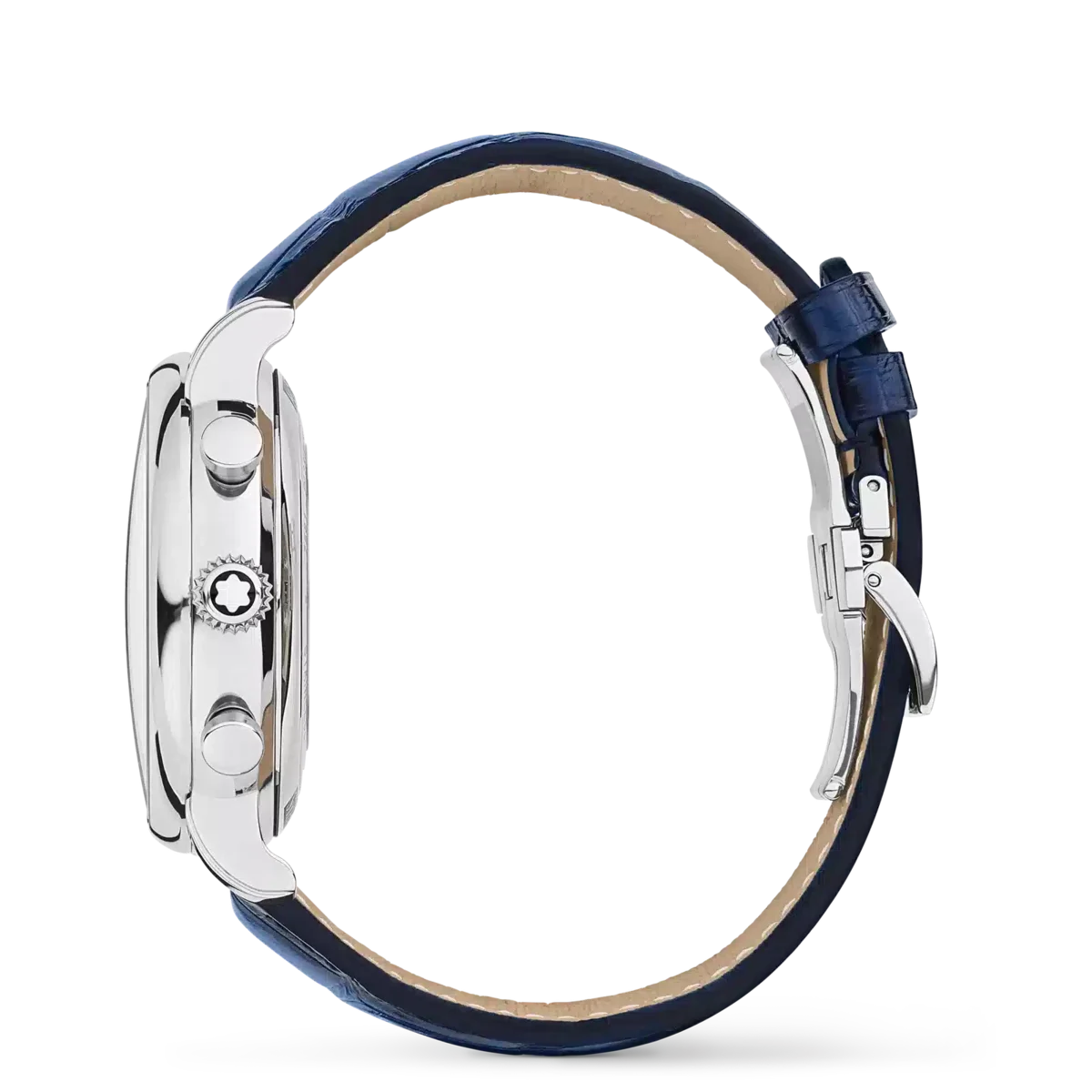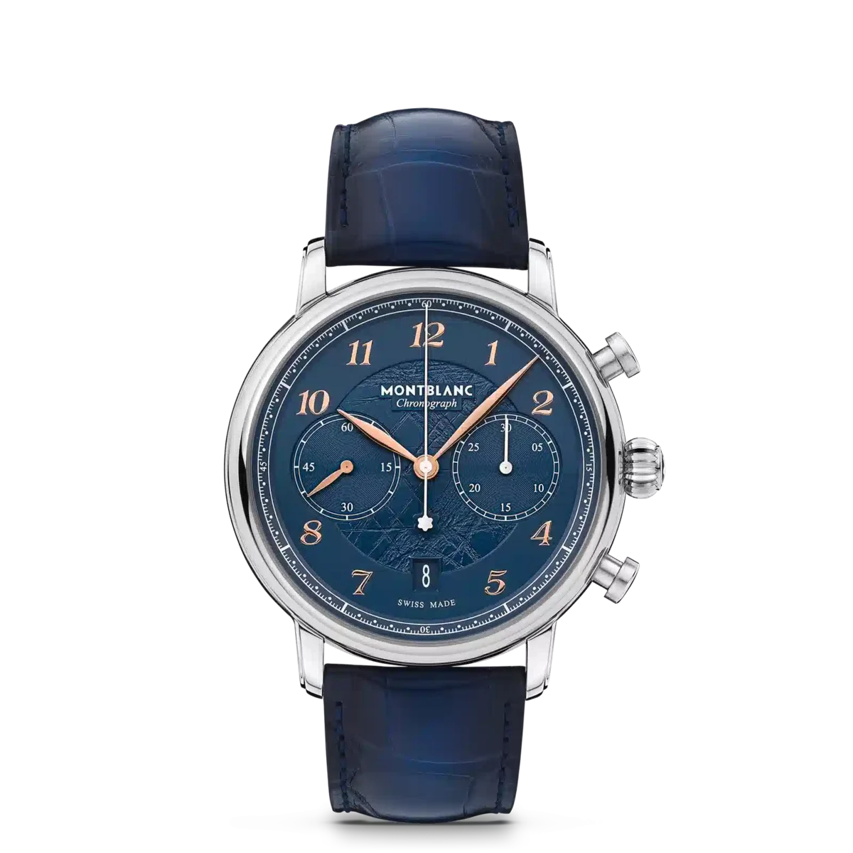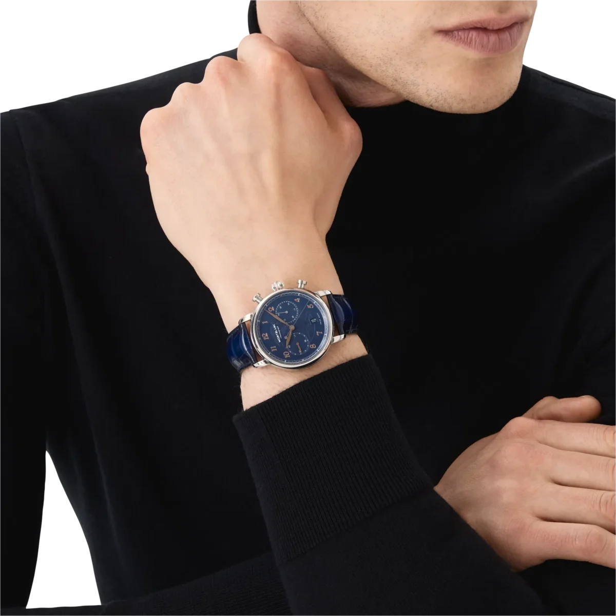 La Montblanc Star Legacy Chronograph est limitée à 1 786 exemplaires et se présente dans un boîtier en acier inoxydable de 42 mm en forme de galet, avec des chiffres arabes plaqués or rose et un cadran bleu au motif glacier qui attire le regard. Le cadran est décoré d’un motif de glace en couches inspiré de la Mer de Glace, le principal glacier du Mont-Blanc. Le centre du cadran est créé à l’aide d’un tampon spécial qui reproduit la texture de ce glacier et célèbre « l’heure bleue », moment où une nuance de bleu intense recouvre le glacier au crépuscule, lorsque la lune se lève et que les étoiles commencent à briller. C’est à cette heure de la journée que Jacques Balmat est devenu le premier homme à atteindre le sommet du Mont Blanc, à 18h23 le 7 août 1786. Les fonctions comprennent les heures, les minutes, les secondes centrales avec l’emblème Montblanc sur le contrepoids, le chronographe et la date, qui sont animées par le mouvement automatique MB 25.13 que l’on peut admirer à travers le fond en verre saphir. Les fonctions horaires sont affichées à l’aide d’aiguilles en forme de feuilles recouvertes d’or rose, tandis que les indications du chronographe utilisent des aiguilles « bâton » recouvertes de rhodium. Le garde-temps est assorti d’un bracelet en alligator bleu sfumato. Numéro d’identification MB129626 Largeur du bracelet 21 mm