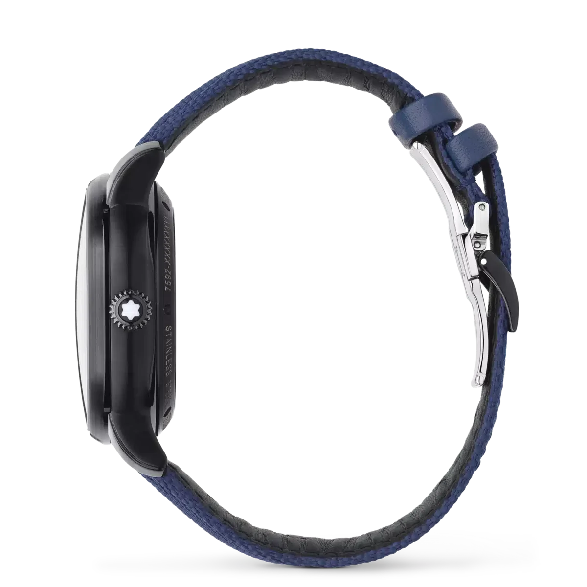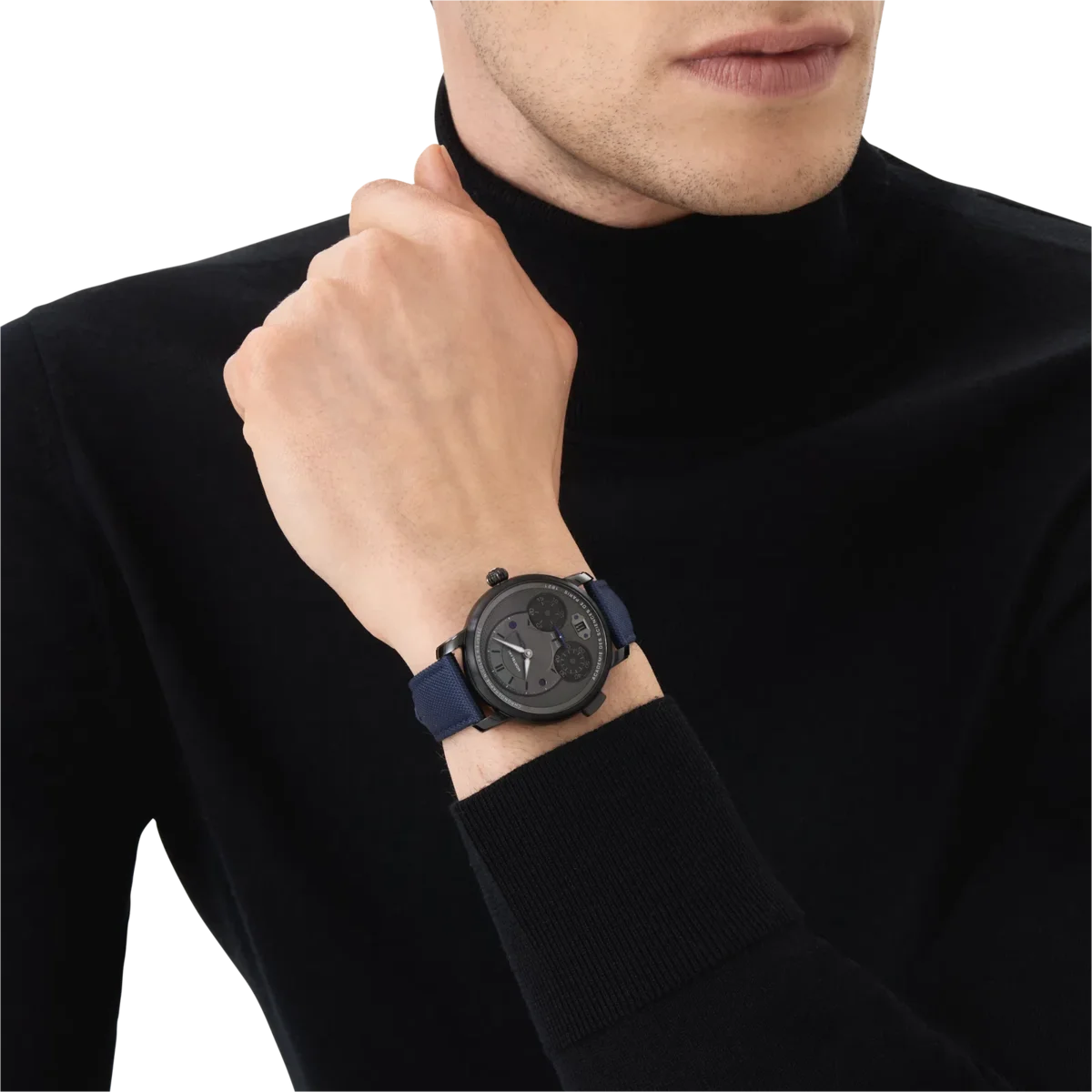 La Montblanc Star Legacy Nicolas Rieussec Chronograph 43 mm Édition limitée rend hommage à l’invention du chronographe à encre, testé pour la première fois par Nicolas Rieussec en 1821 à Paris et validé par l’Académie des sciences. Cette nouvelle version est dotée d’un boîtier en acier inoxydable de 43 mm recouvert de DLC et d’un cadran noir. Des motifs Clou de Paris, qui rappellent les rues pavées de Paris, ornent le cadran, la masse oscillante et le bracelet en textile bleu. Les fonctions comprennent un chronographe, une indication jour/nuit, un second fuseau horaire et une date. La montre est animée par le mouvement chronographe monopoussoir MB R200 Montblanc Manufacture et est limitée à 500 exemplaires. Numéro d’identification : MB129763 Largeur des cornes : 21 mm