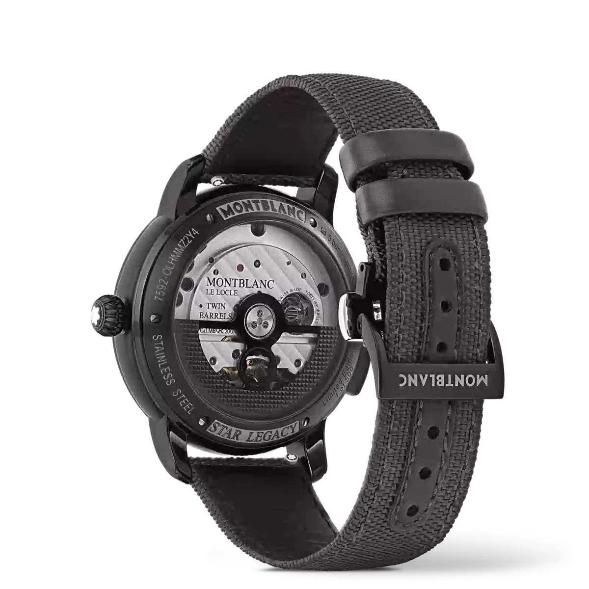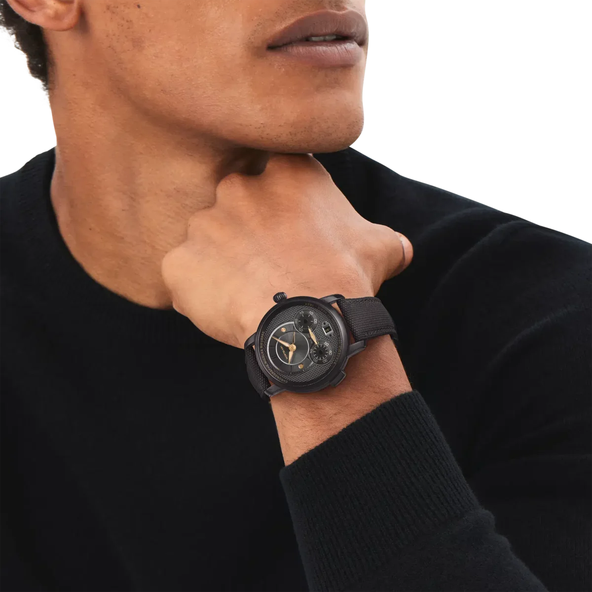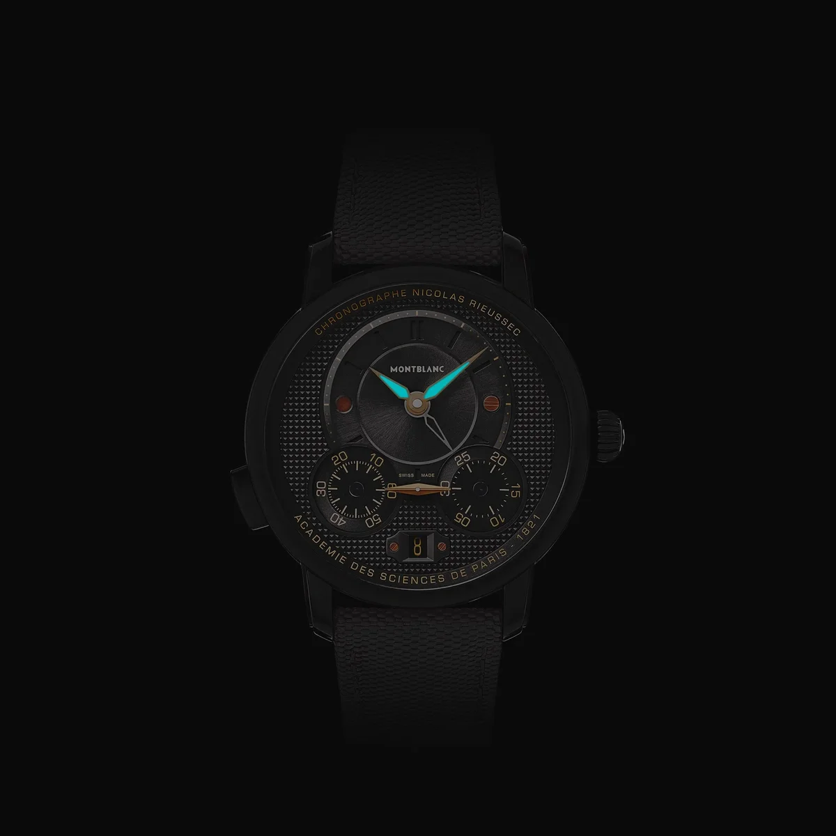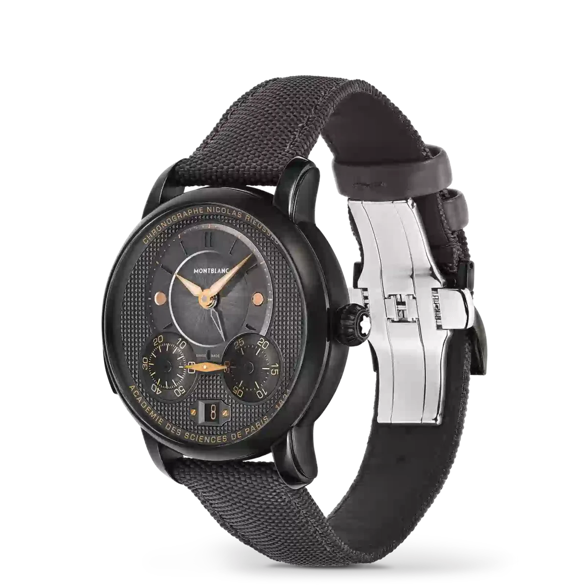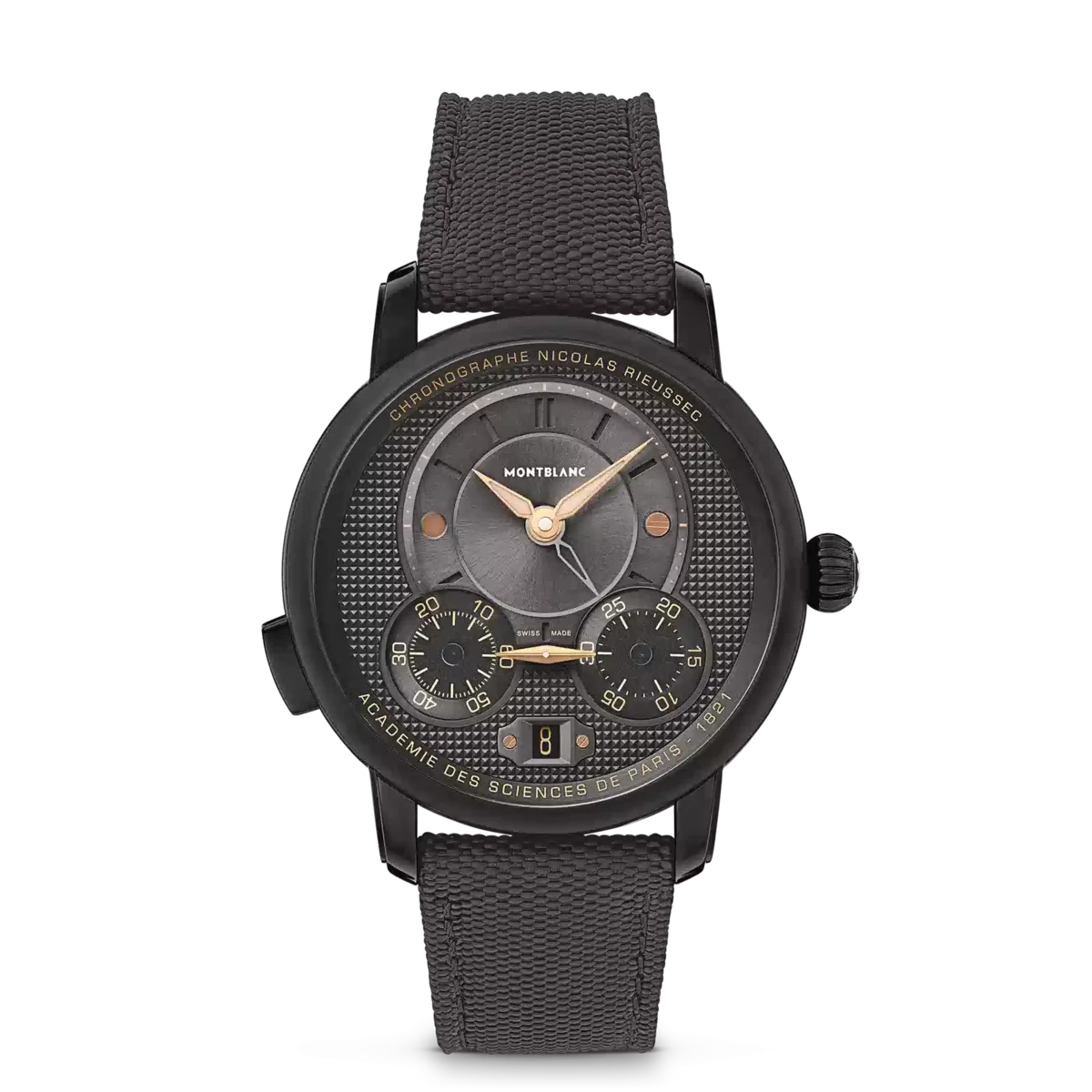 La Montblanc Star Legacy Nicolas Rieussec Monopusher Chronograph Limited Edition de 500 pièces est animée par le mouvement manufacture MB R200 et se présente dans un boîtier en acier inoxydable de 43 mm avec revêtement DLC noir, cadran anthracite, aiguilles plaquées or rose et index noirs. Ce nouveau modèle présente plusieurs détails qui renforcent le lien historique avec Paris, où l’histoire du chronographe Montblanc a commencé à l’hippodrome du Champ-de-Mars, notamment un motif Clou de Paris sur le cadran qui se prolonge sur la masse oscillante et le bracelet en textile. Ce motif, inspiré du dessin géométrique des rues pavées de Paris, fait le lien entre le passé et l’avenir de ce garde-temps.