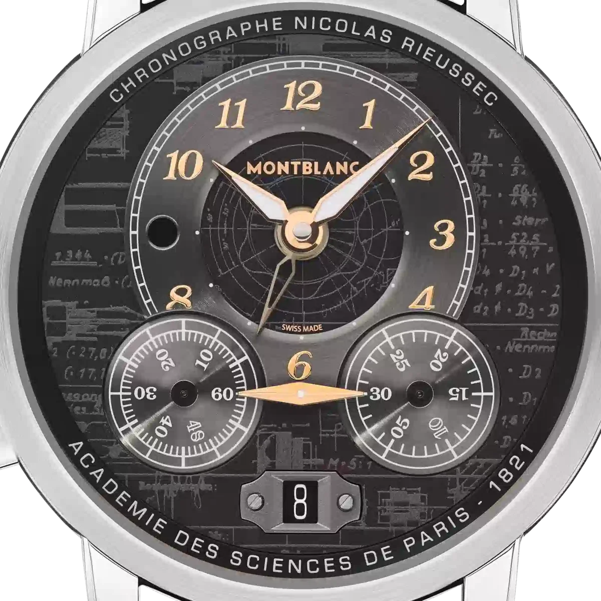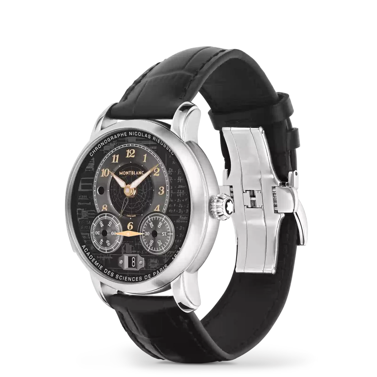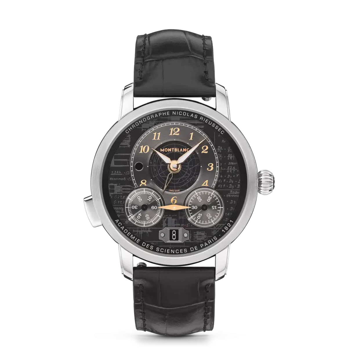 La Montblanc Star Legacy Nicolas Rieussec Chronograph célèbre les 100 ans du célèbre instrument d’écriture Meisterstück de Montblanc avec des éléments de design issus du stylo plume emblématique. Limitée à 500 exemplaires, cette montre est dotée d’un boîtier en acier inoxydable de 43 mm et d’un bracelet interchangeable en cuir de veau noir avec imprimé alligator. Le cadran noir est orné d’une impression luminescente qui révèle un plan de l’instrument d’écriture datant de 1920 et les plans du tableau des dimensions de l’emblème Montblanc enneigé que l’on trouve à l’extrémité de chaque capuchon Meisterstück et sur la couronne des montres Montblanc. Le chiffre 4810, intrinsèquement lié à Meisterstück, figure également sur le cadran, au-dessus des deux disques chronographes bombés rotatifs. Les nombreuses touches dorées du cadran, associées à l’acier inoxydable du boîtier, rappellent également le design bicolore de la plume Meisterstück. En retournant le garde-temps, on peut observer à travers le fond du boîtier la masse oscillante du mouvement chronographe monopoussoir MB R200 de la manufacture, qui rend hommage à l’écriture manuscrite avec un délicat 8, symbole inspiré des mouvements calligraphiques.