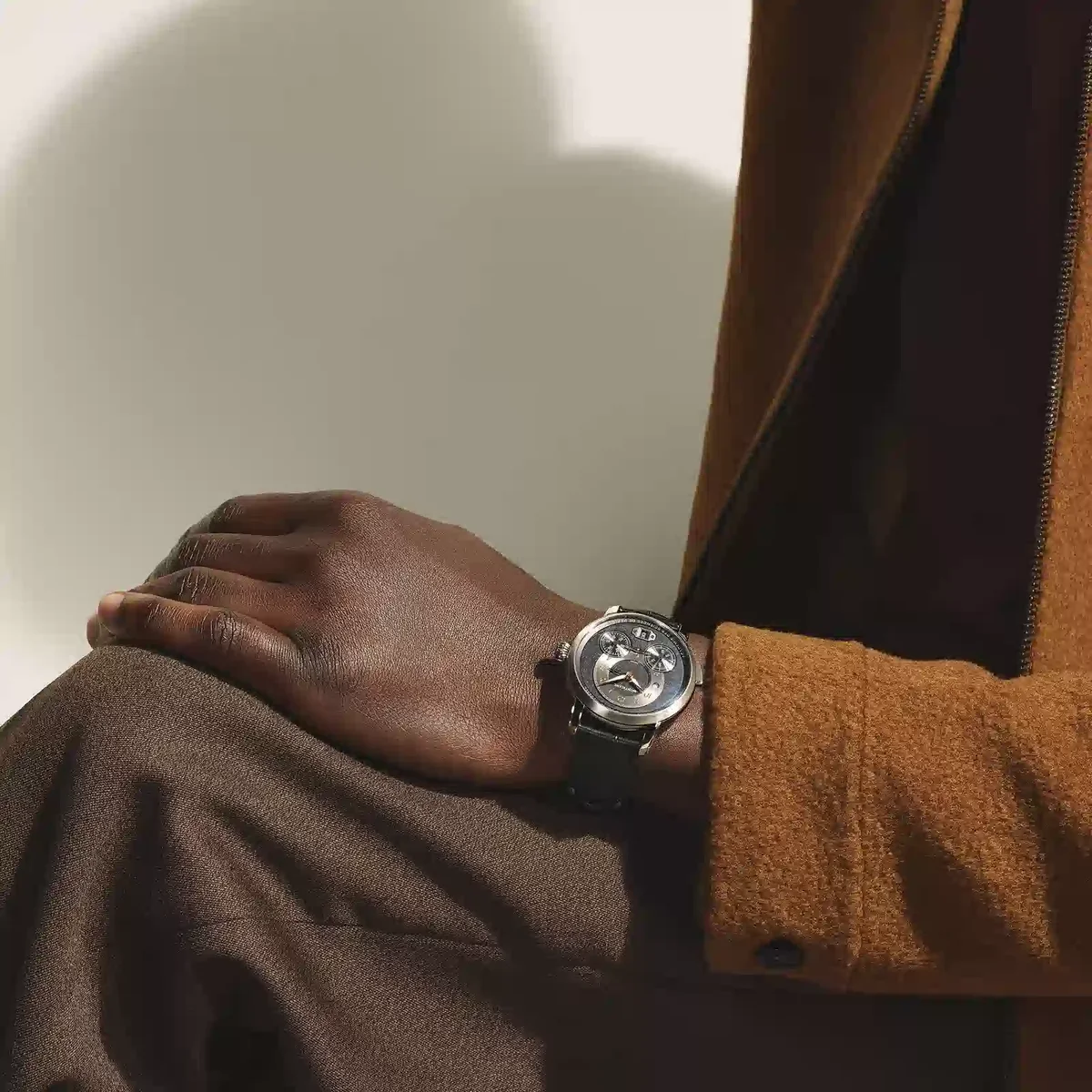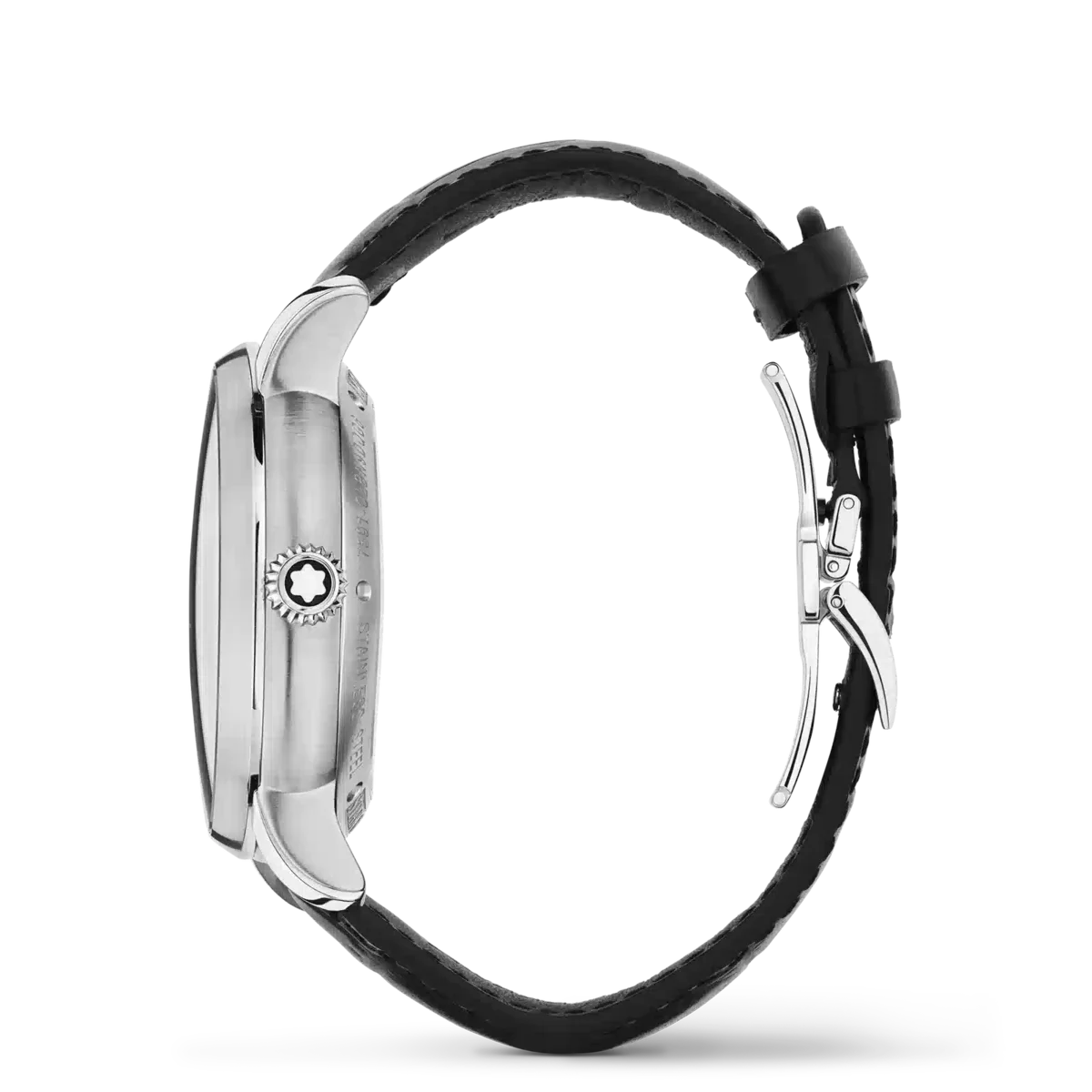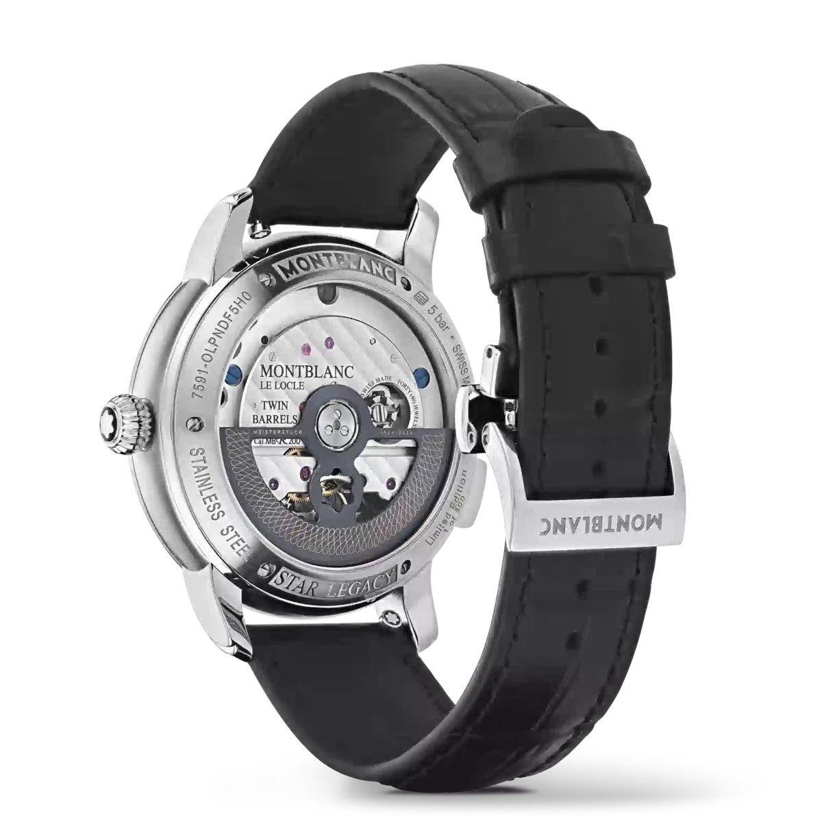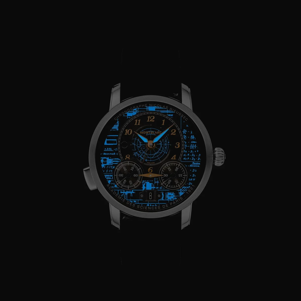 La Montblanc Star Legacy Nicolas Rieussec Chronograph célèbre les 100 ans du célèbre instrument d’écriture Meisterstück de Montblanc avec des éléments de design issus du stylo plume emblématique. Limitée à 500 exemplaires, cette montre est dotée d’un boîtier en acier inoxydable de 43 mm et d’un bracelet interchangeable en cuir de veau noir avec imprimé alligator. Le cadran noir est orné d’une impression luminescente qui révèle un plan de l’instrument d’écriture datant de 1920 et les plans du tableau des dimensions de l’emblème Montblanc enneigé que l’on trouve à l’extrémité de chaque capuchon Meisterstück et sur la couronne des montres Montblanc. Le chiffre 4810, intrinsèquement lié à Meisterstück, figure également sur le cadran, au-dessus des deux disques chronographes bombés rotatifs. Les nombreuses touches dorées du cadran, associées à l’acier inoxydable du boîtier, rappellent également le design bicolore de la plume Meisterstück. En retournant le garde-temps, on peut observer à travers le fond du boîtier la masse oscillante du mouvement chronographe monopoussoir MB R200 de la manufacture, qui rend hommage à l’écriture manuscrite avec un délicat 8, symbole inspiré des mouvements calligraphiques.