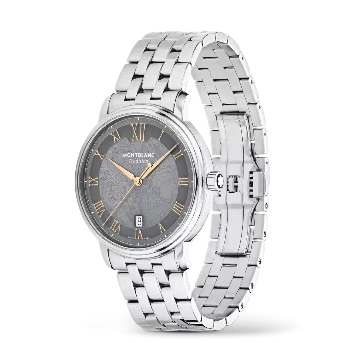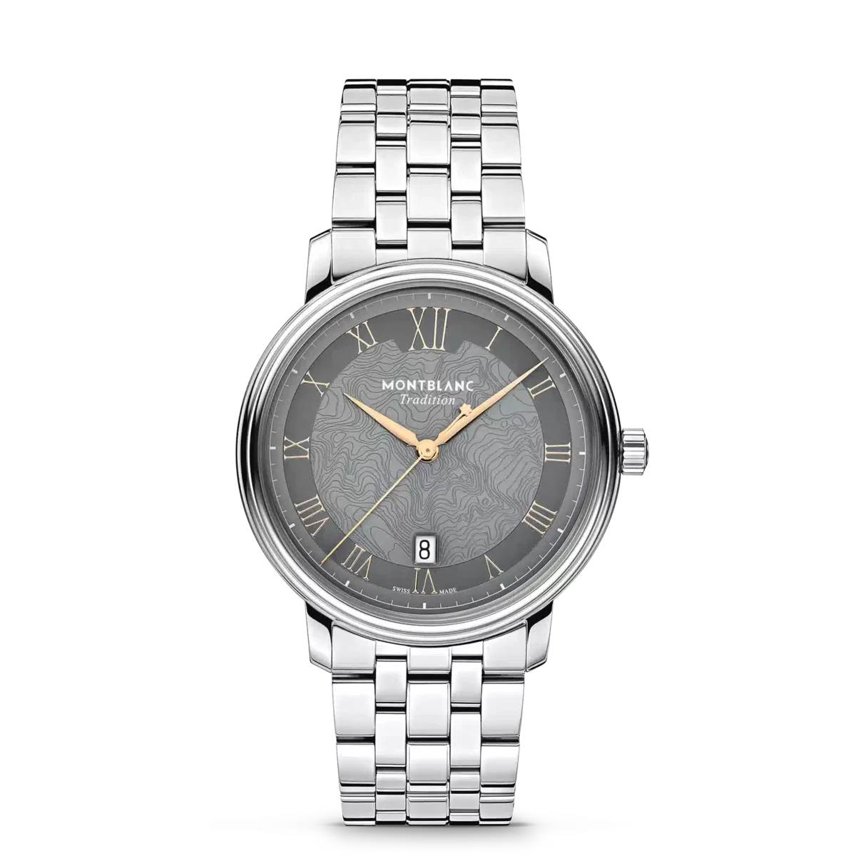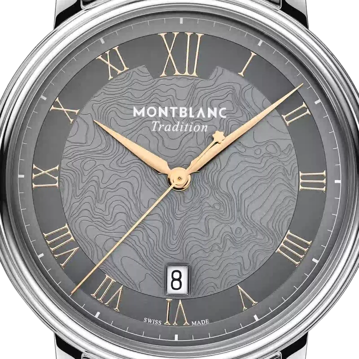 La Montblanc Tradition Automatic Date est dotée d’un boîtier en acier inoxydable de 40 mm avec cornes droites et lunette double. Le cadran gris représente la topographie du Mont Blanc avec des chiffres romains couleur or rose et un « XII » romain proéminent. Les aiguilles des heures et des minutes en forme d’épée, la trotteuse et la couronne ornées de l’emblème Montblanc, ainsi que le bracelet interchangeable en acier inoxydable, complètent son apparence contemporaine et élégante.