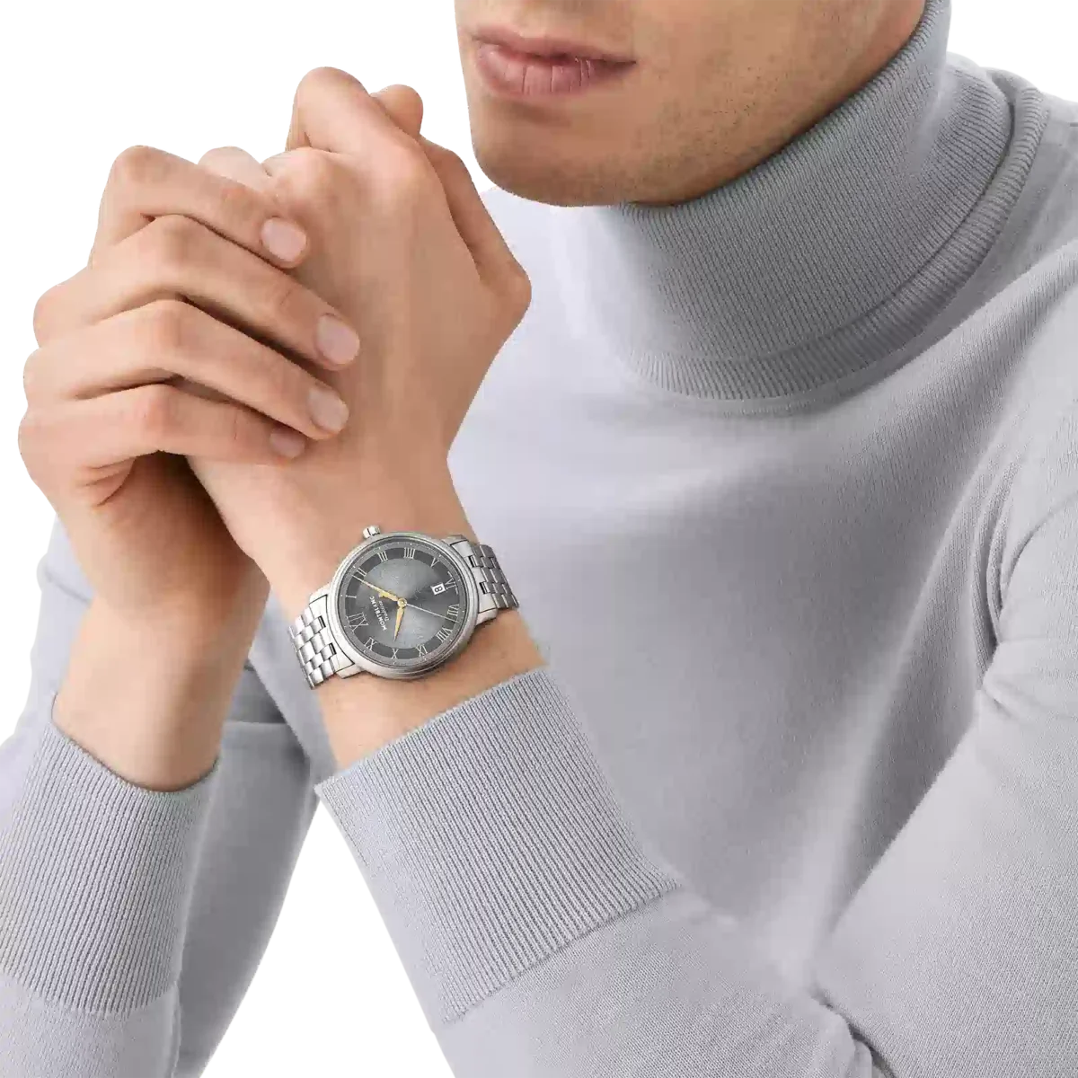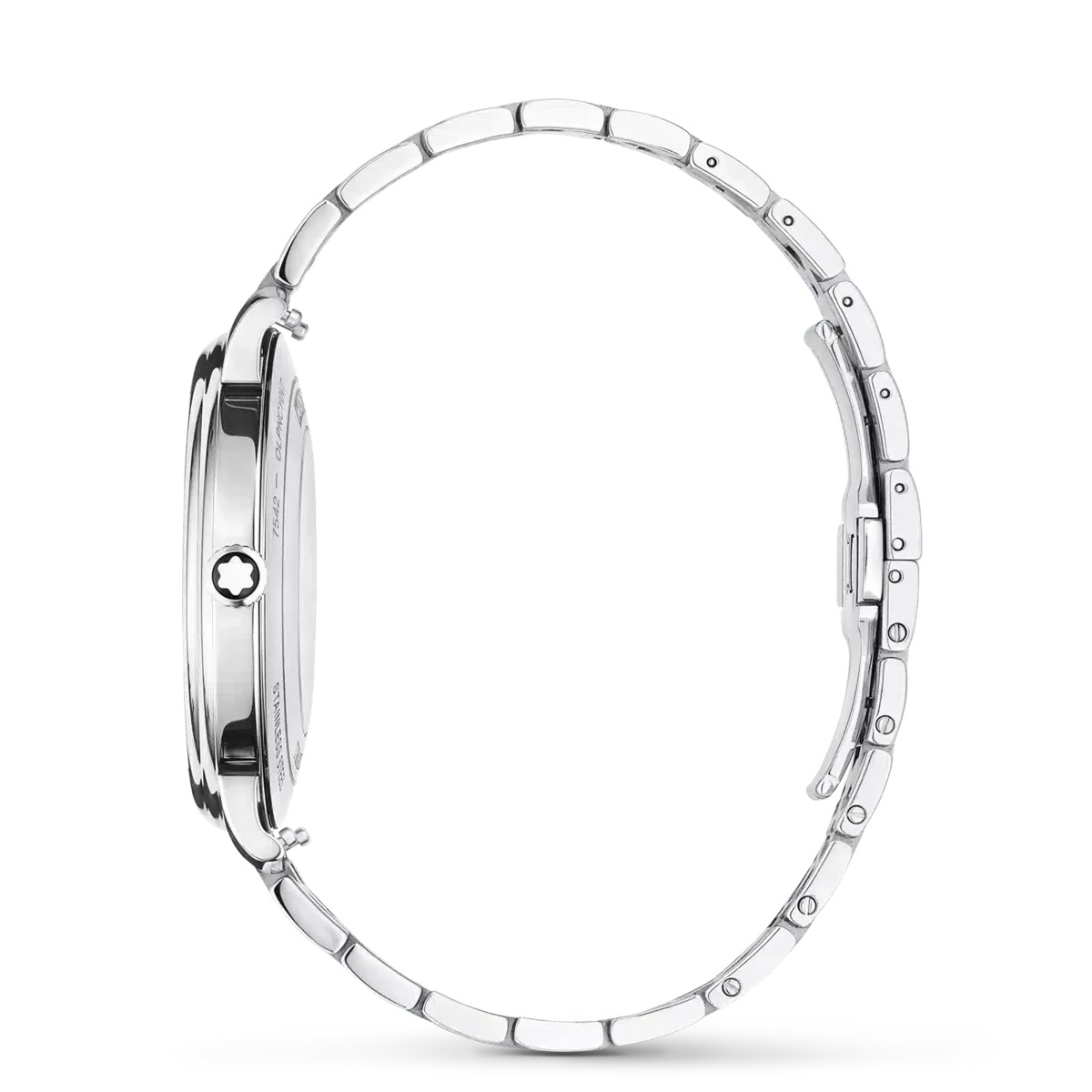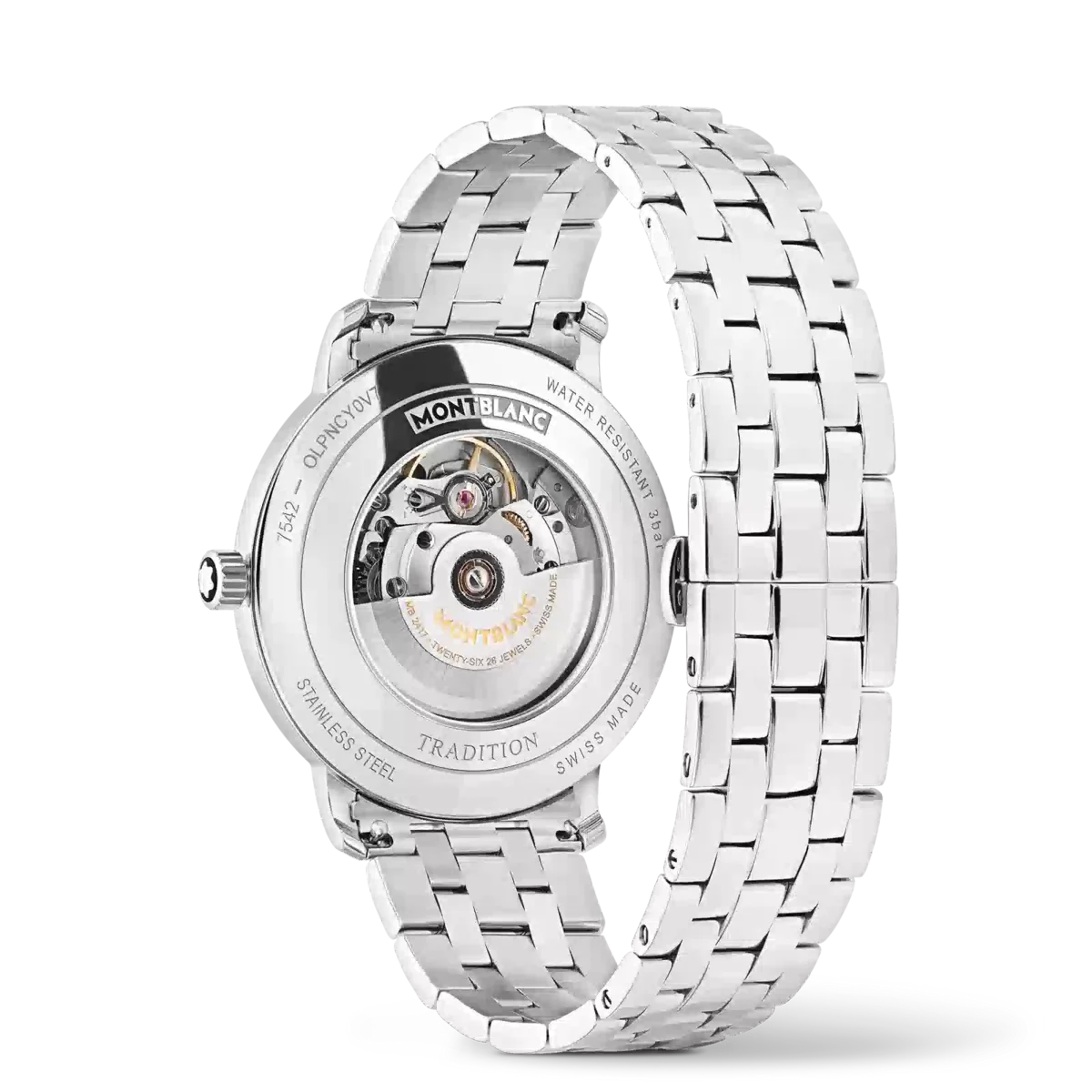 La Montblanc Tradition Automatic Date est dotée d’un boîtier en acier inoxydable de 40 mm avec cornes droites et lunette double. Le cadran gris représente la topographie du Mont Blanc avec des chiffres romains couleur or rose et un « XII » romain proéminent. Les aiguilles des heures et des minutes en forme d’épée, la trotteuse et la couronne ornées de l’emblème Montblanc, ainsi que le bracelet interchangeable en acier inoxydable, complètent son apparence contemporaine et élégante.