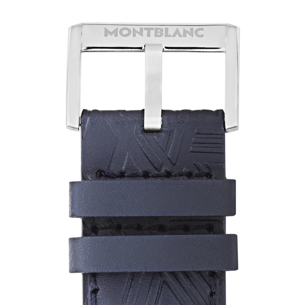 Découvrez tous les détails du bracelet en cuir de veau bleu avec boucle ardillon grise. Achetez en ligne sur la boutique officielle Montblanc.