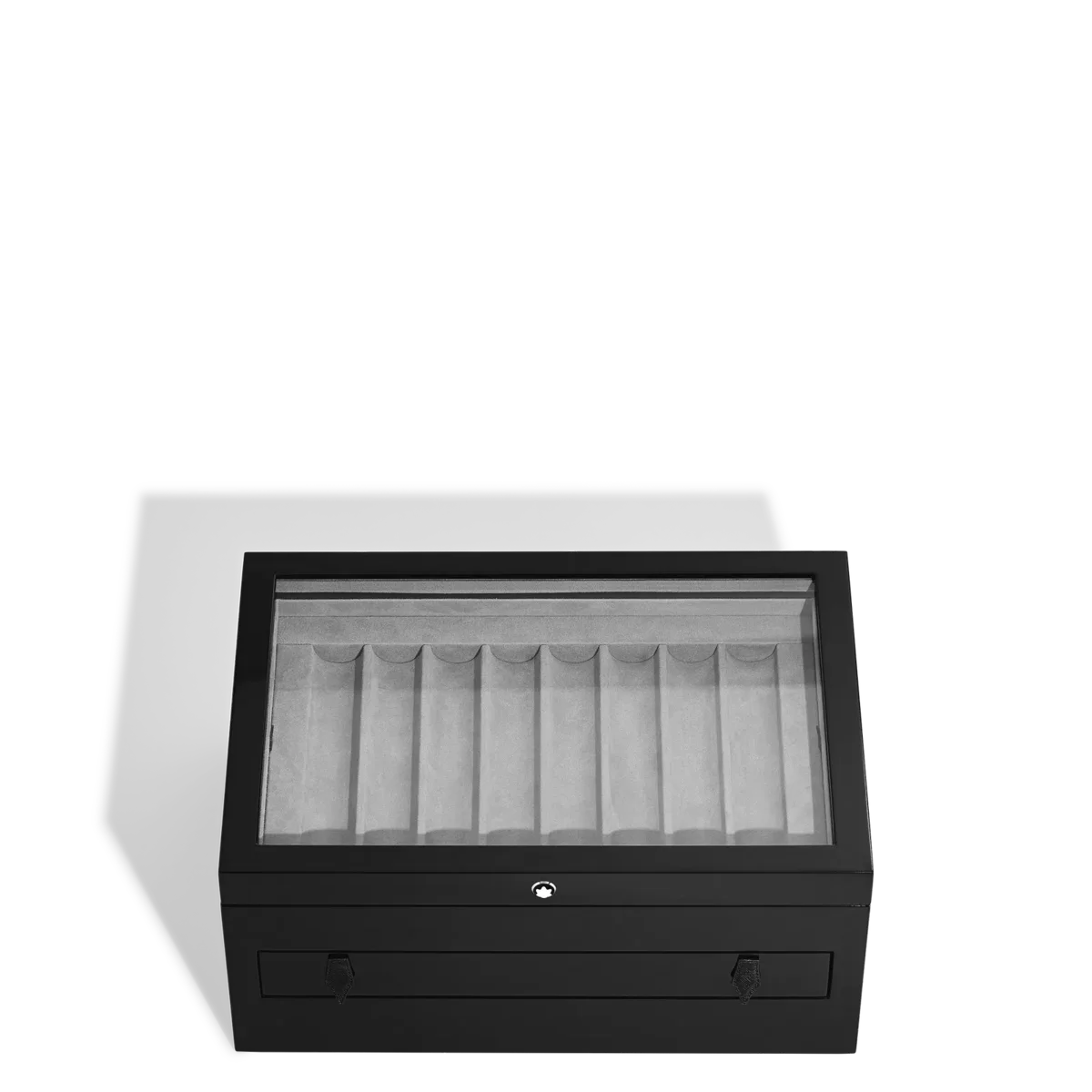 Coffret de collection Montblanc en bois et laque noire avec doublure en daim beige. Il peut contenir jusqu’à 24 instruments d’écriture dans 3 compartiments.