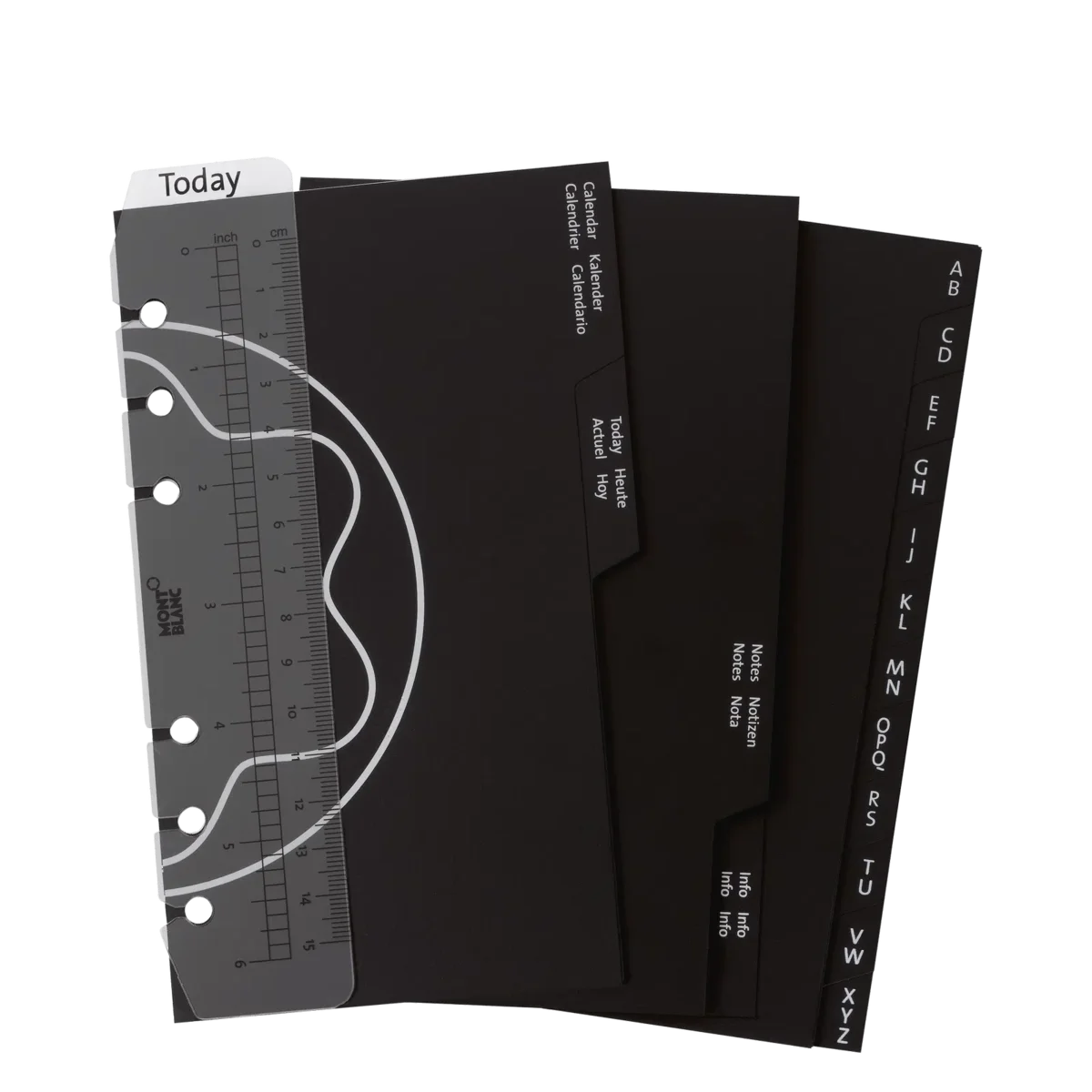 Ensemble comprenant des intercalaires, une règle et une pochette en plastique transparent pour l’agenda Montblanc moyen.